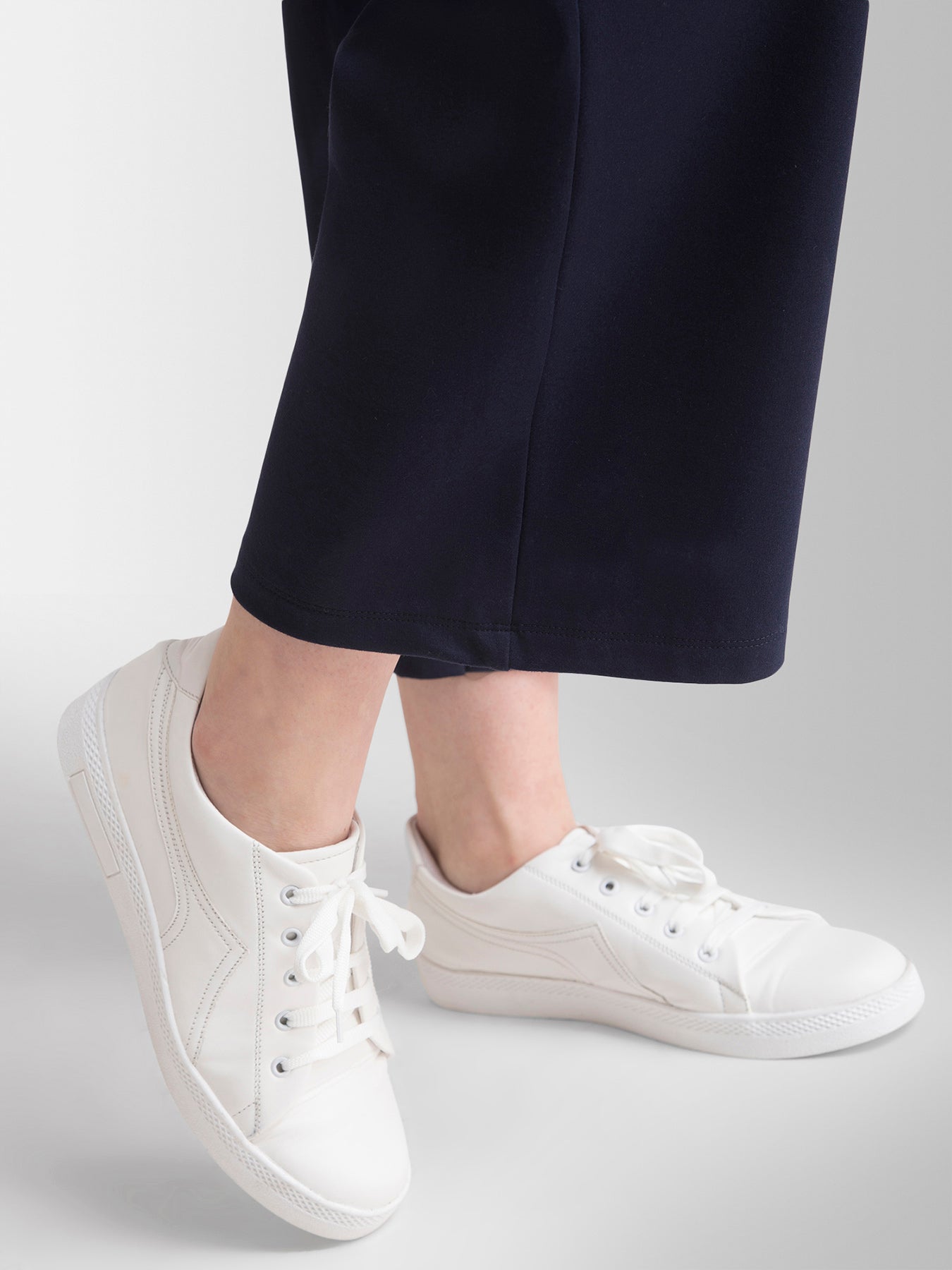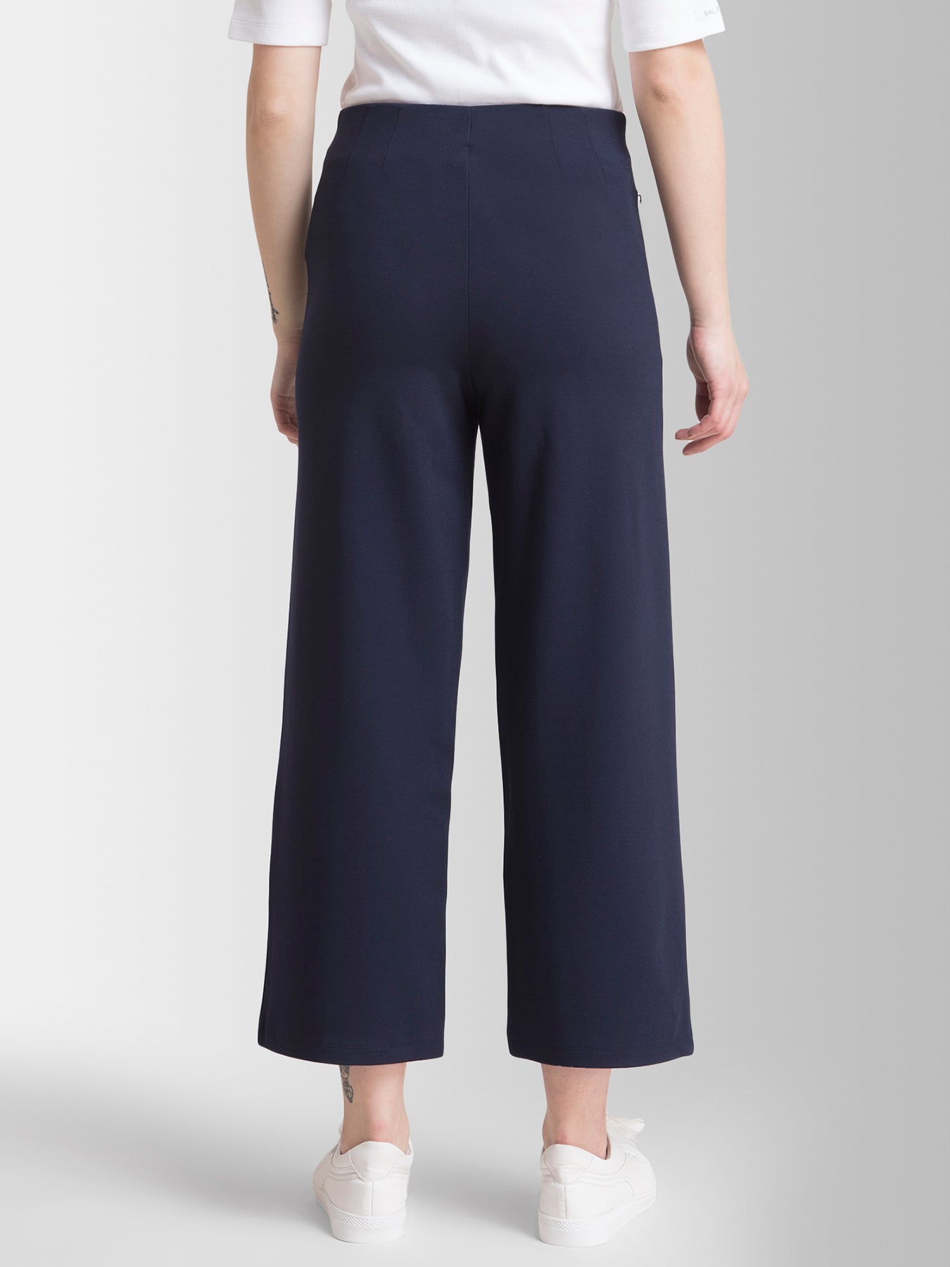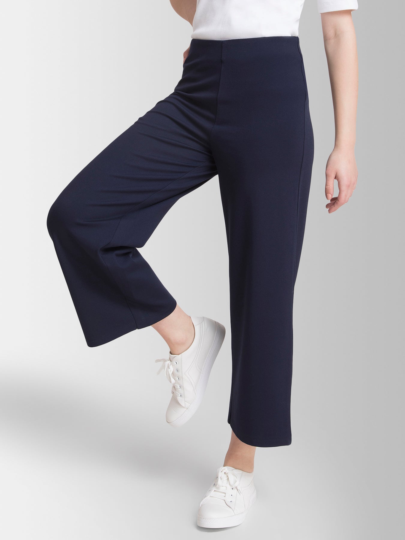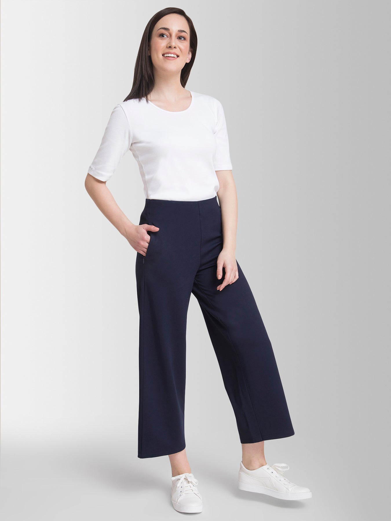 These trademark, navy blue, knitted, culottes are high-rise, have a pocket, tape detail with an inspirational quote "Phenomenal Woman" to motivate you and concealed zip for closure. A Nylon Rayon knit blend, these are breathable, stretchable, comfortable, anti-wrinkle and anti-pill. The hem of the culottes is intended to fall according to the image on a height of 5'3" to 5'5". Colour may vary slightly according to screen settings and resolution. SKU: KNTR094NAVY