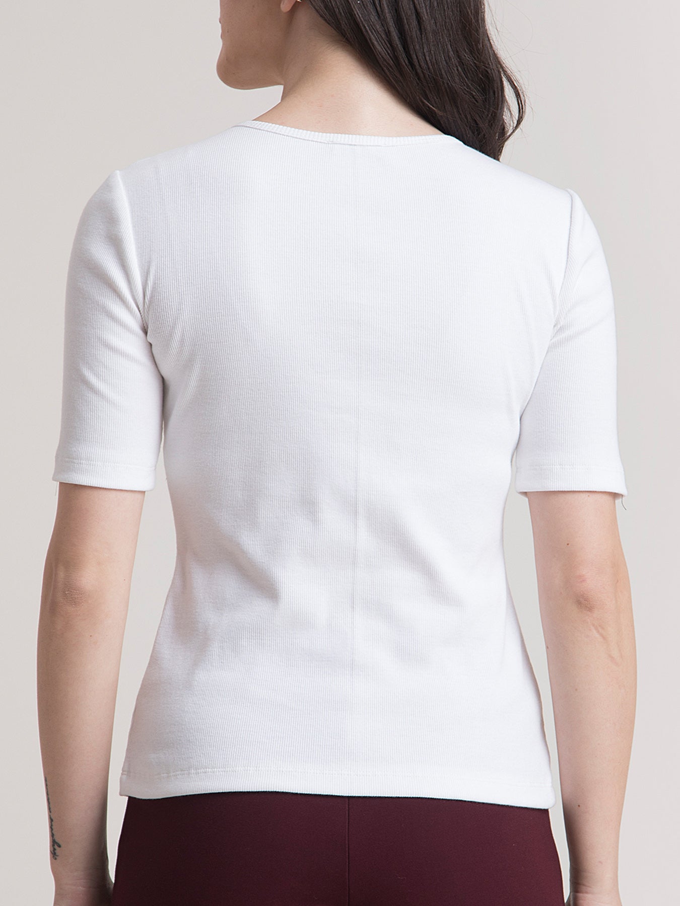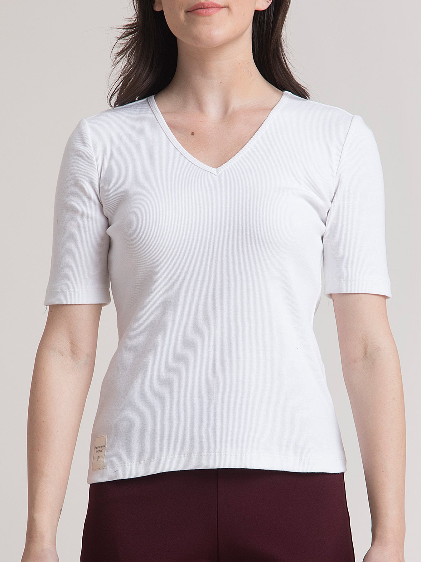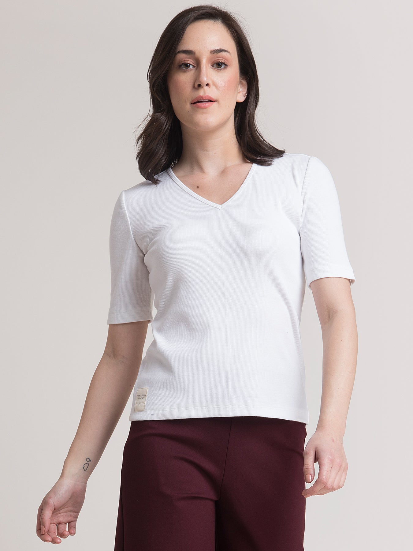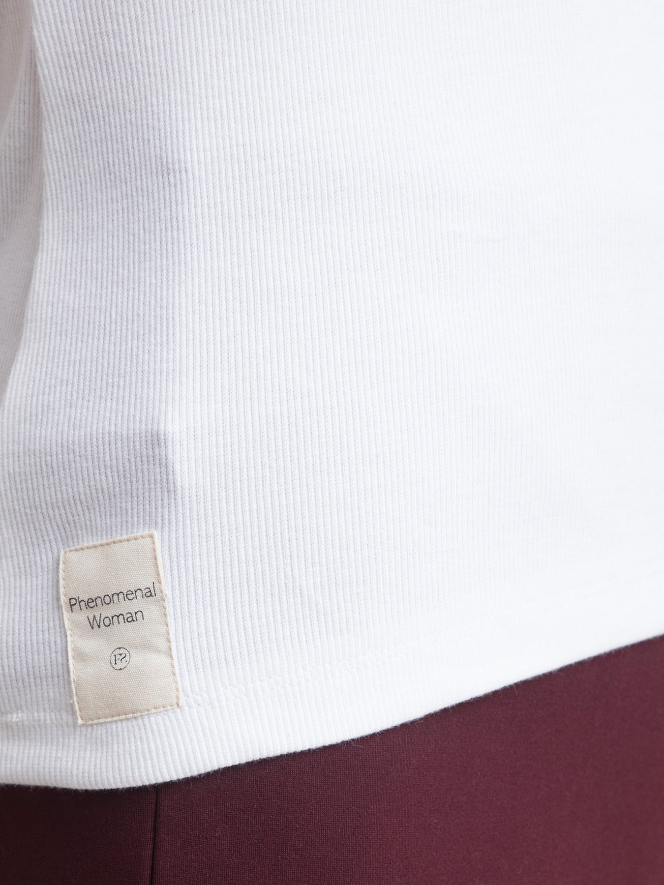 This trademark, white, slim fit, knitted T-shirt has a V neck, tape detail with an inspirational quote "Phenomenal Woman" to motivate you and short sleeves. Made from 2*1 Cotton Rib knit, it is breathable, stretchable, comfortable, anti-wrinkle and anti-pill.