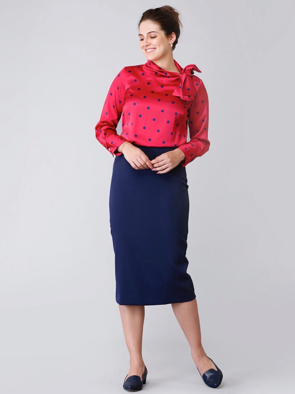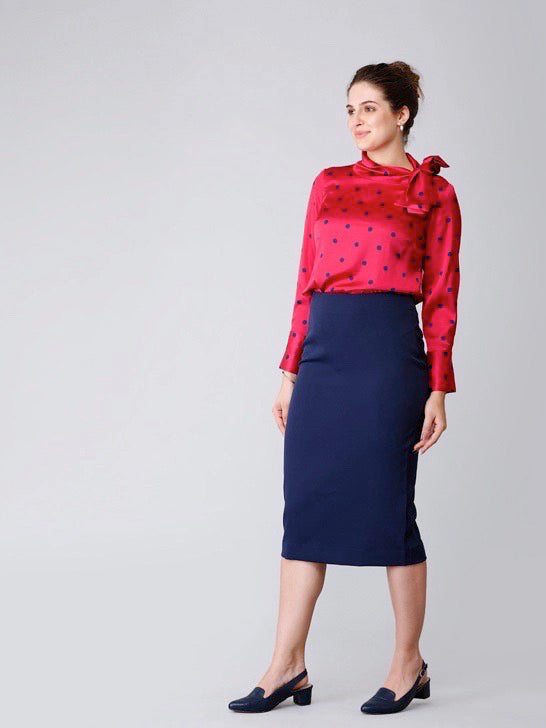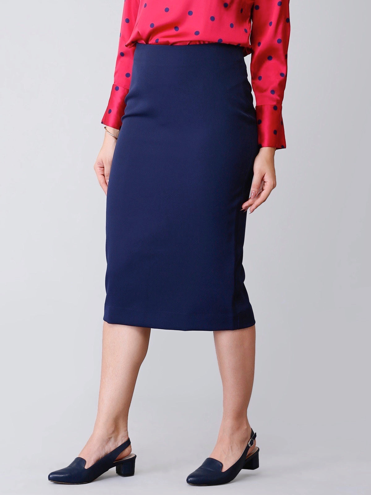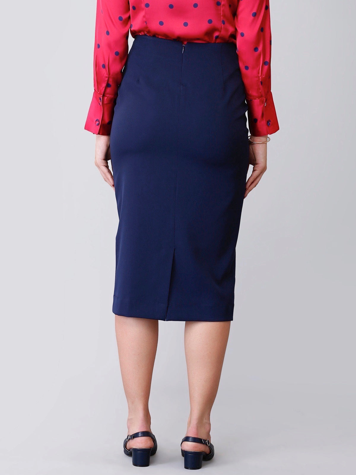 Made from hand-washable and anti-wrinkle poly marina, this midi skirt is your ideal pick on wintry work days. It falls below the knee and features a slit at the back which is as chic as convenient. It has an old-world, sophisticated charm which looks elegant at the work space. It comes with a concealed zip on the side for you to slip in and out easy and spacious pockets for your basic needs.