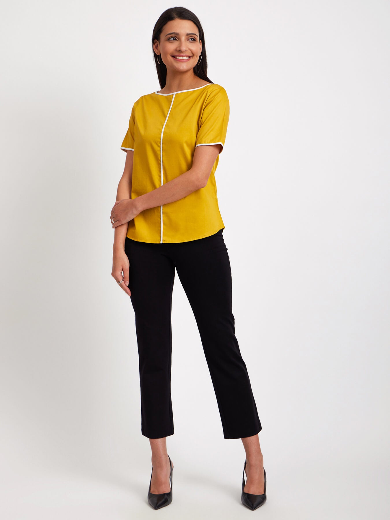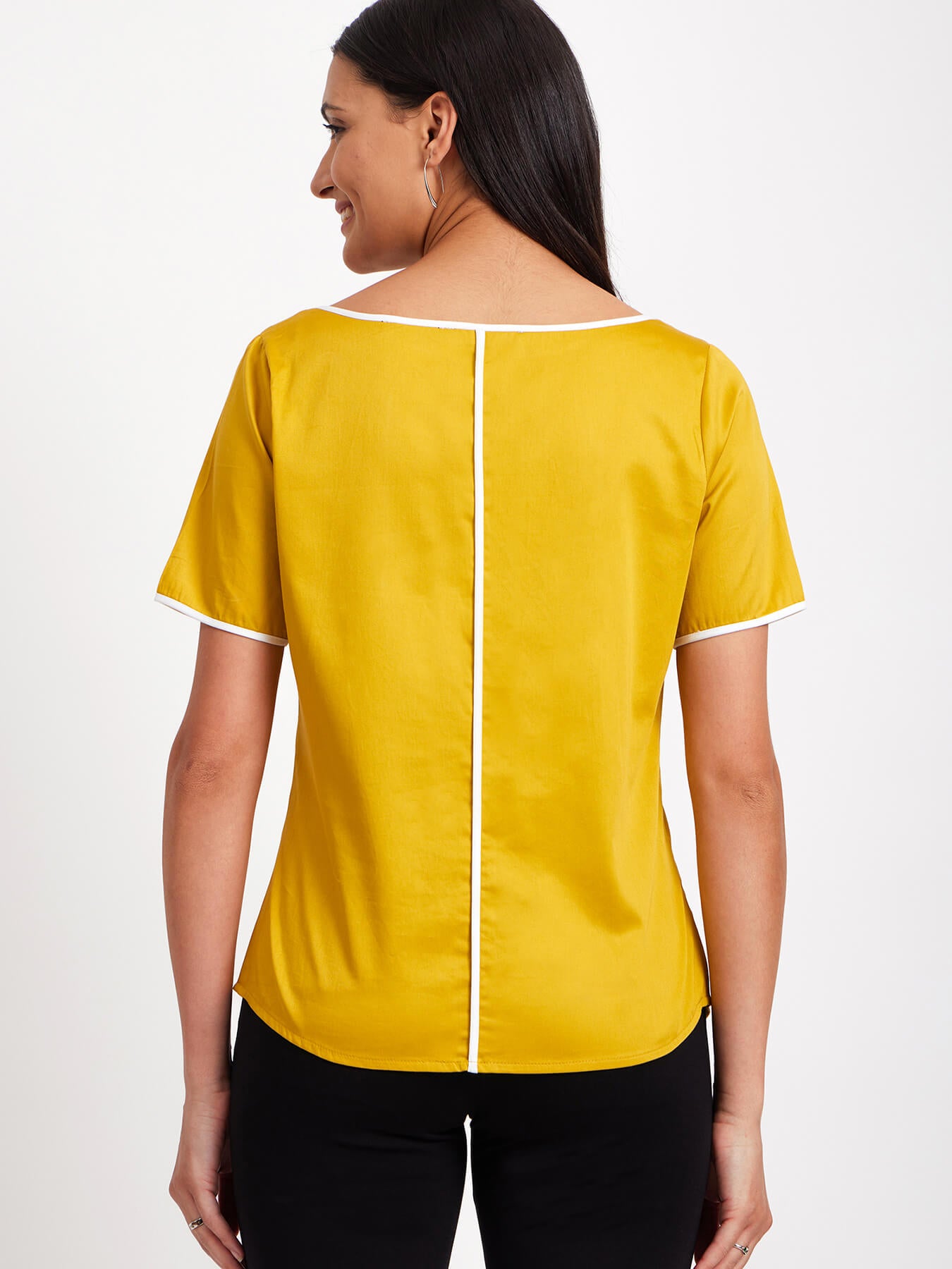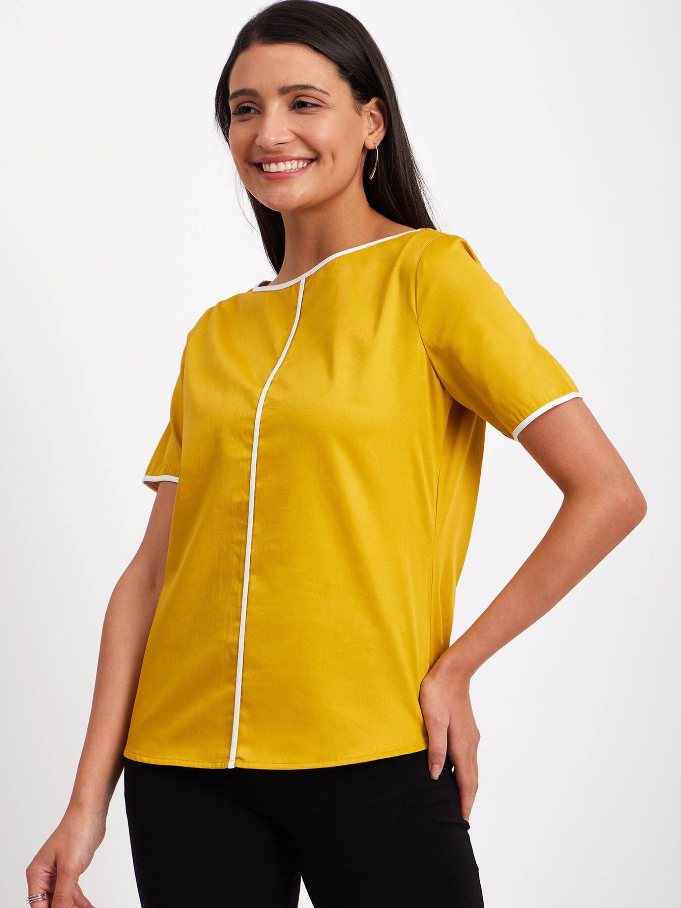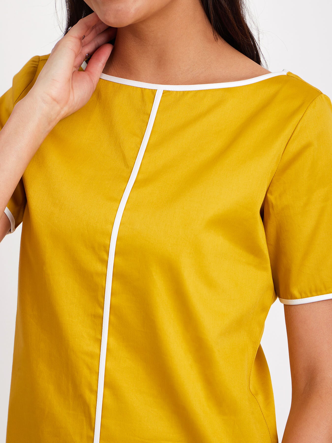 This mustard and white top has a boat neck, short sleeves and colour block detail. Made from Cotton Satin, it is soft and breathable to wear.