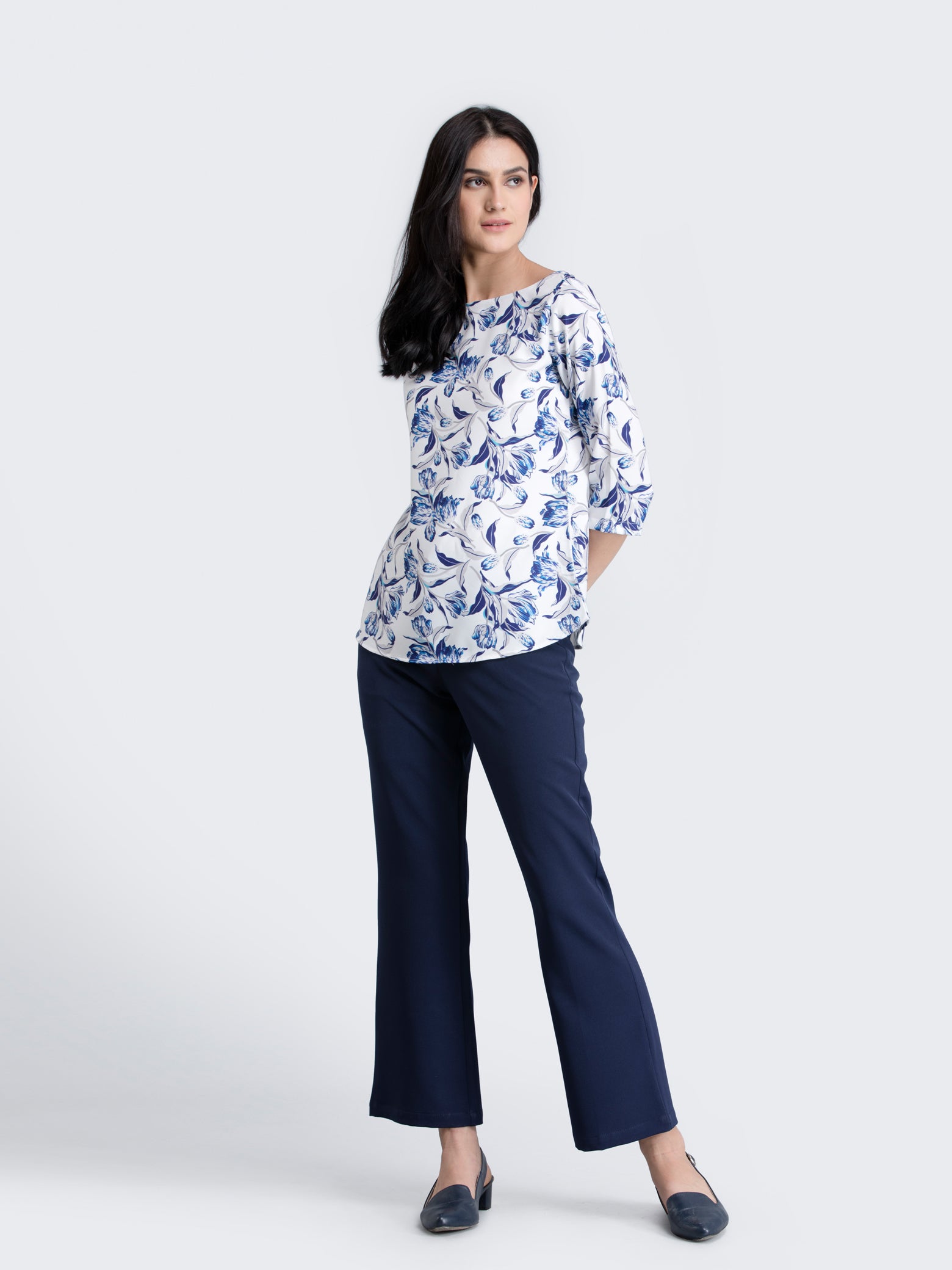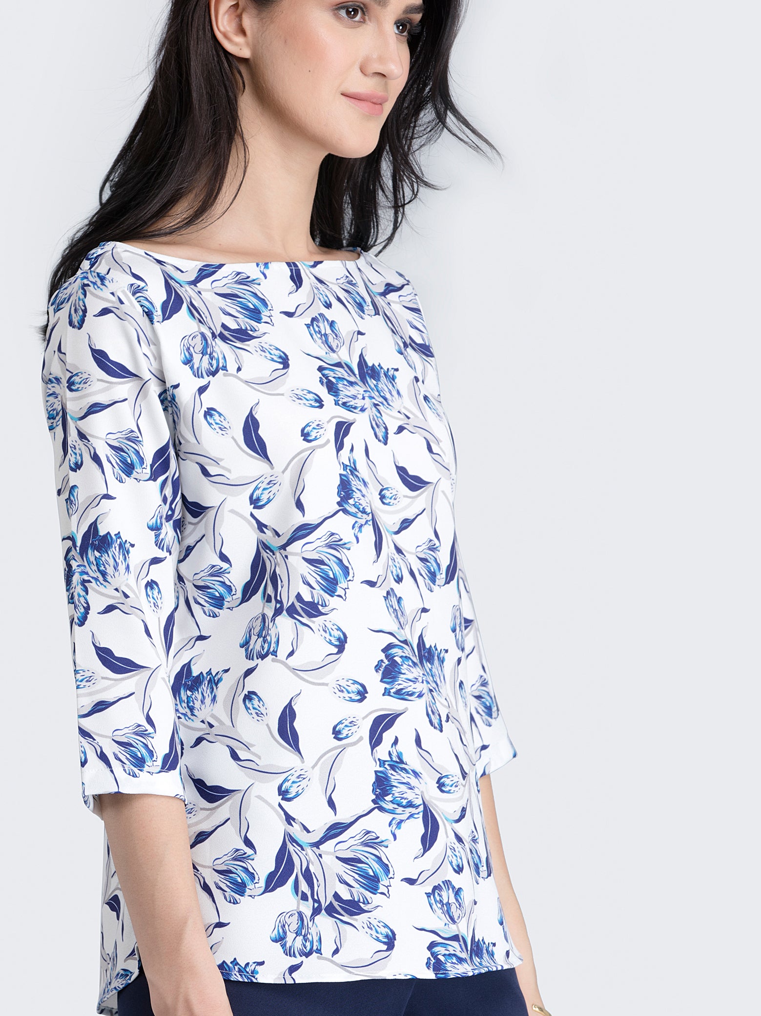 This blue top has a boat neck with loops to fasten intimates, floral pattern and ¾ sleeves. Designed from Poly Moss Lycra, it's immensely soft, stretchable, anti-wrinkle and anti-pill.