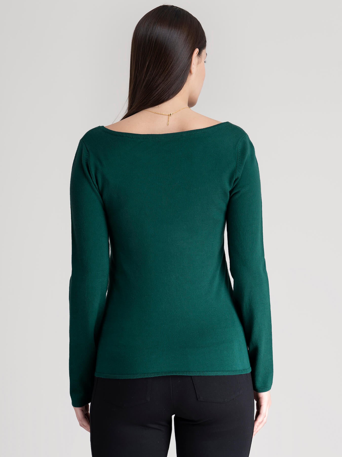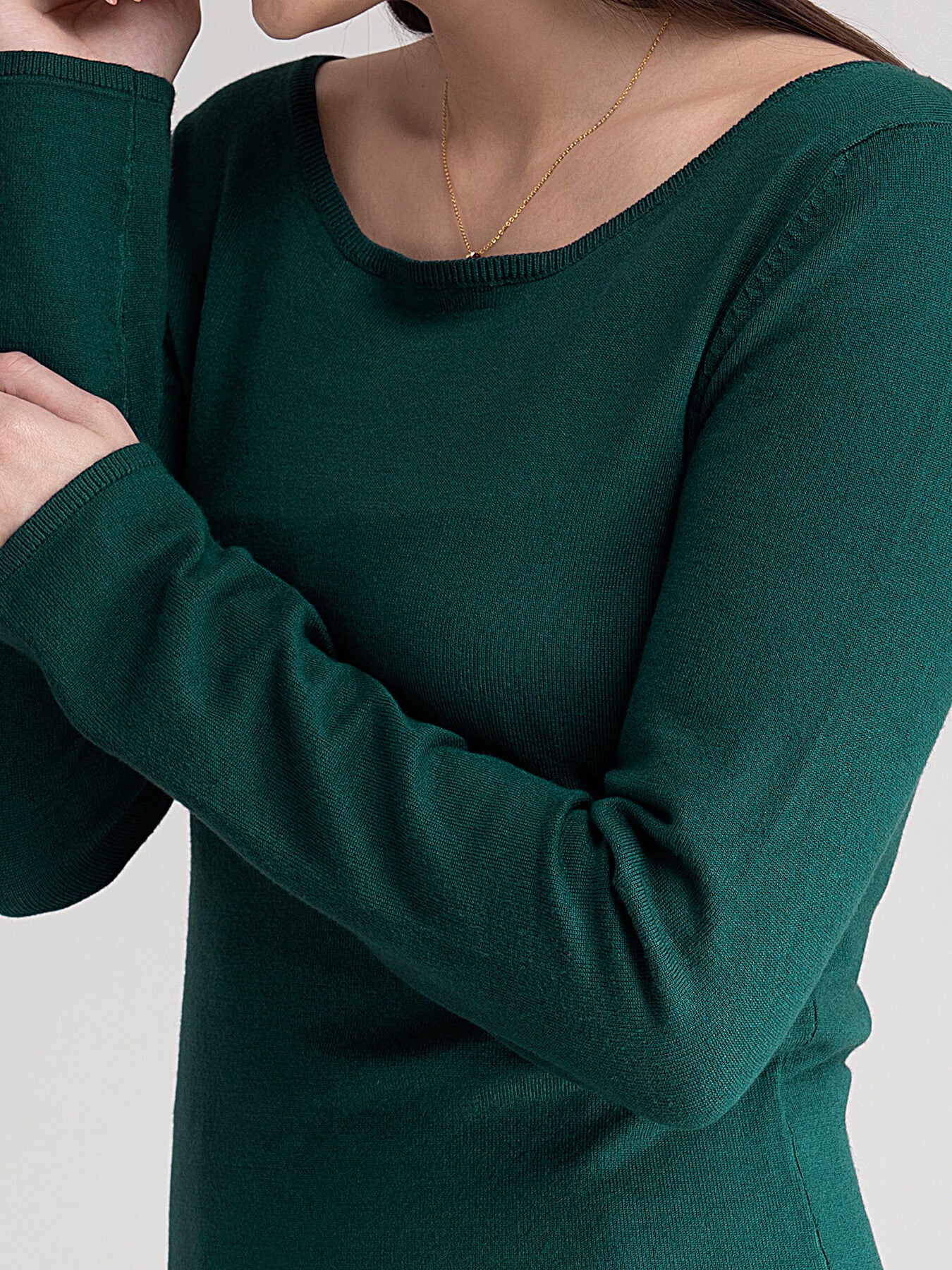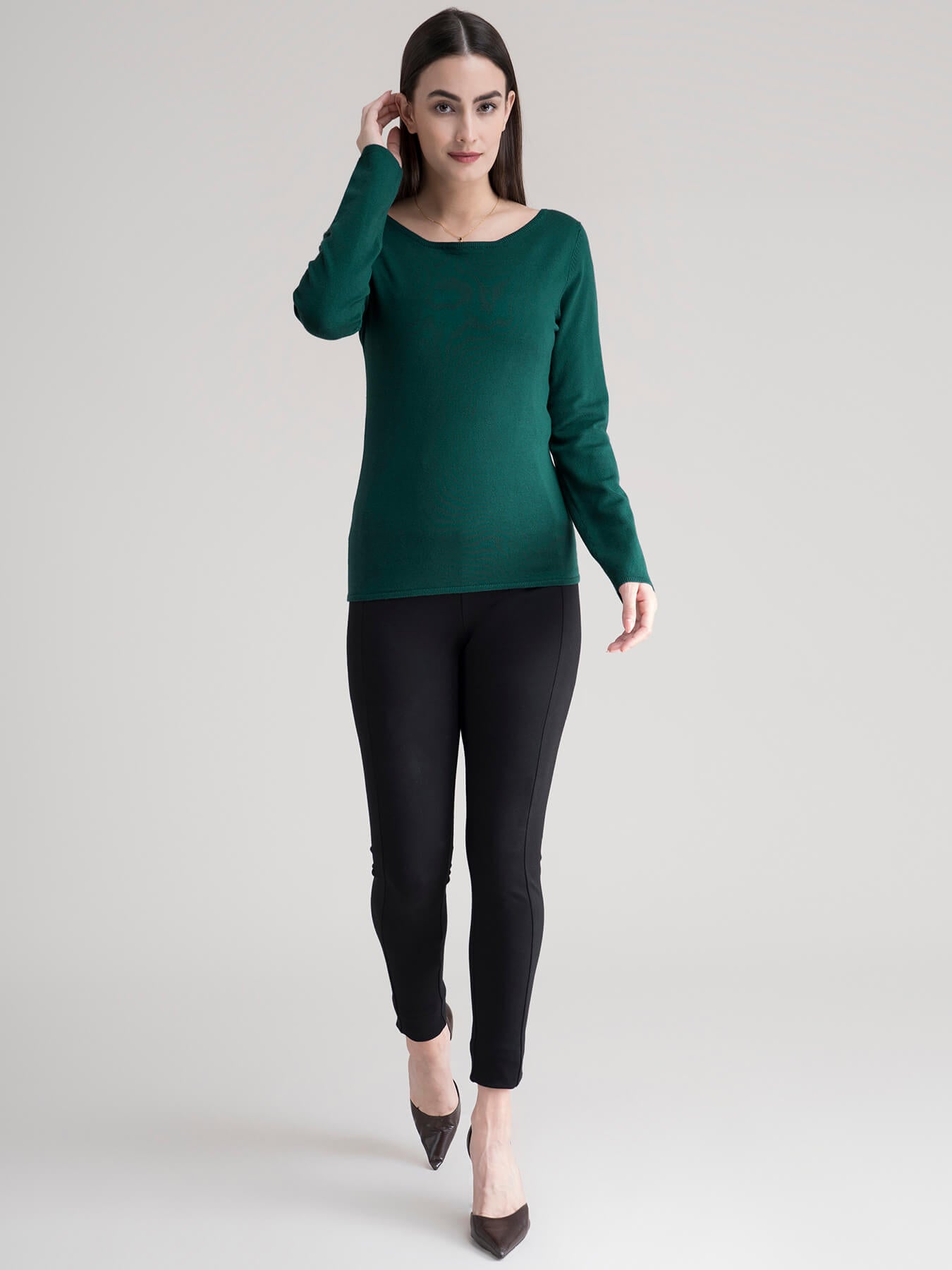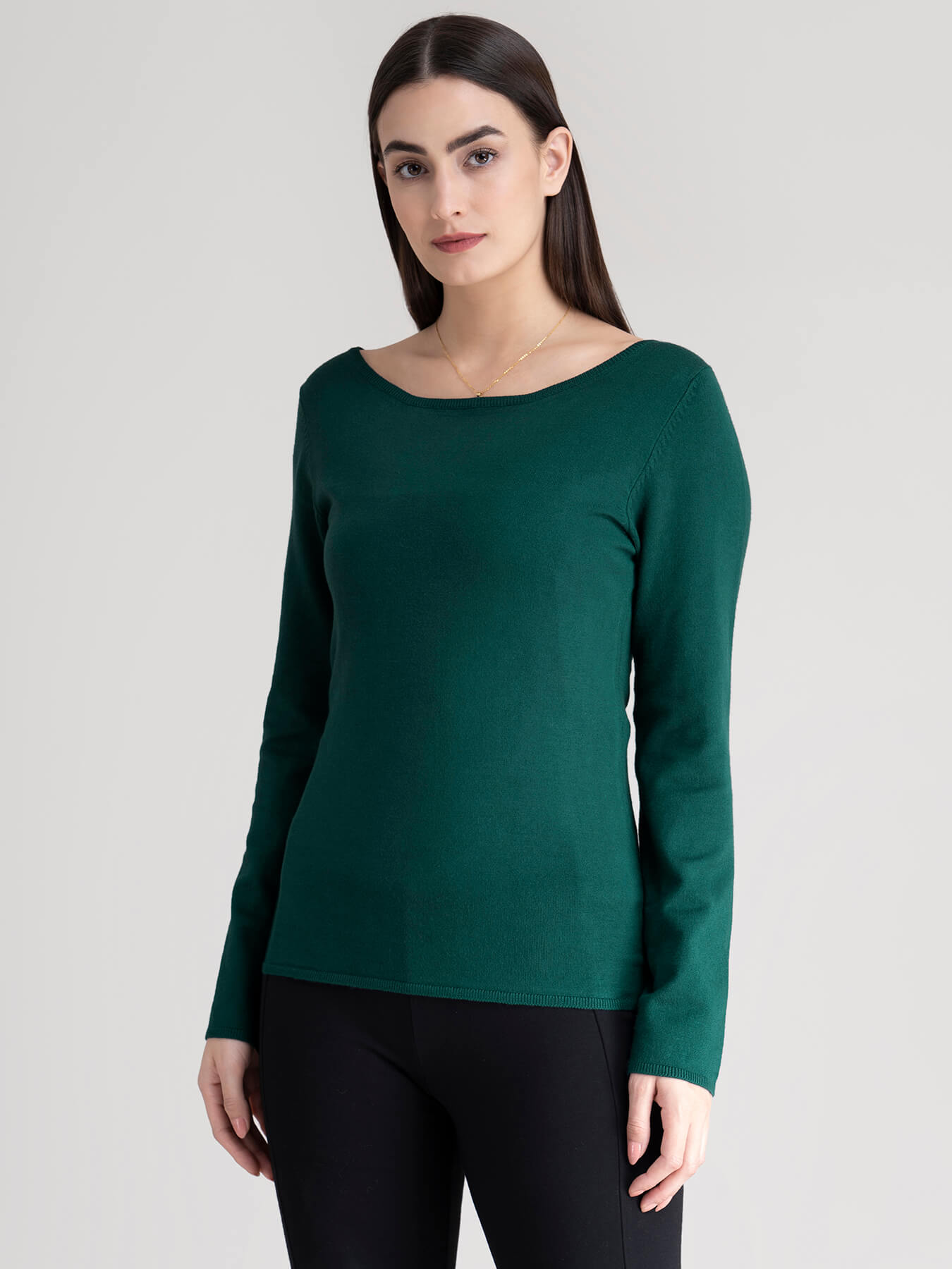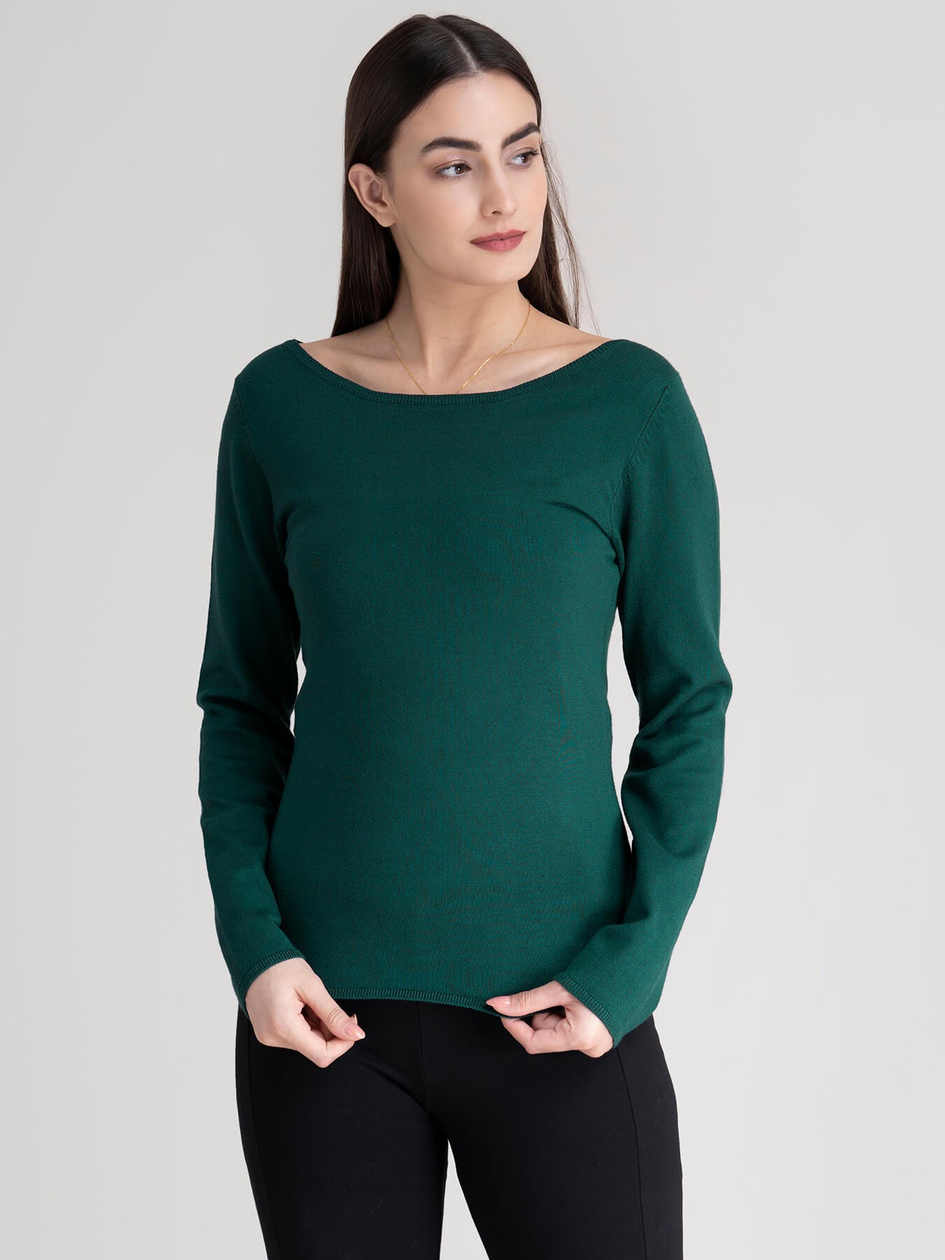 This bottle green sweater has a boat neck and full sleeves. Made from Viscose Nylon, it is ultra-soft, breathable, comfortable and stretchable.
