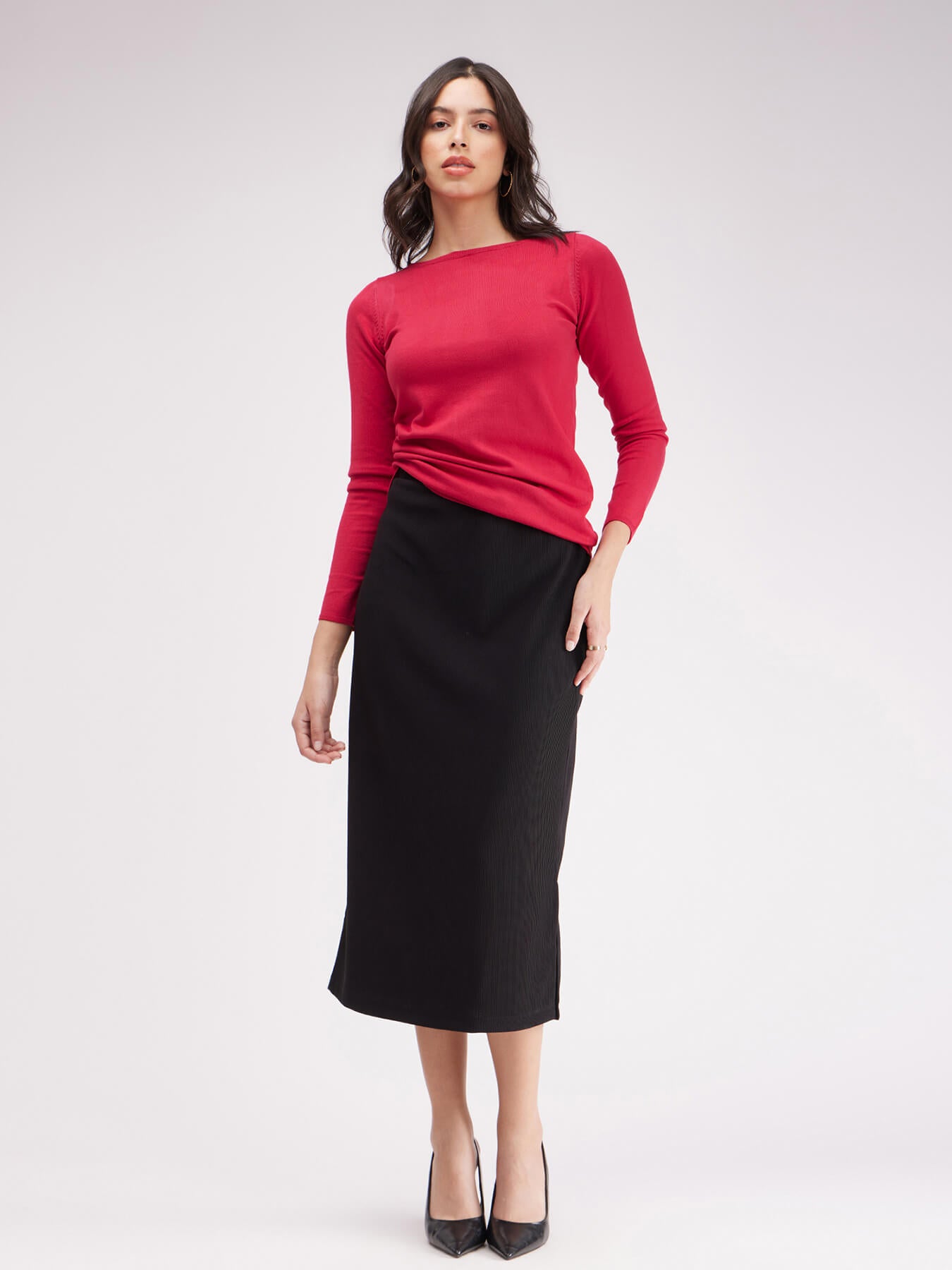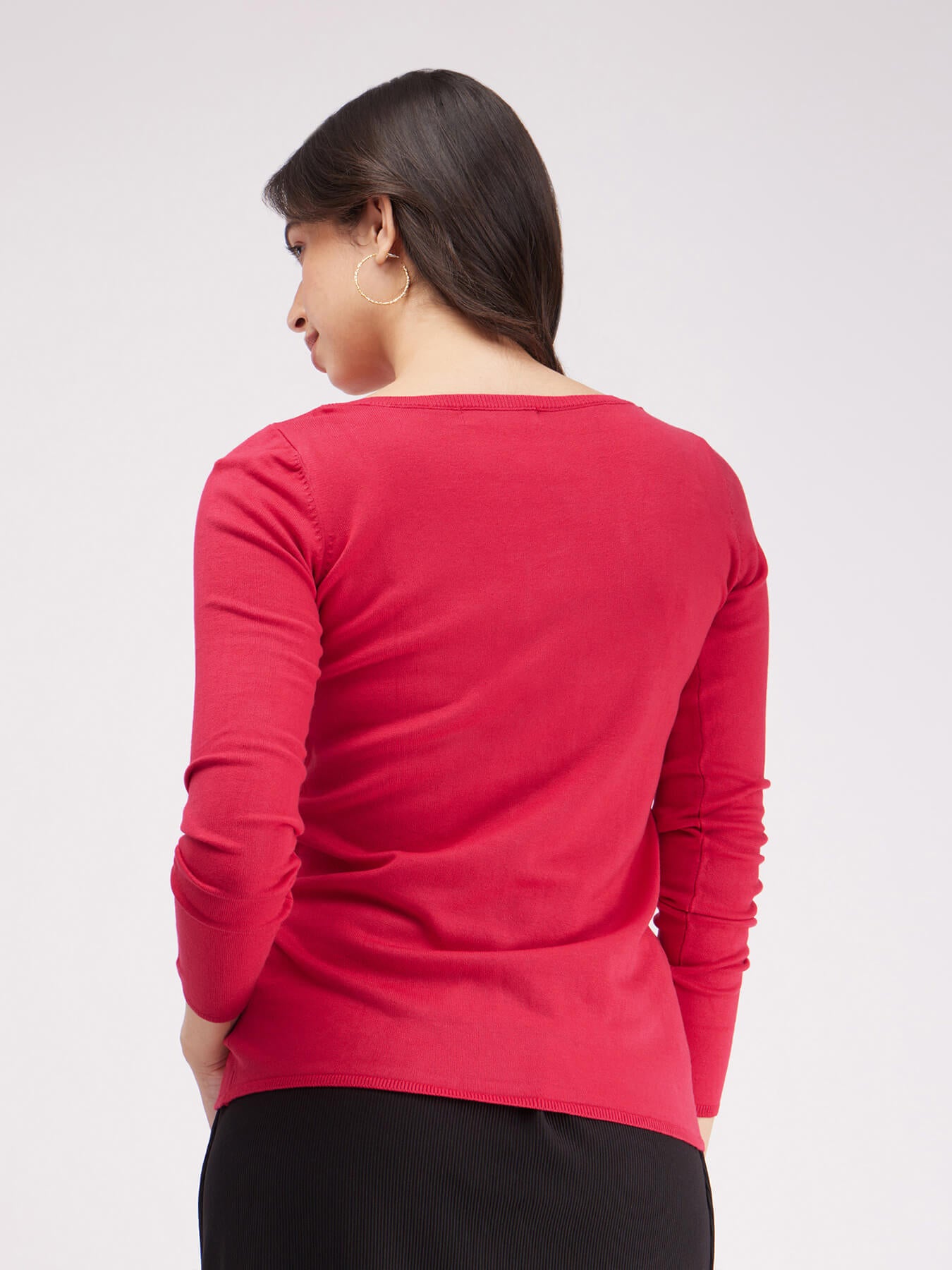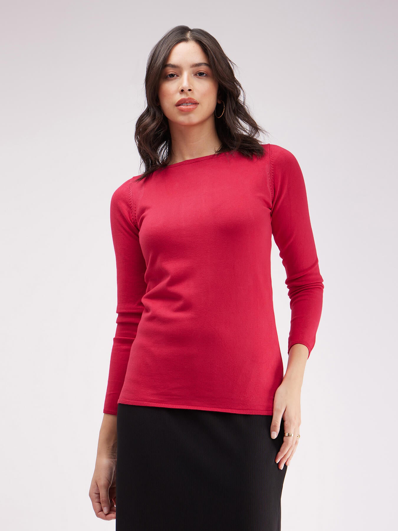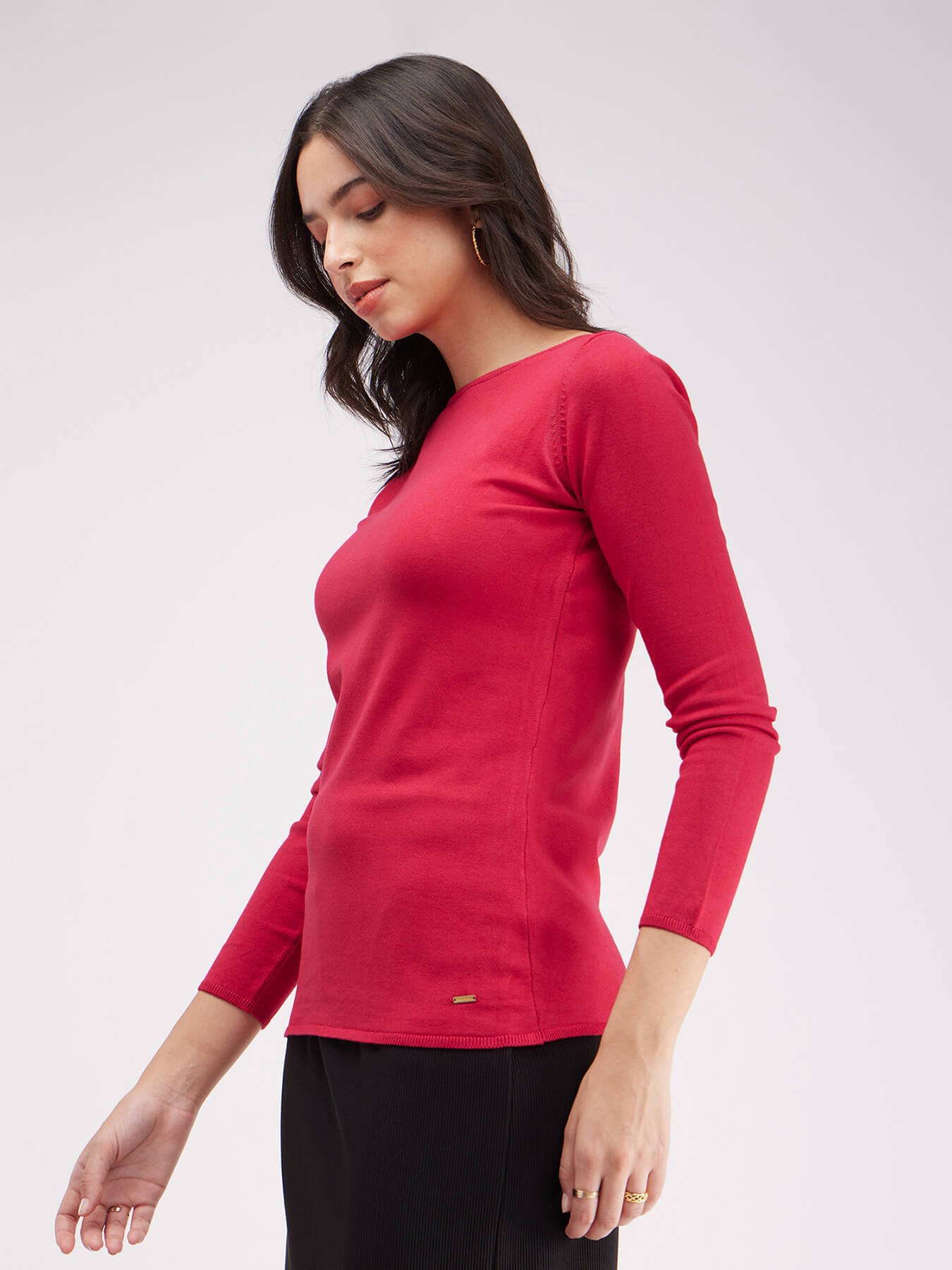 This rose pink sweater has a boat neck and full sleeves. Made from Viscose Nylon, it is ultra-soft, breathable, comfortable and stretchable.