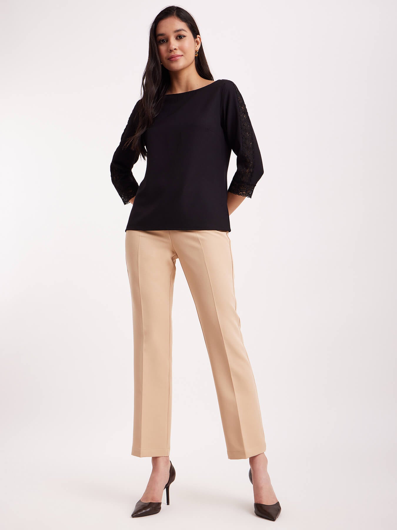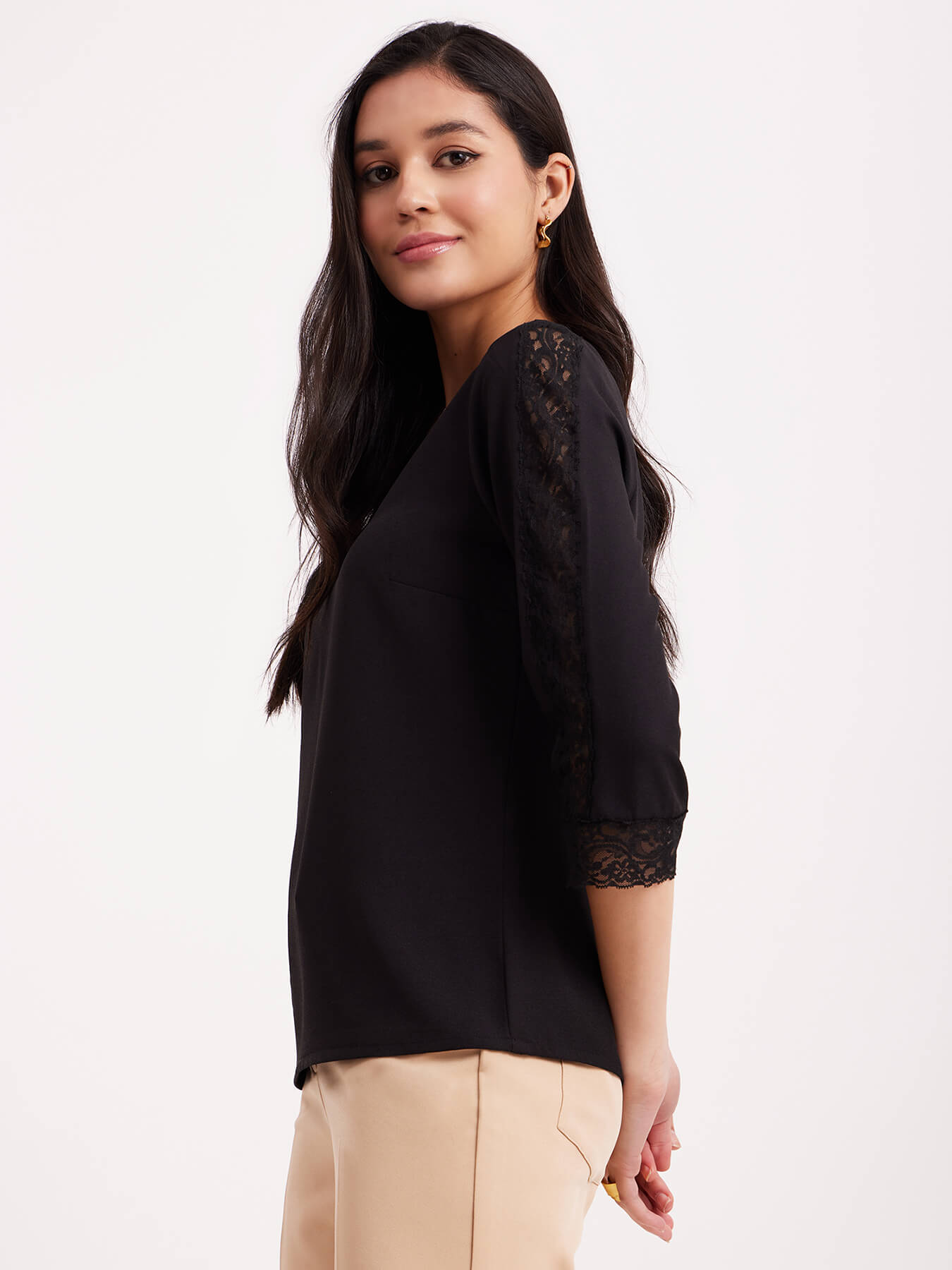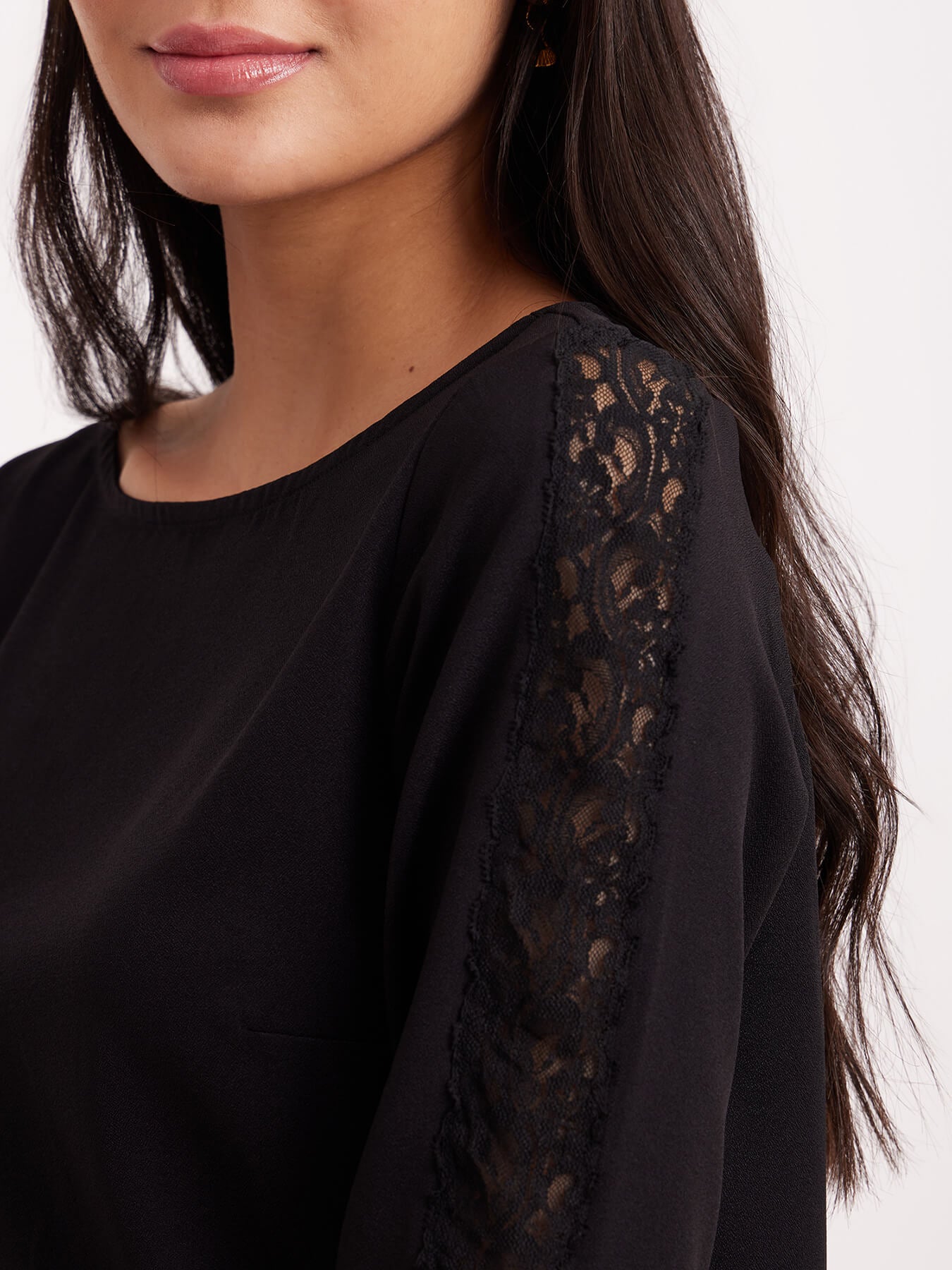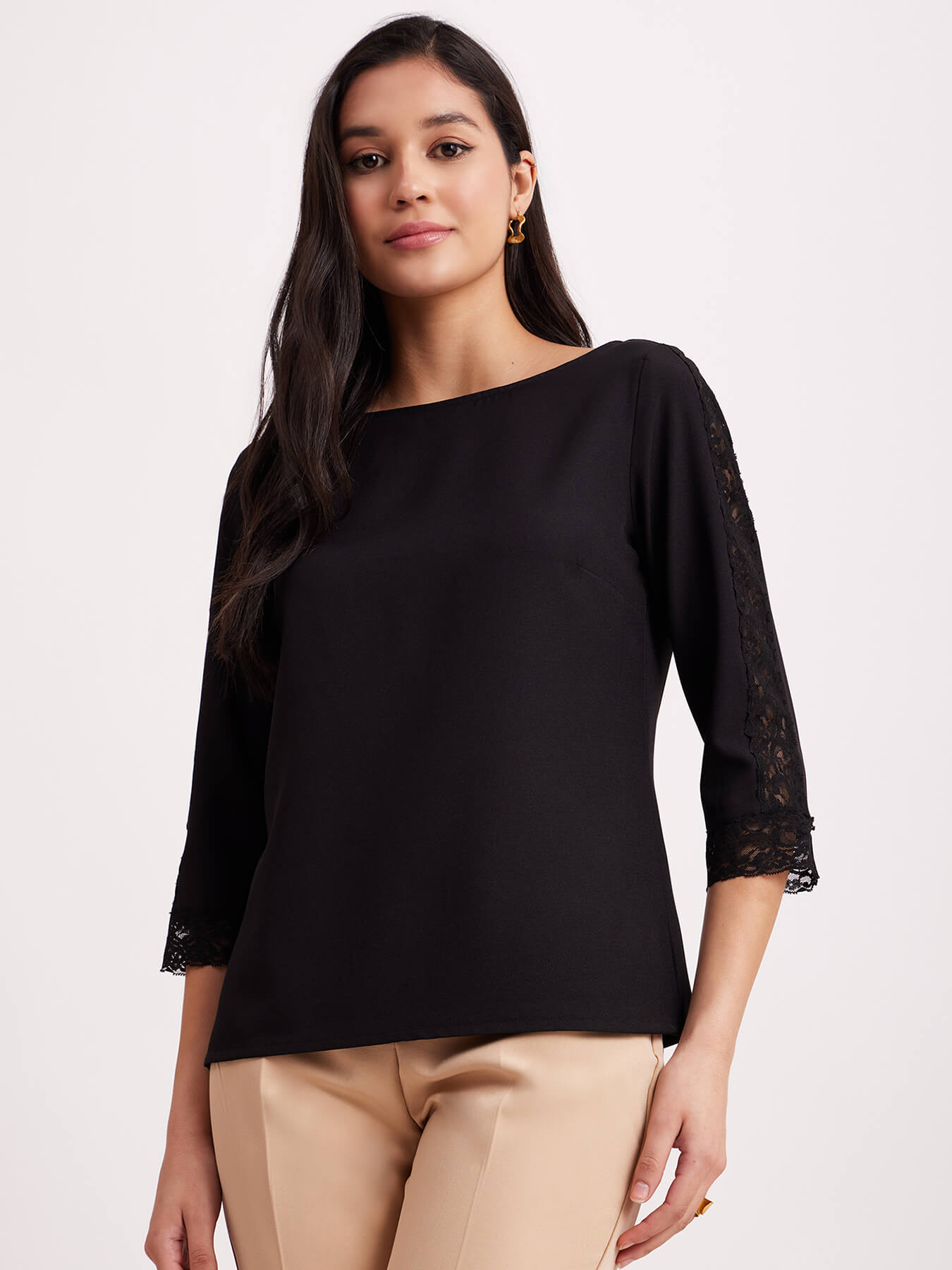 This black top has a boat neck, three-quarter sleeves and lace detail. Made from Polyester Moss, it is soft and comfortable to wear.