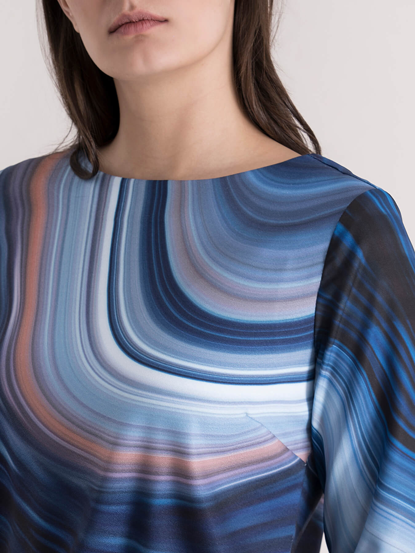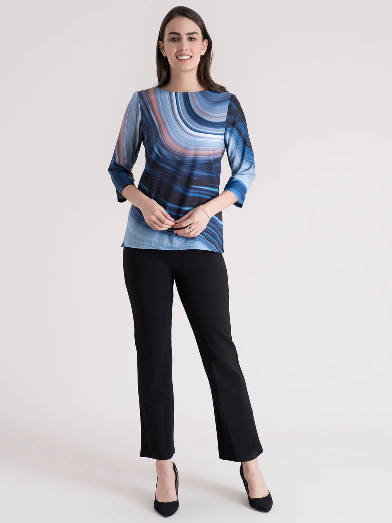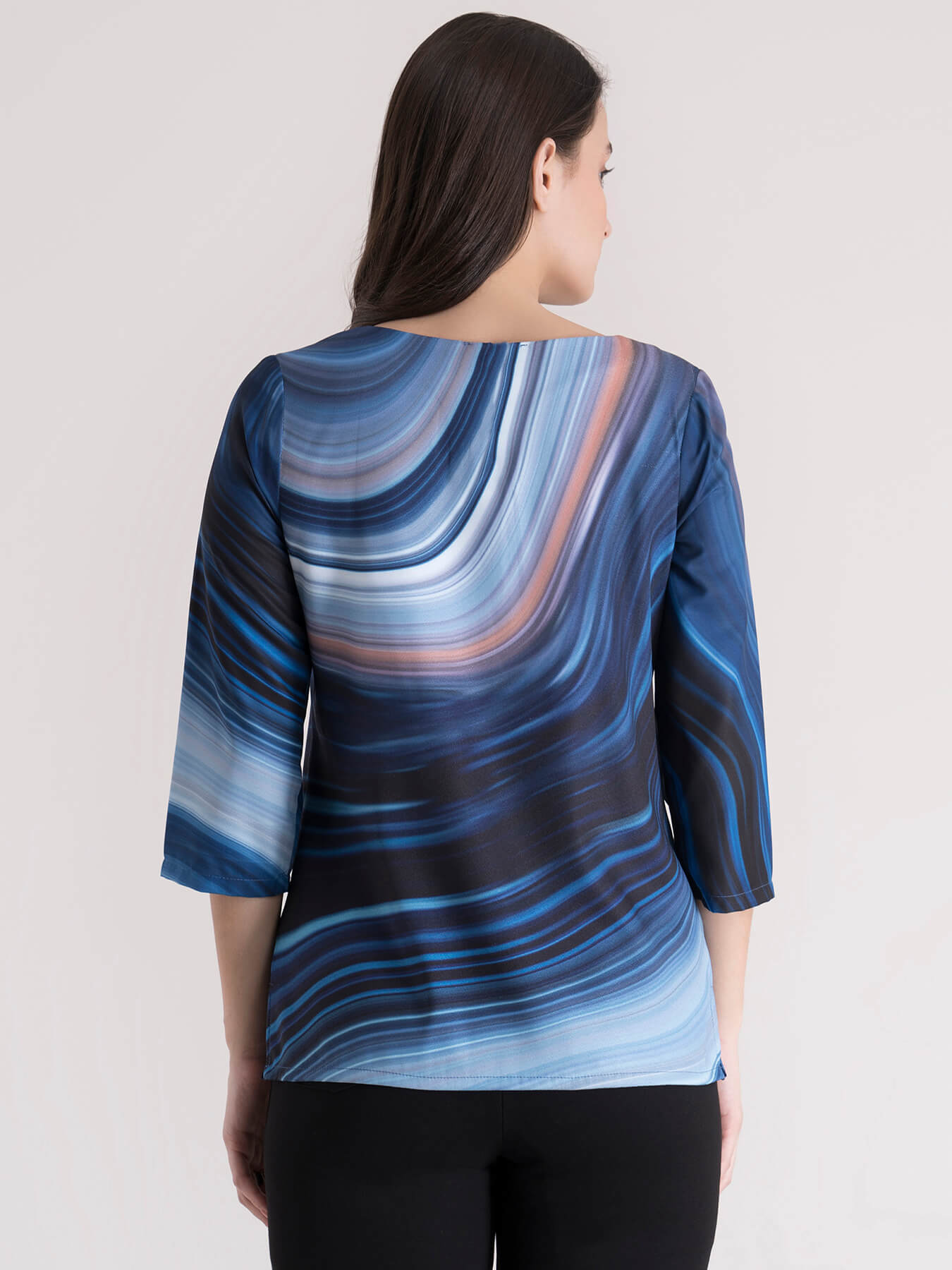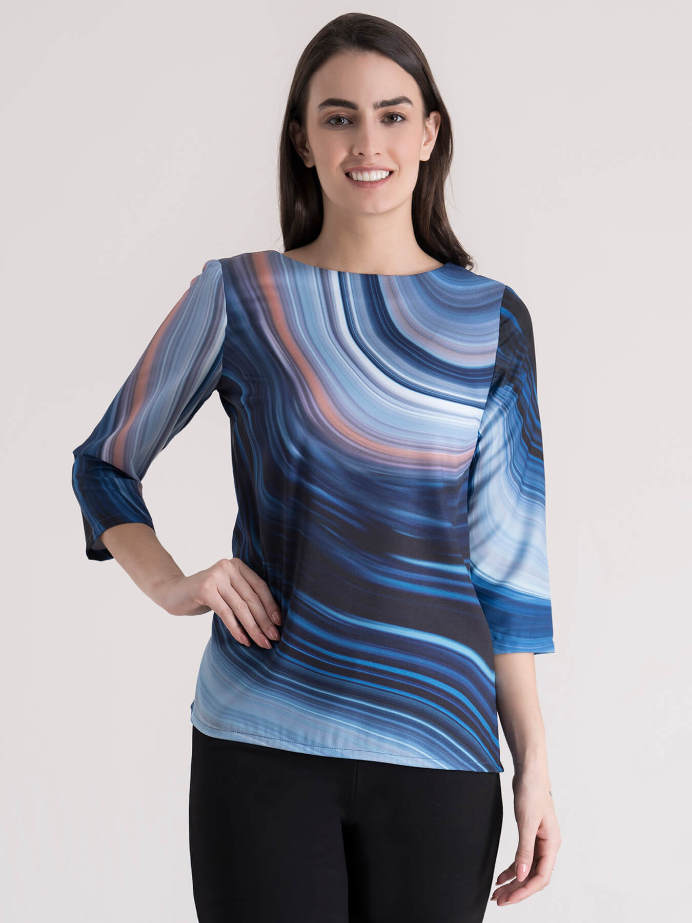 This blue top has a boat neck, marble print and three-fourth sleeves. Made from Polyester, it's soft, lightweight and comfortable to wear.