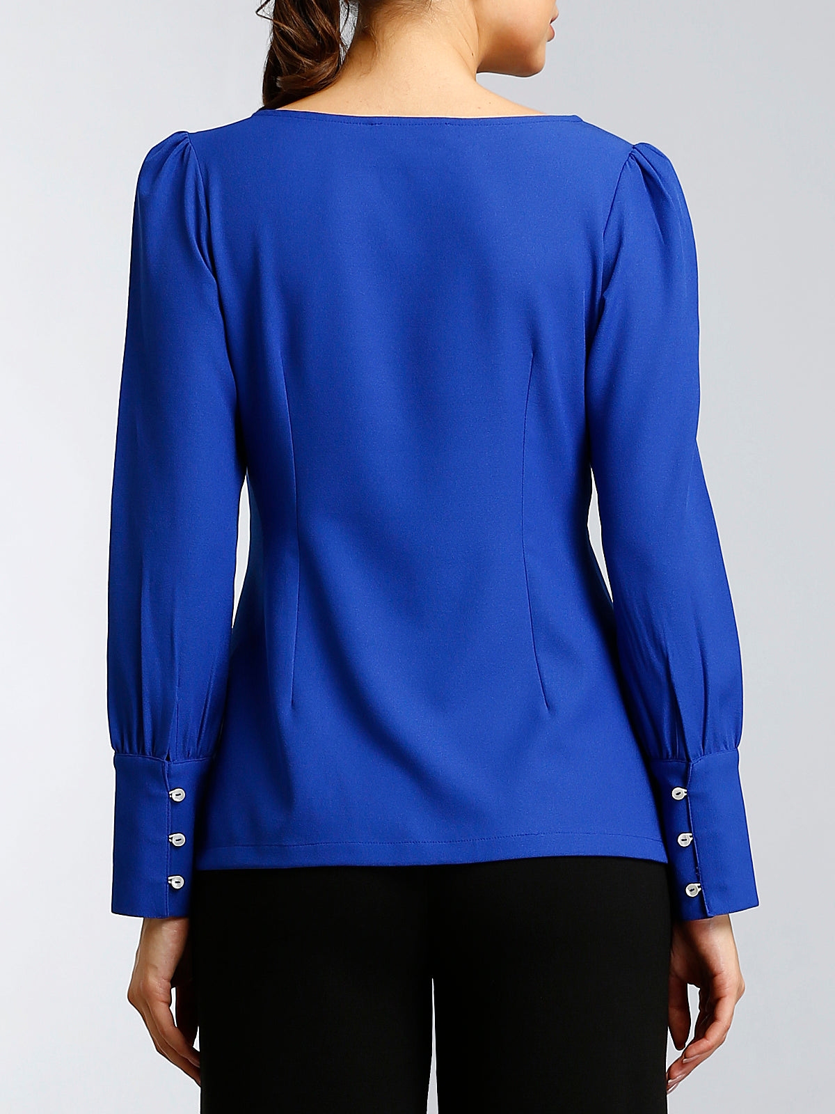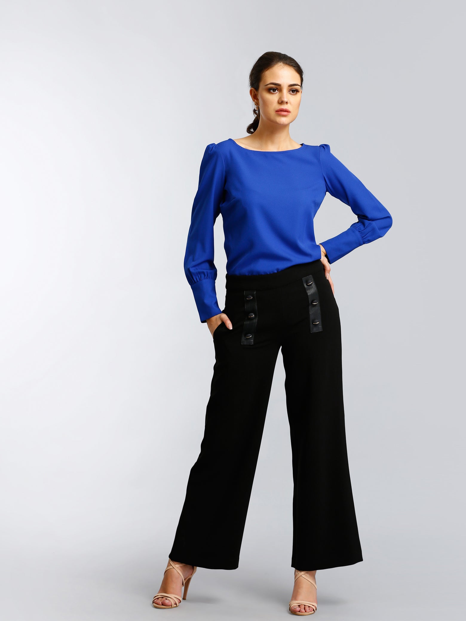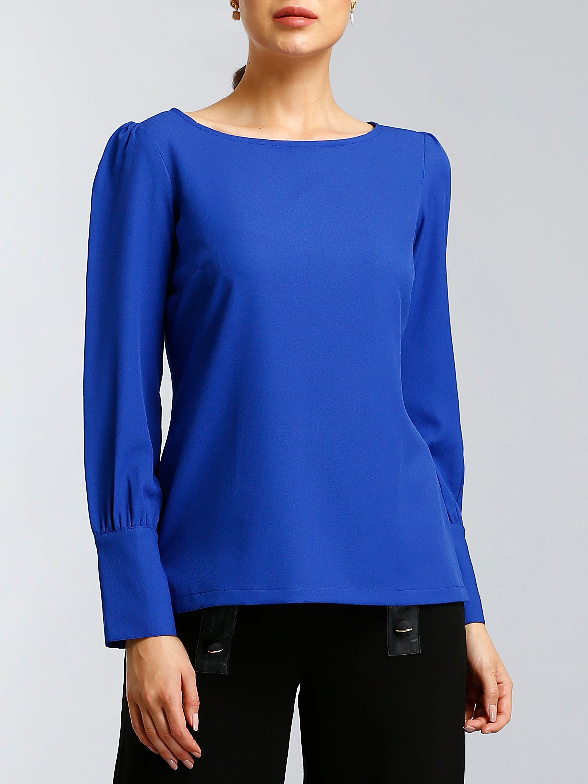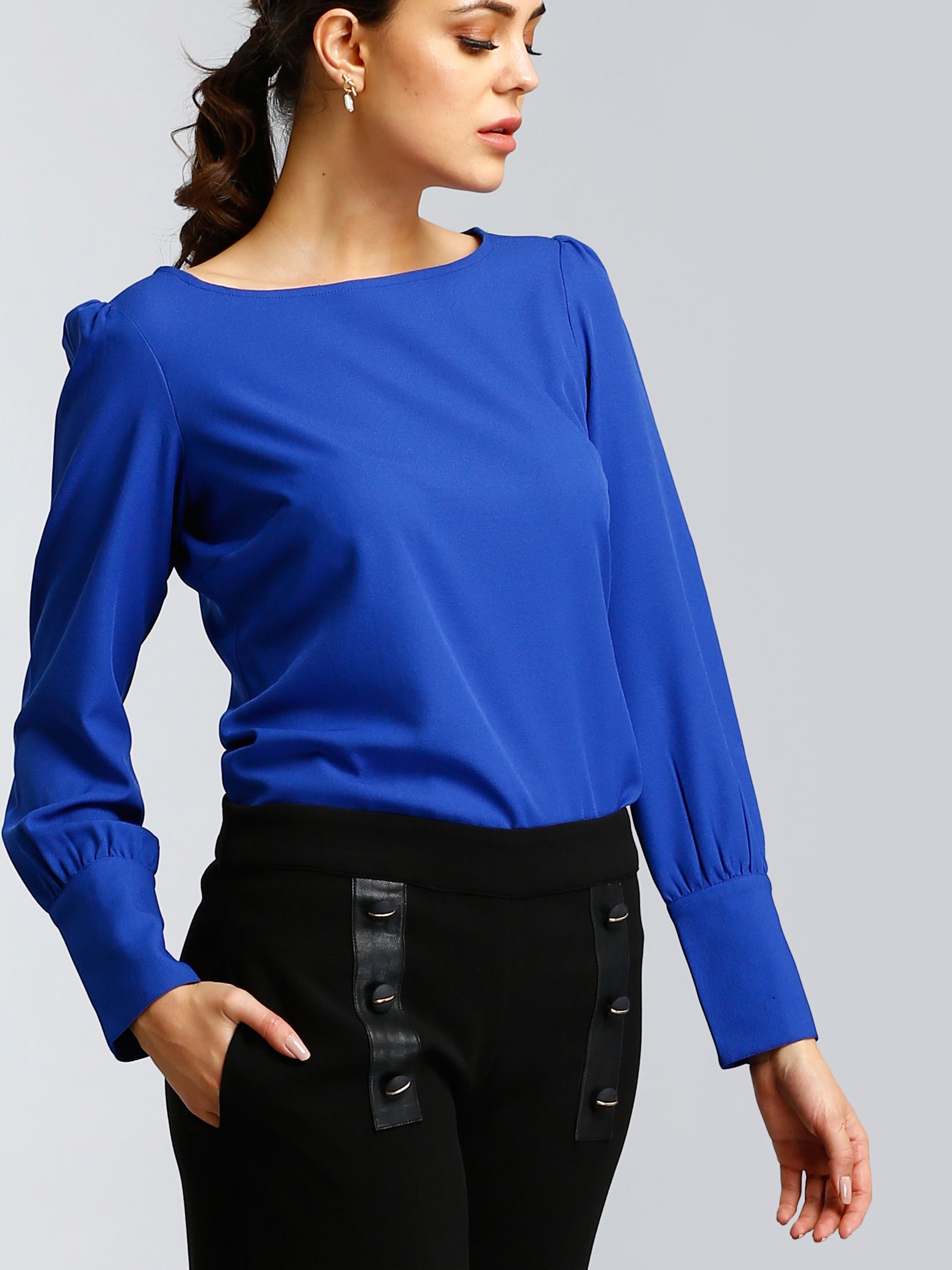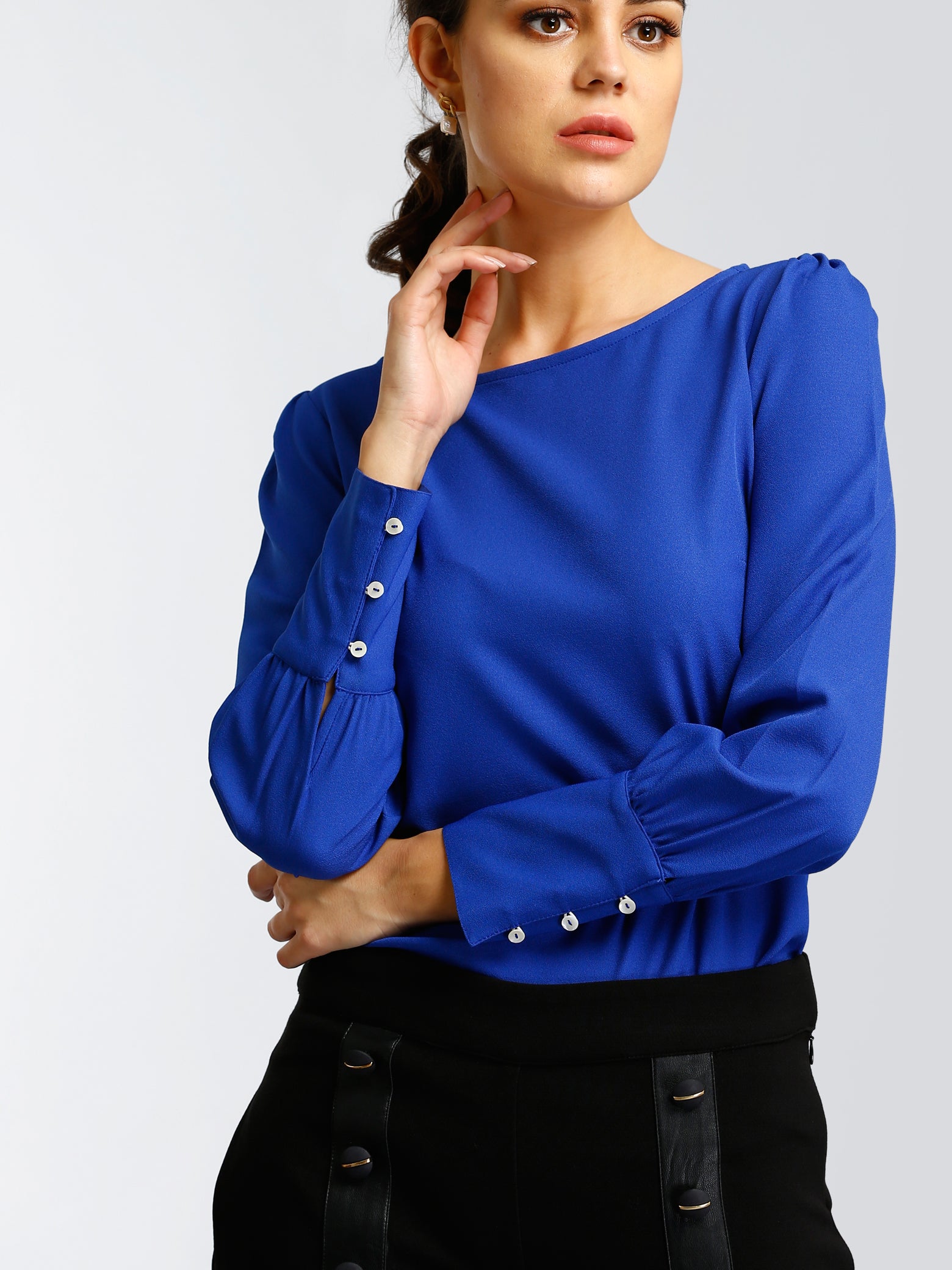 Go from AM to PM in this cobalt blue top. It has a boat neck with loops inside to fasten intimates, gather details on full sleeves, buttons for closure and slits on the side for easy movement. Created from Poly Moss, it is slightly textured, immensely soft, stretchable, anti-wrinkle and anti-pill properties.