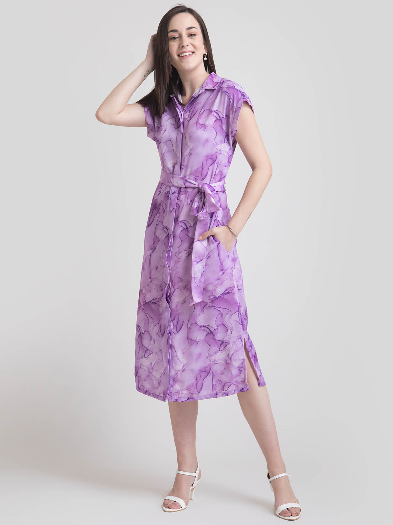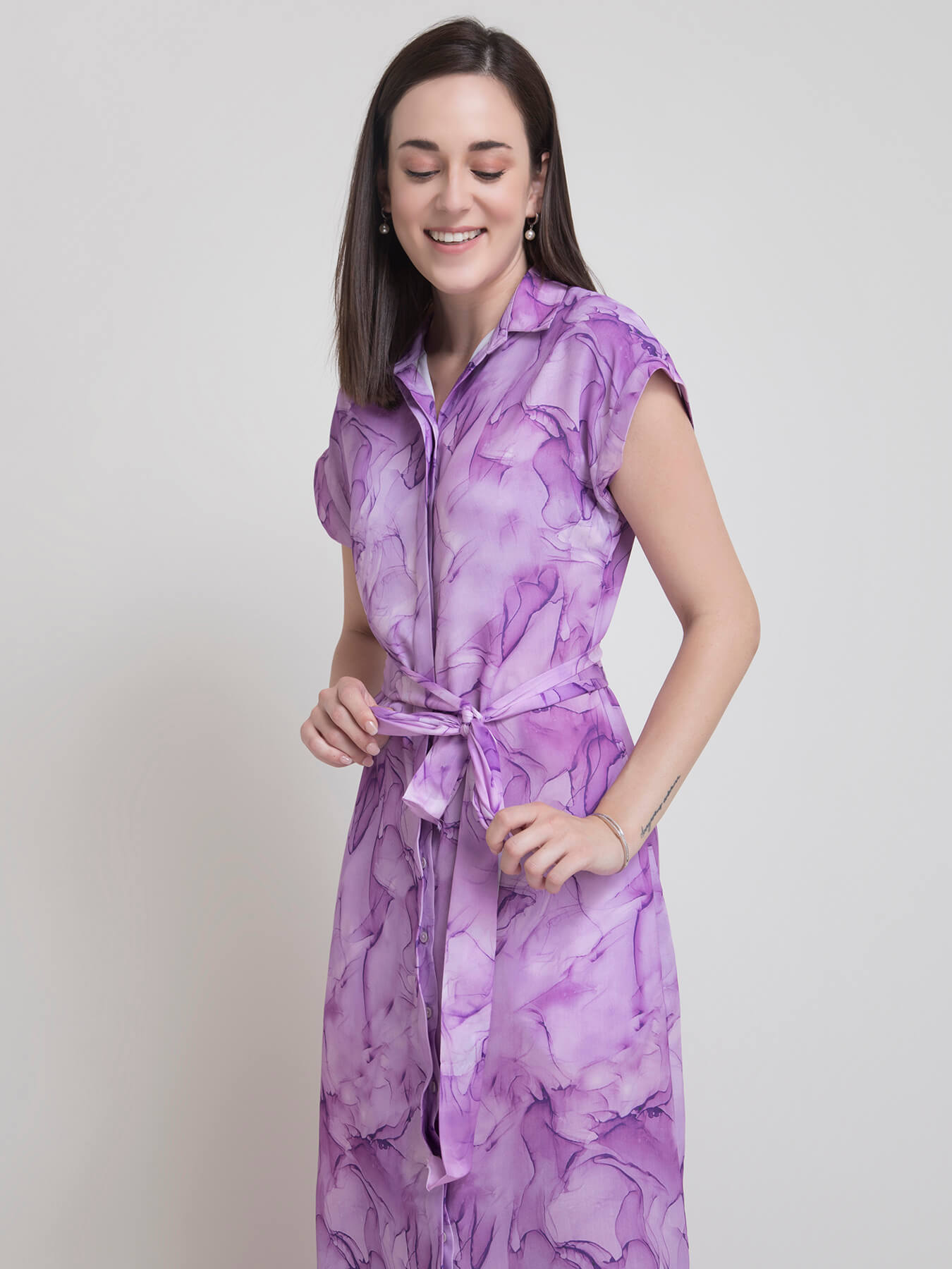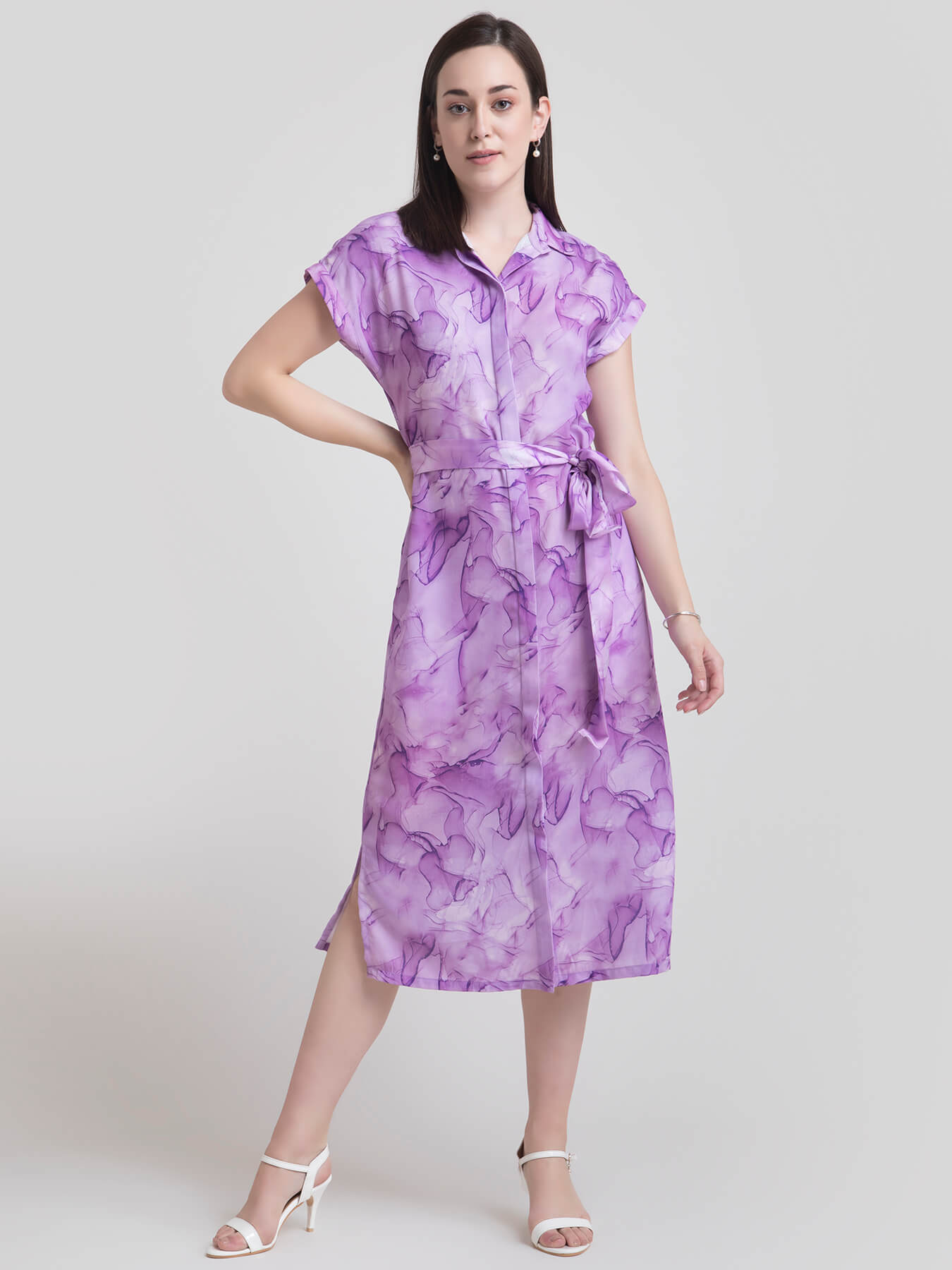 This lilac shirt dress has a regular collar, marble print, concealed button placket, pocket and short sleeves. Made from Georgette, it is soft and luxurious. This dress comes with a detachable tie belt.