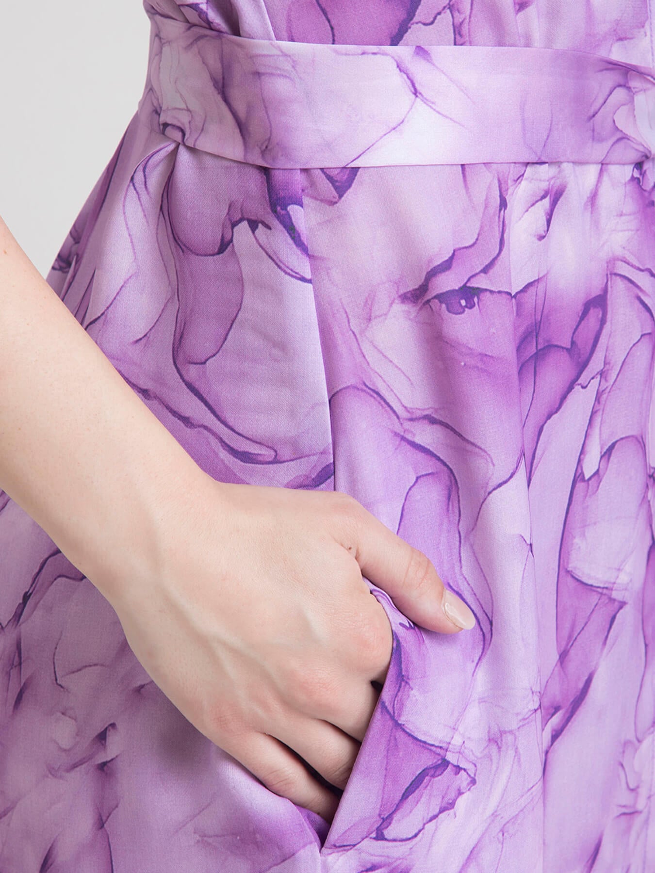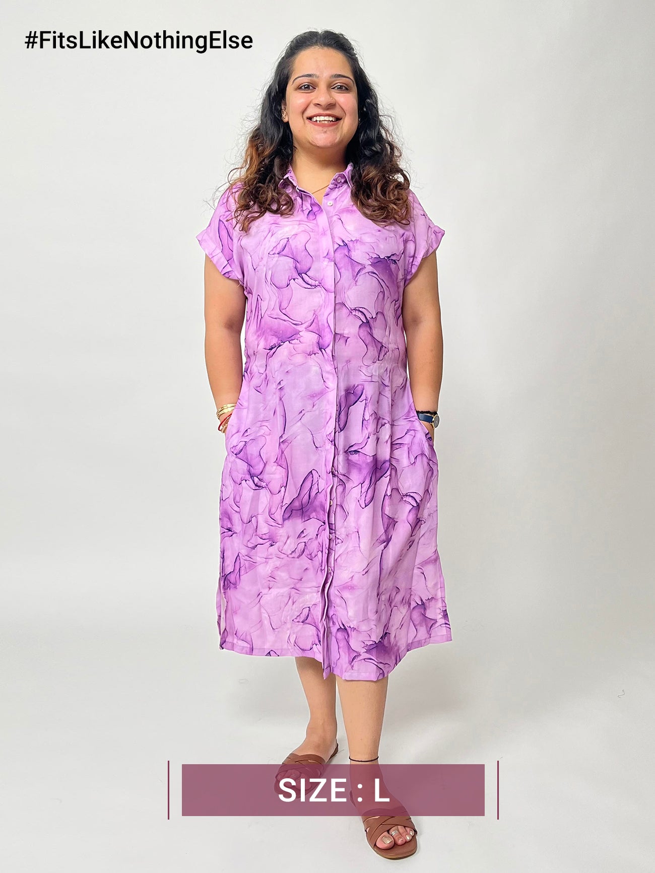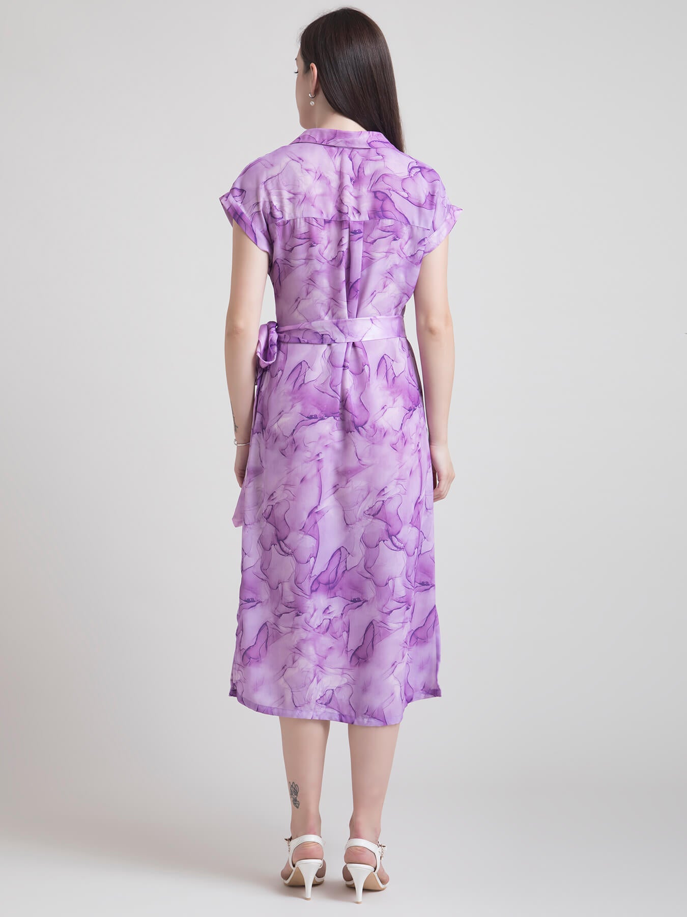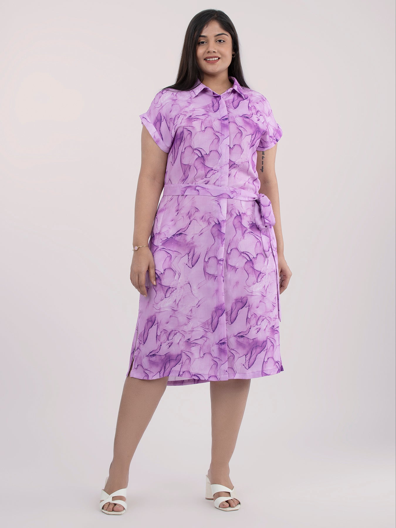 This lilac shirt dress has a regular collar, marble print, concealed button placket, pocket and short sleeves. Made from Georgette, it is soft and luxurious. This dress comes with a detachable tie belt.