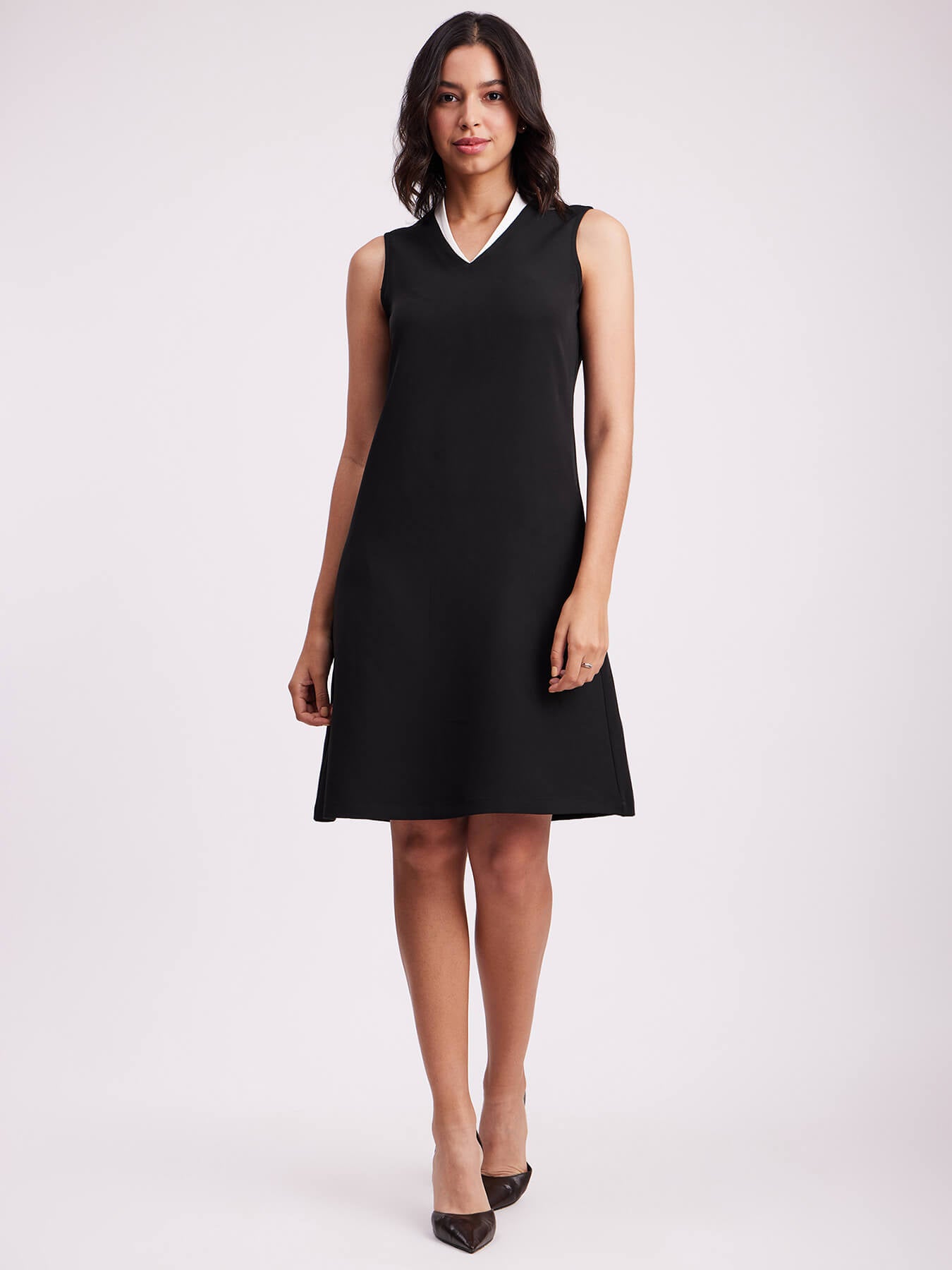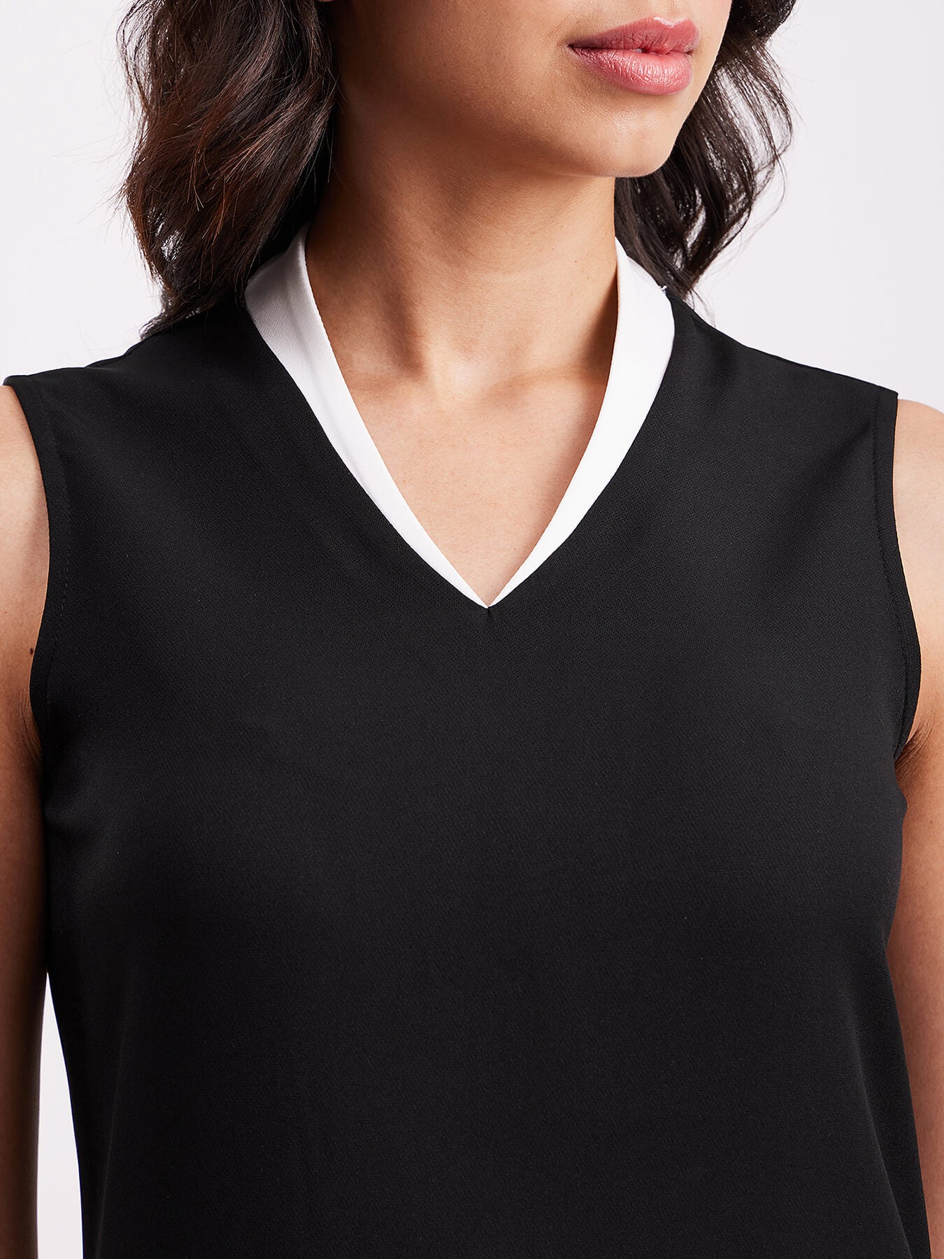 This black sleeveless dress has a V-neck and colour block detail. Made from Polyester Lycra, it is soft and comfortable to wear.