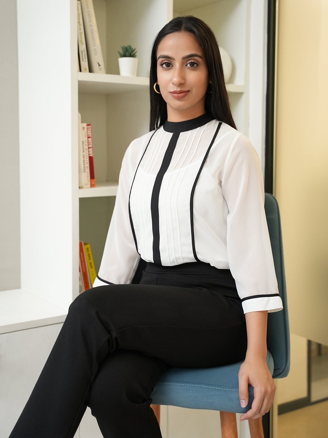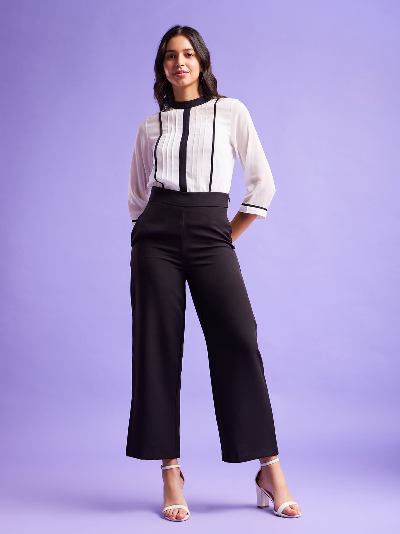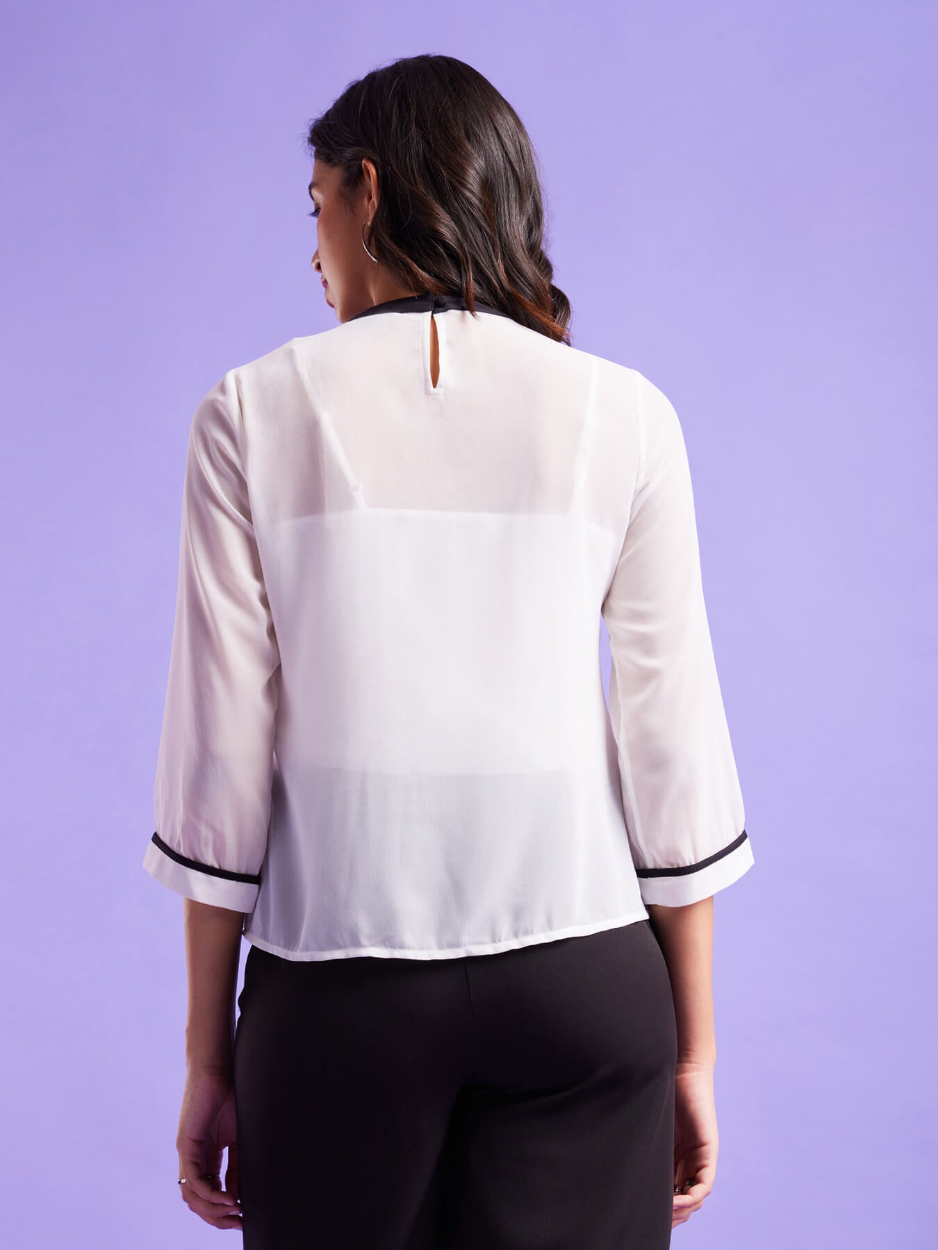 This white and black top has a high neck, three-quarter sleeves and pintucks detail. Made from Georgette, it is soft and comfortable to wear.