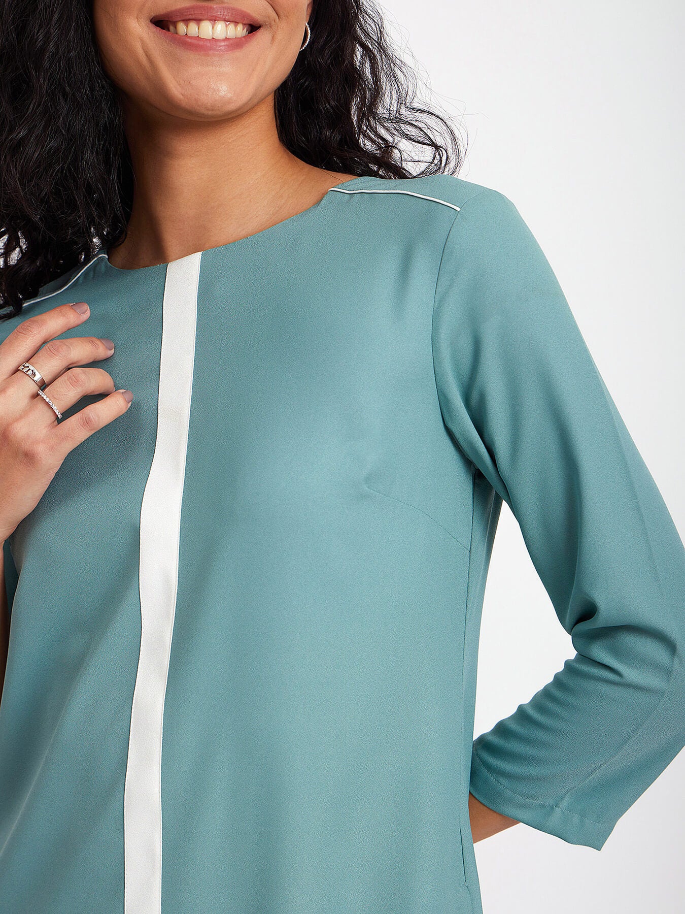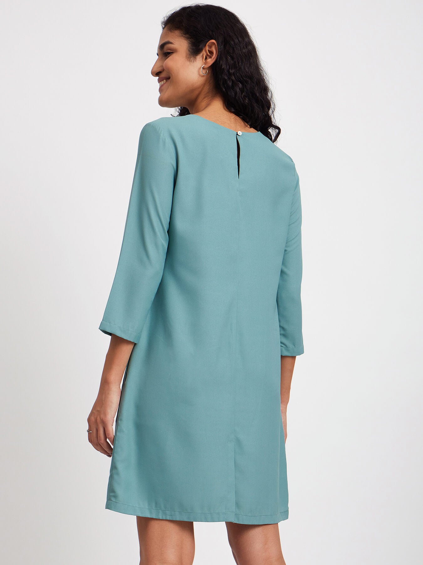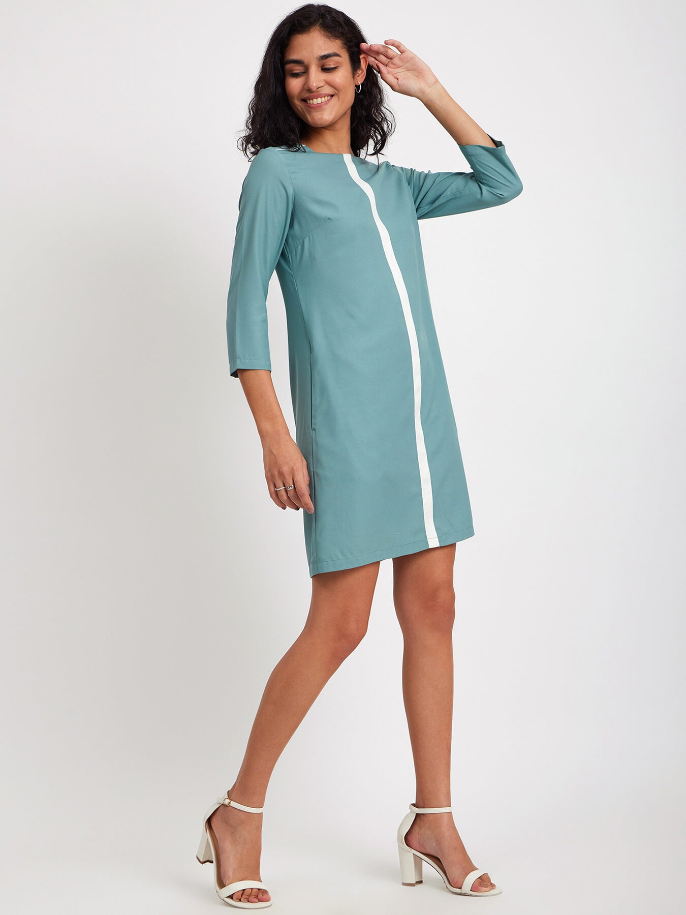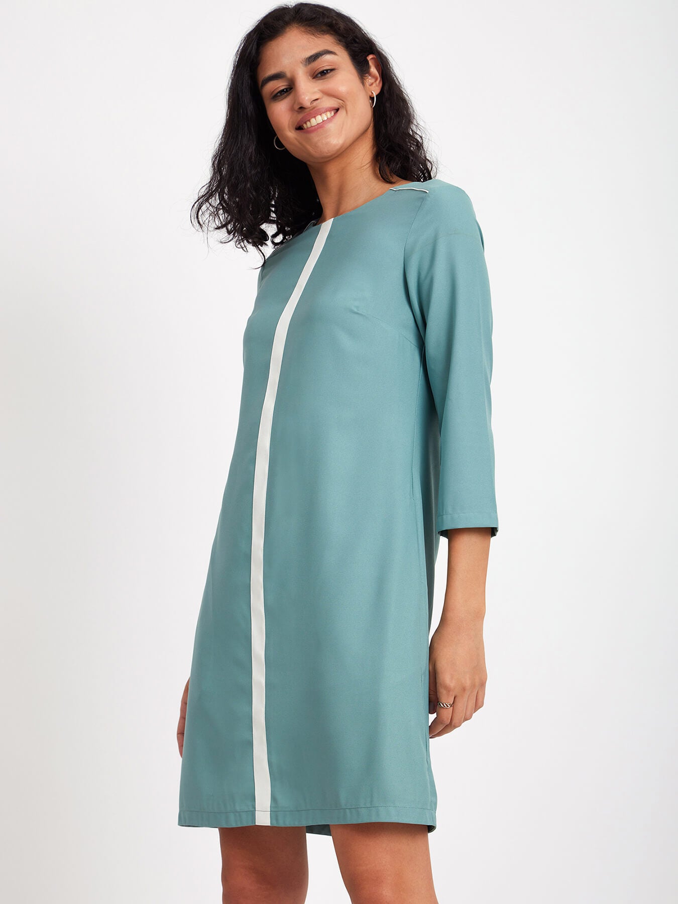 This sap green shift dress has a round neck, three-quarter sleeves and colour block detail. Made from Polyester Moss, it is soft and comfortable to wear.