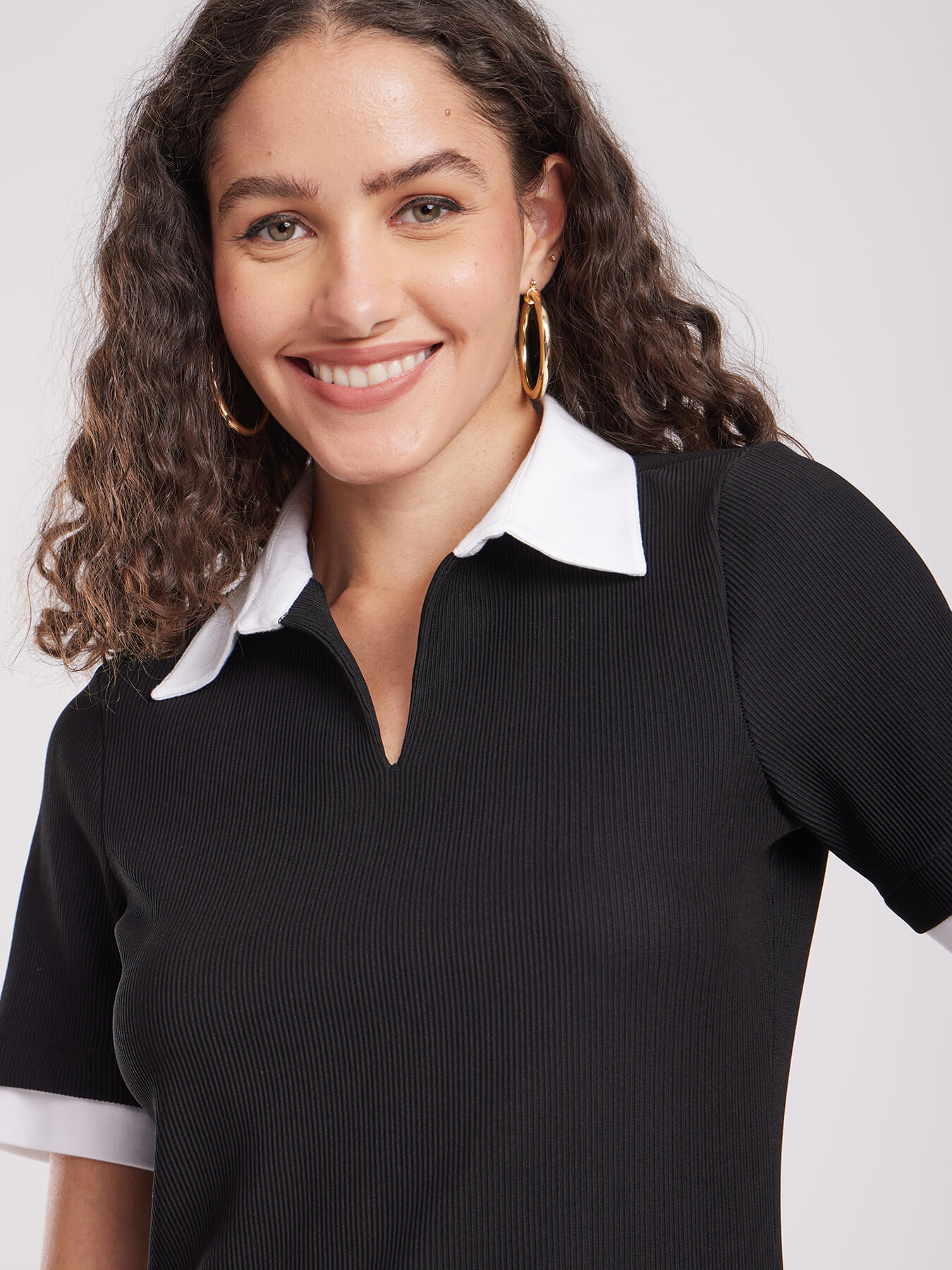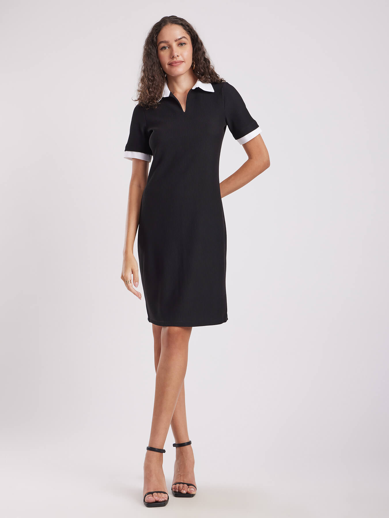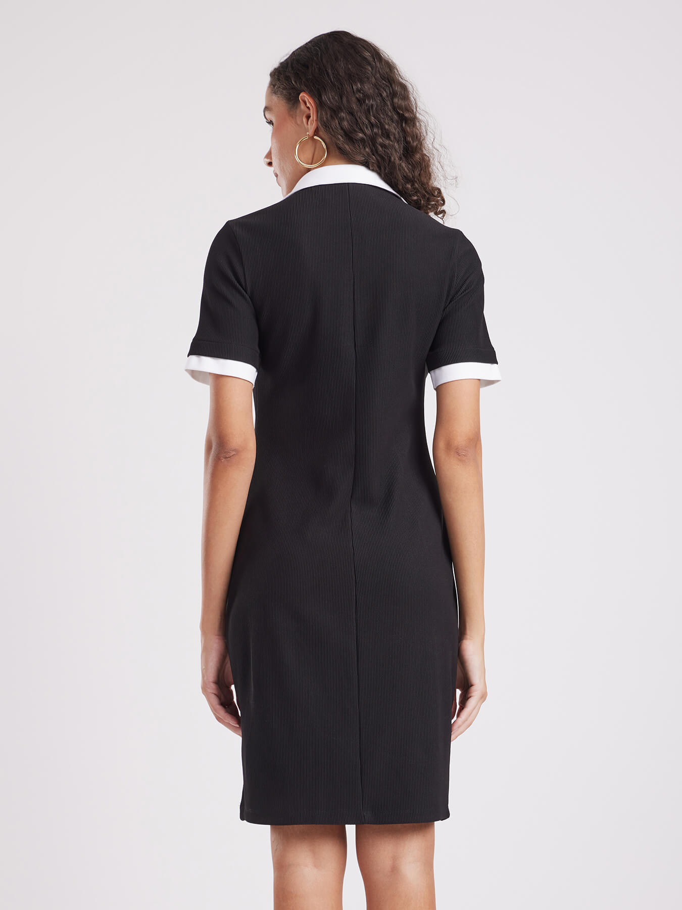 Contrast Collar Rib Knit Dress - Black And White