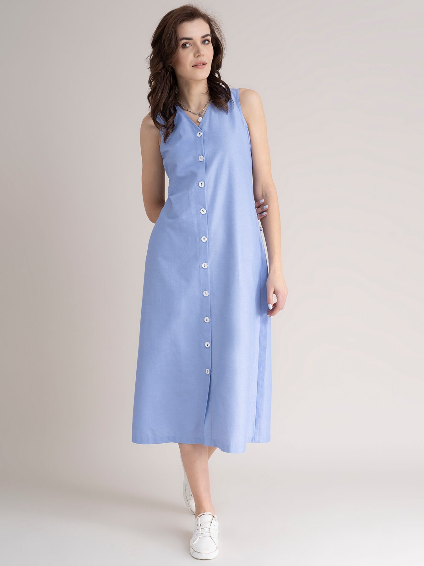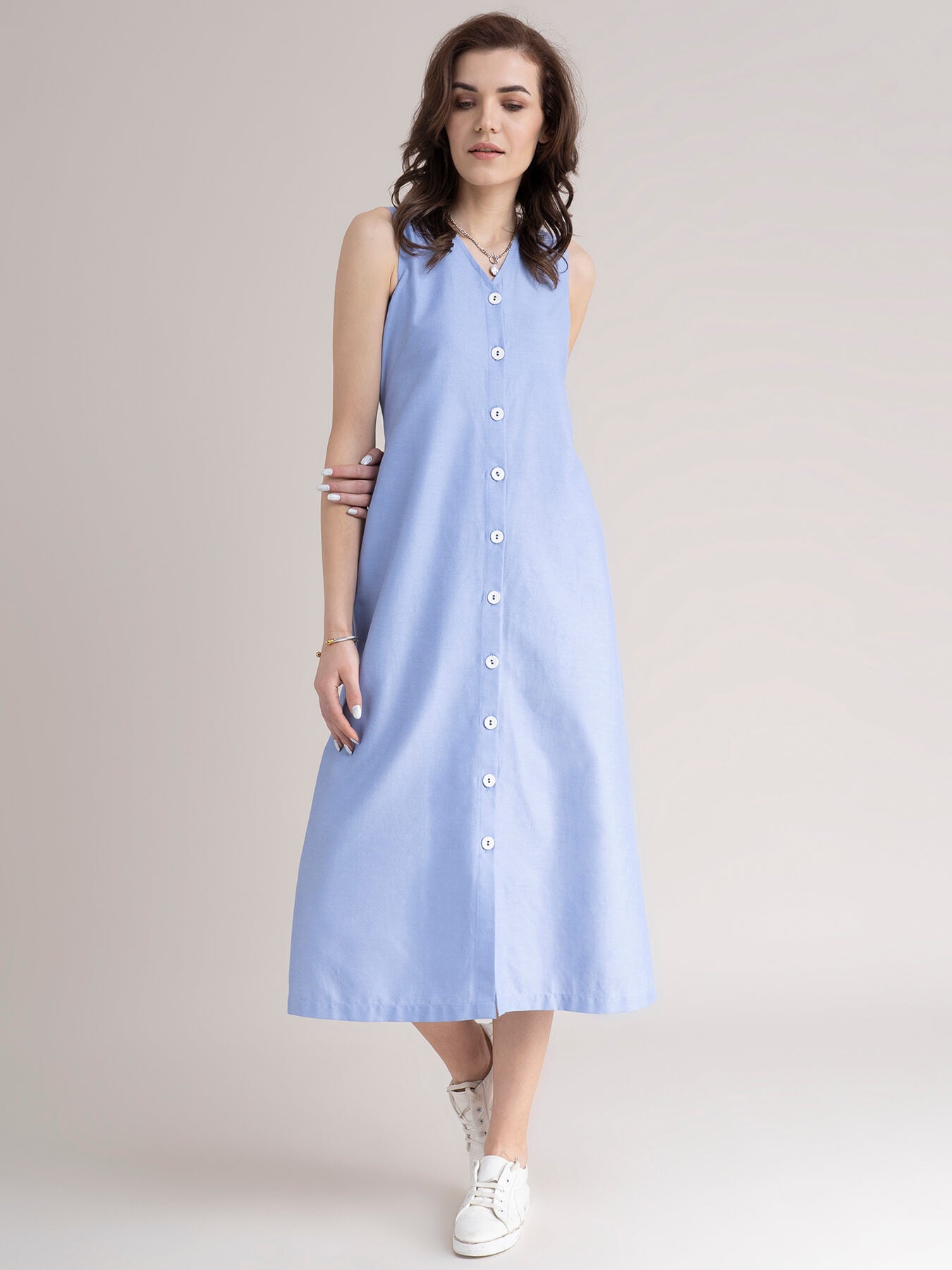 This light blue A line dress has a V neck. This midi dress is a button down dress and is sleeveless. Made of Cotton Oxford, it is comfortable and breathable.