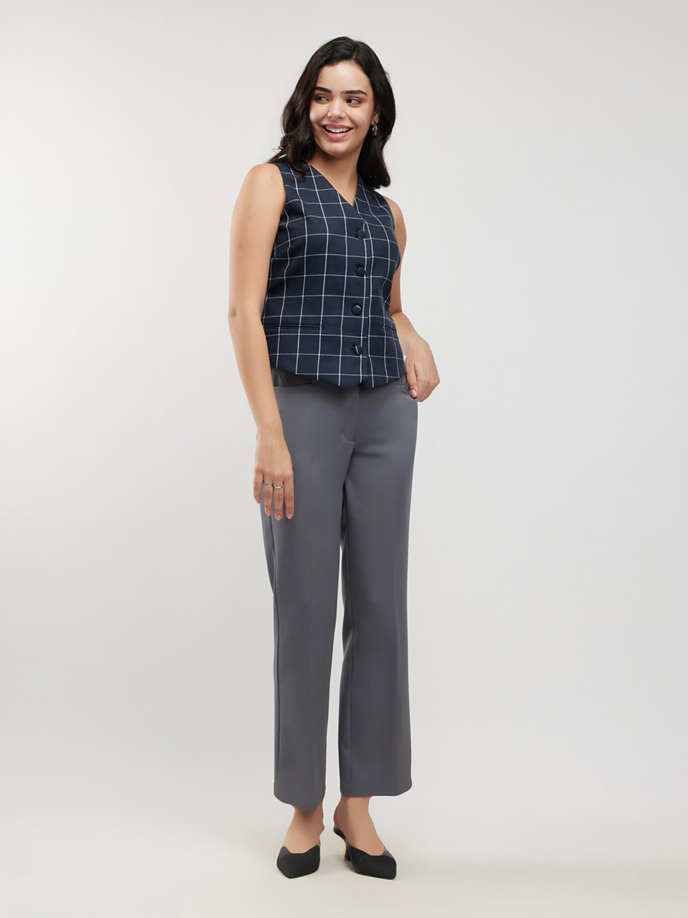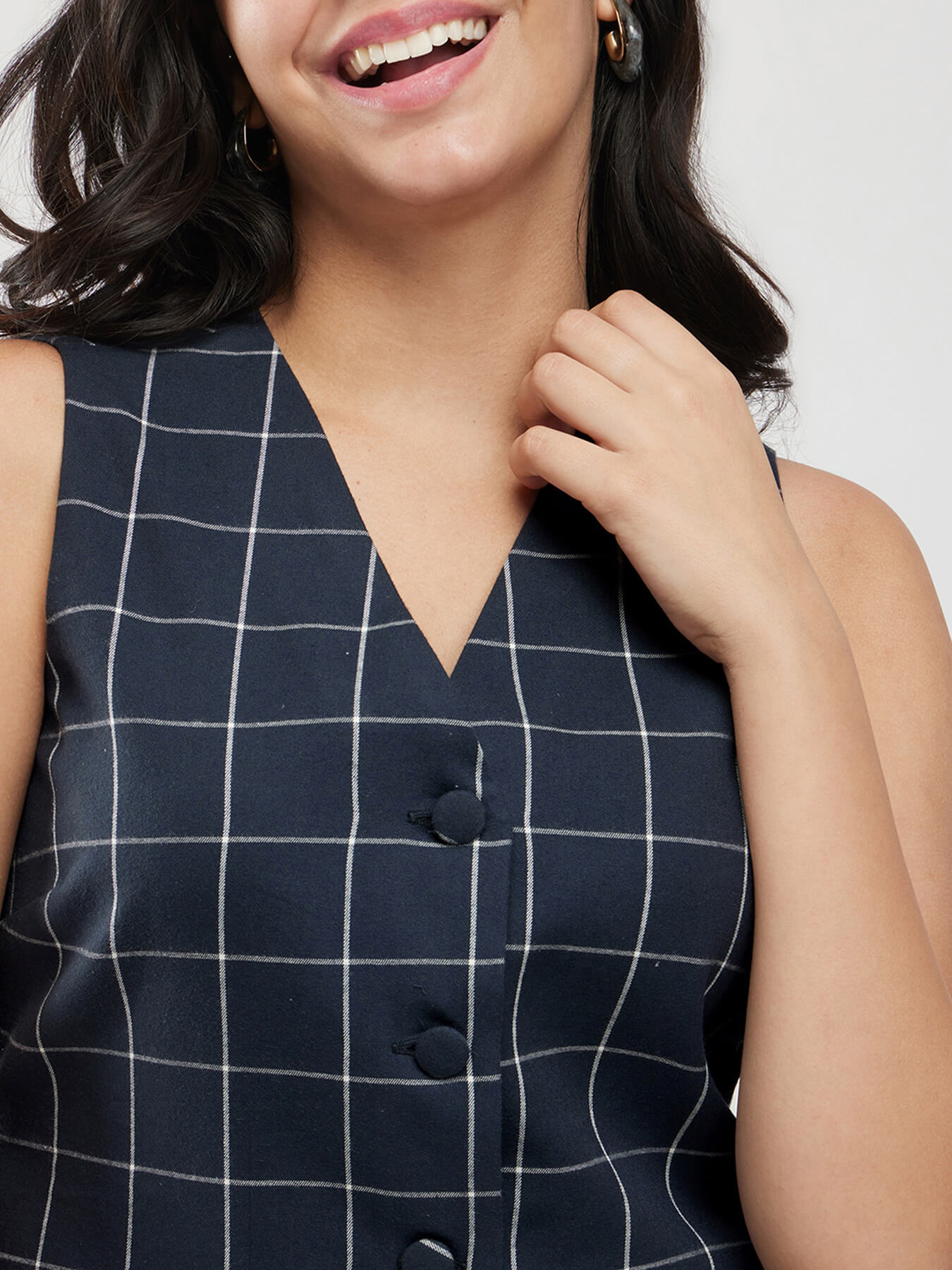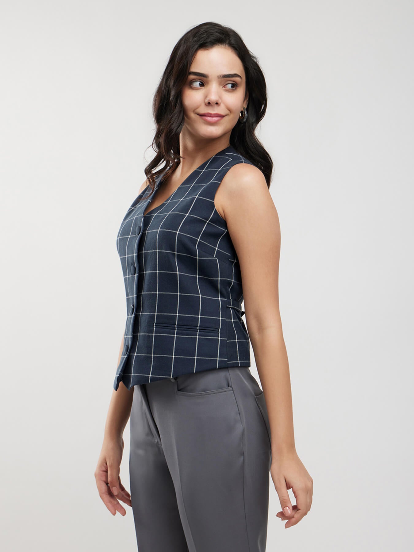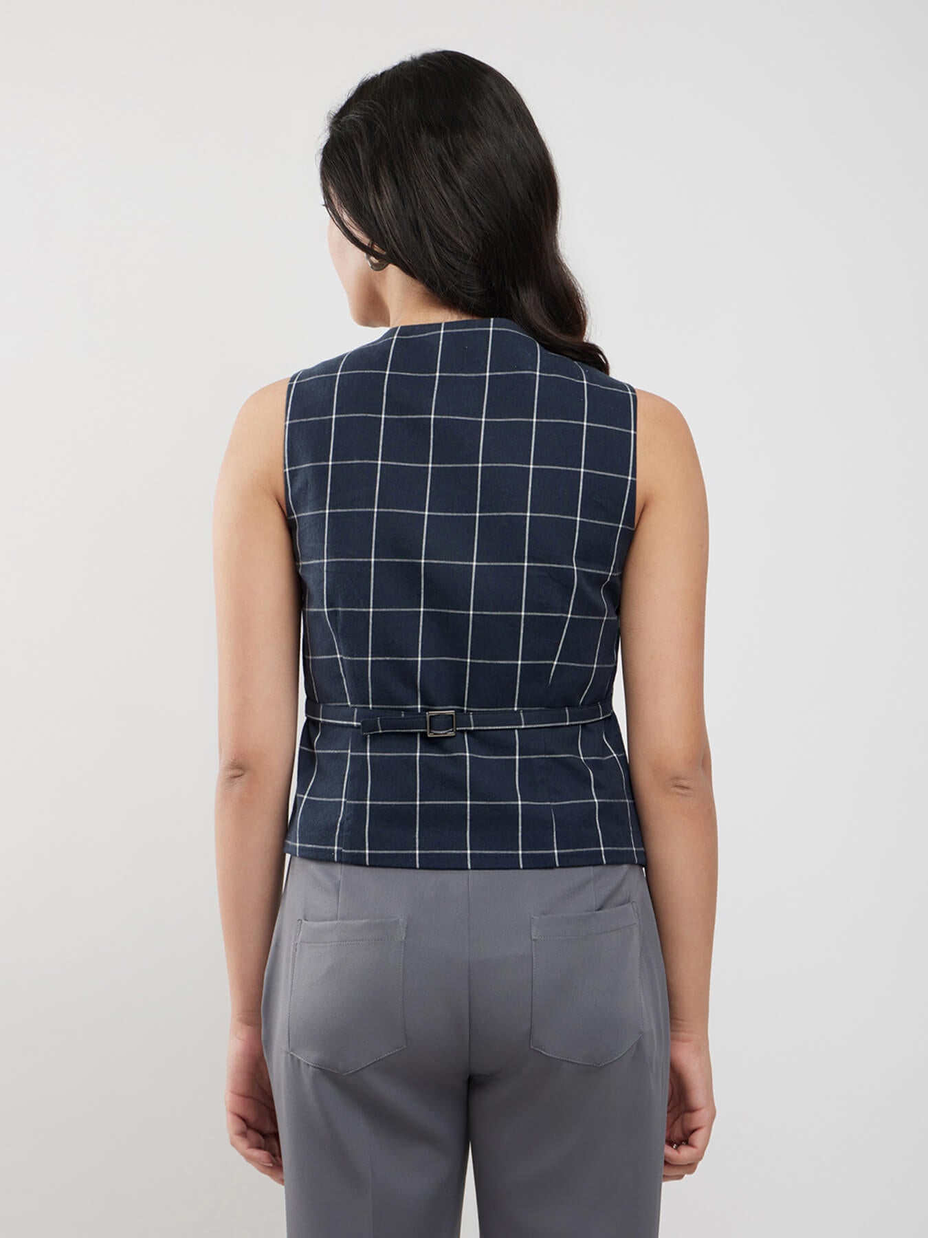 Cotton Checkered Waistcoat - Navy Blue