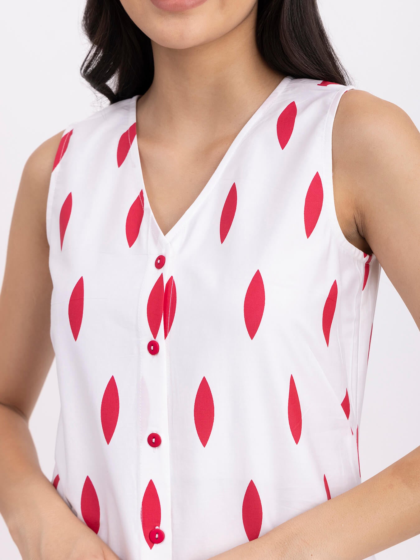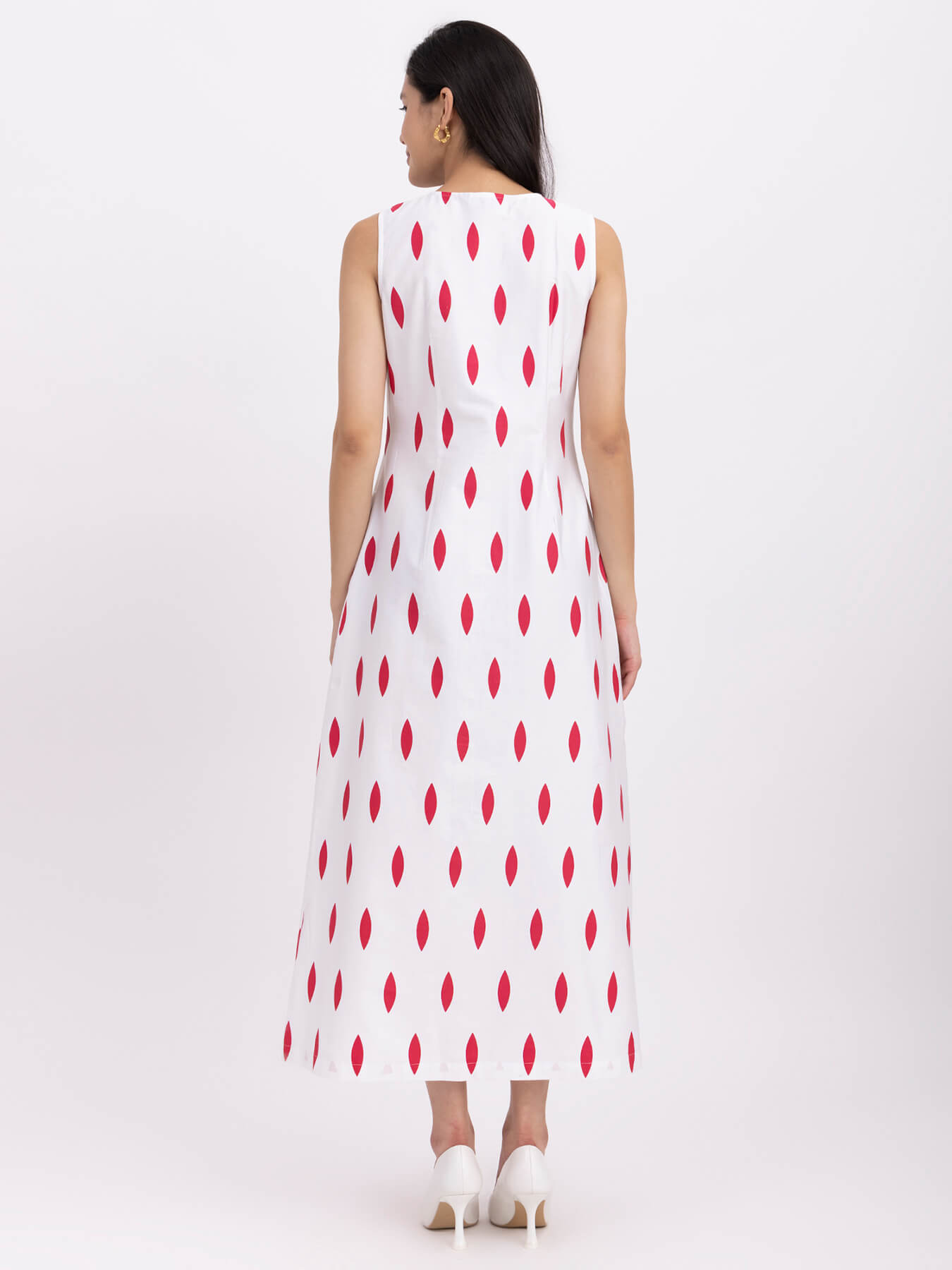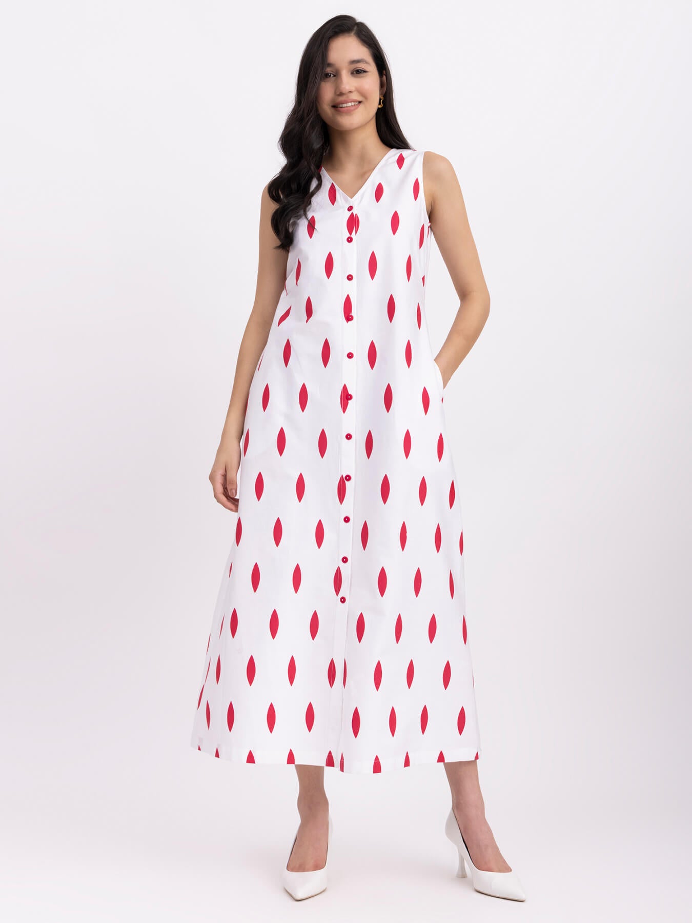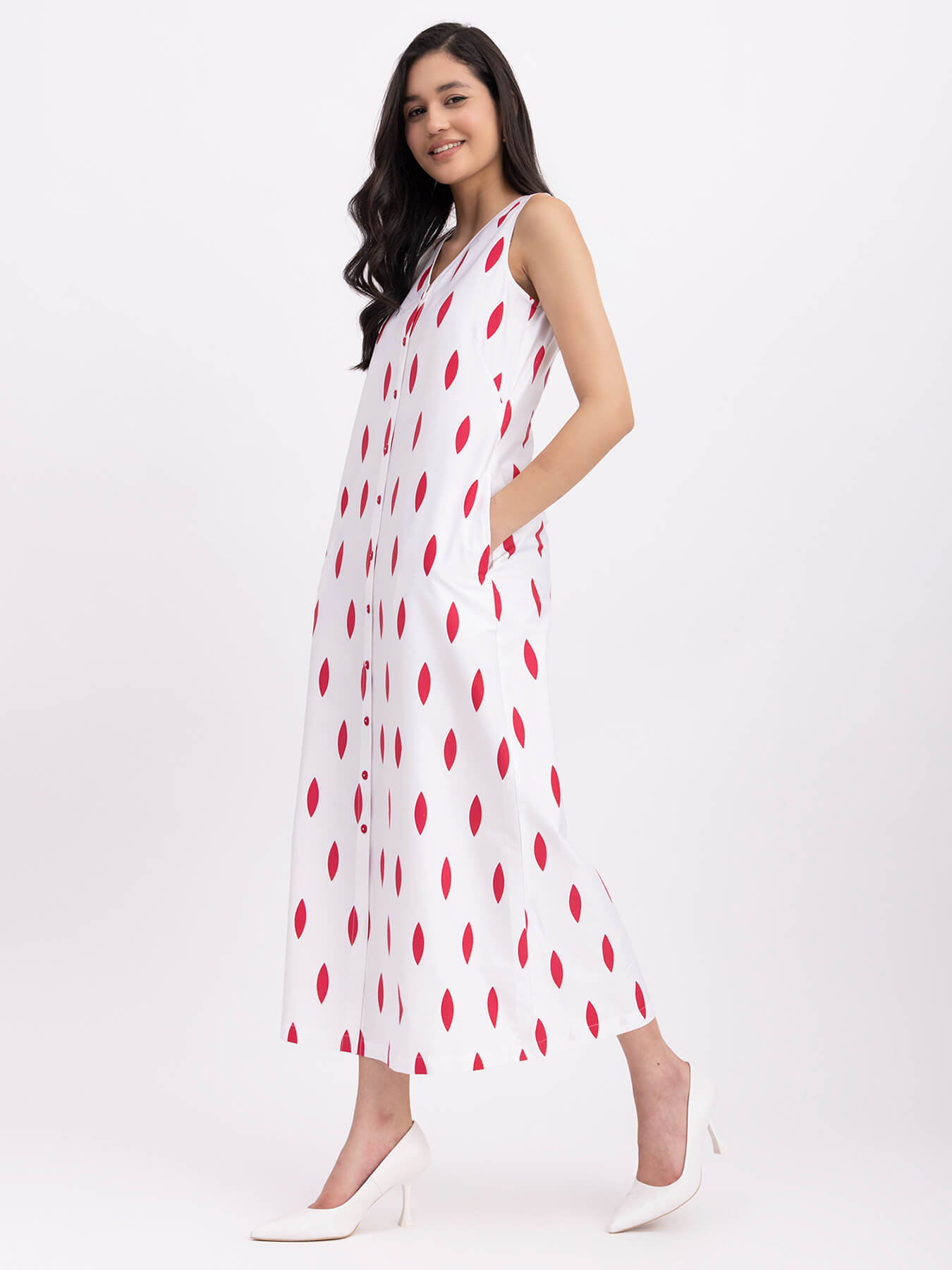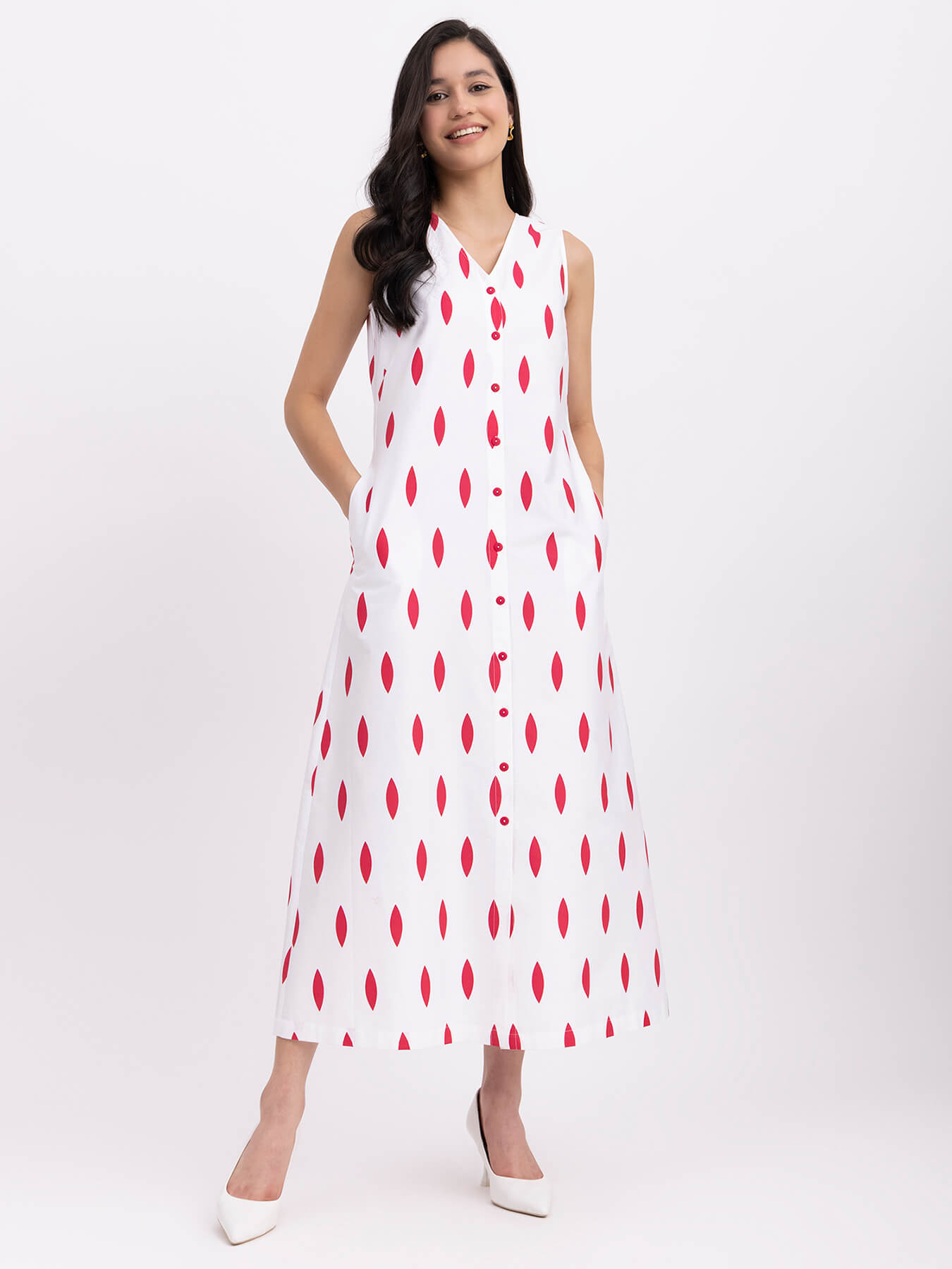 This white and red geometric print sleeveless dress has a V-neck and button down detail. Made from Cotton Satin, it is soft and comfortable to wear.