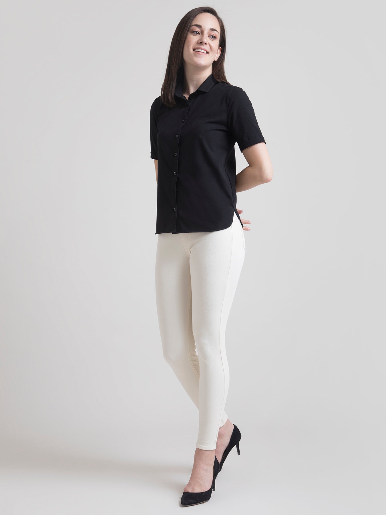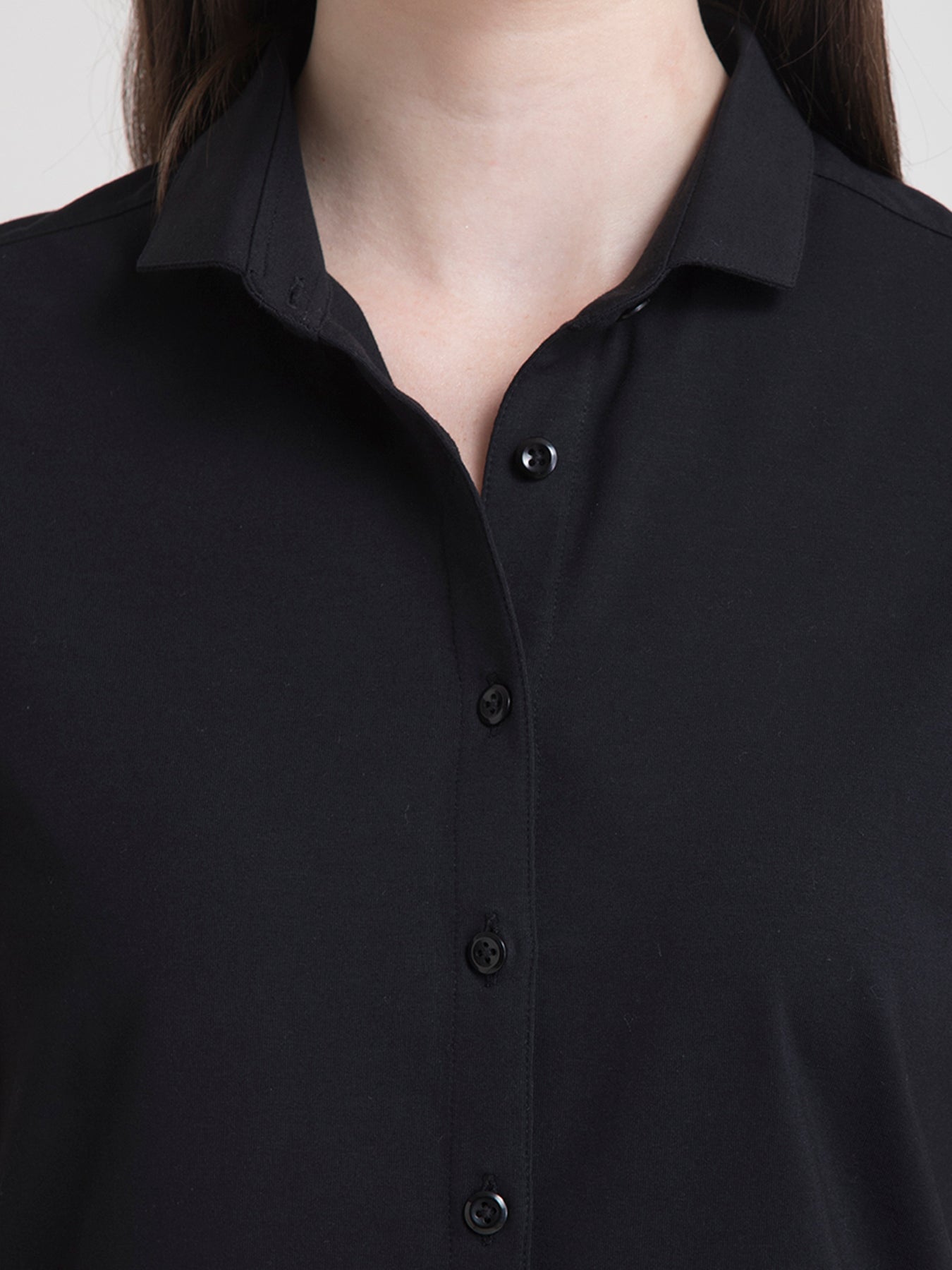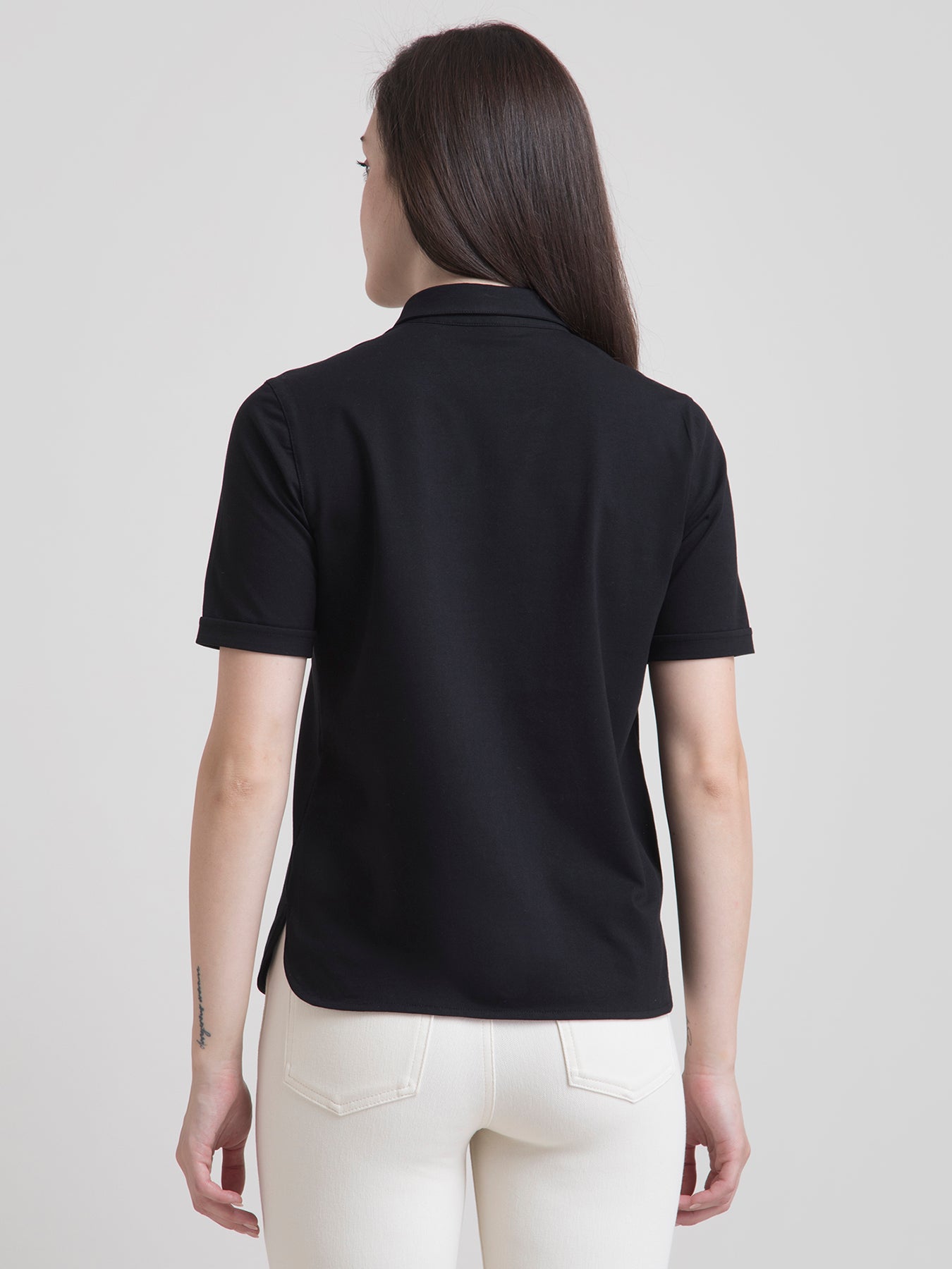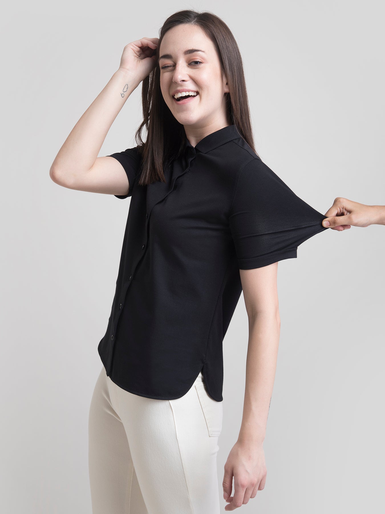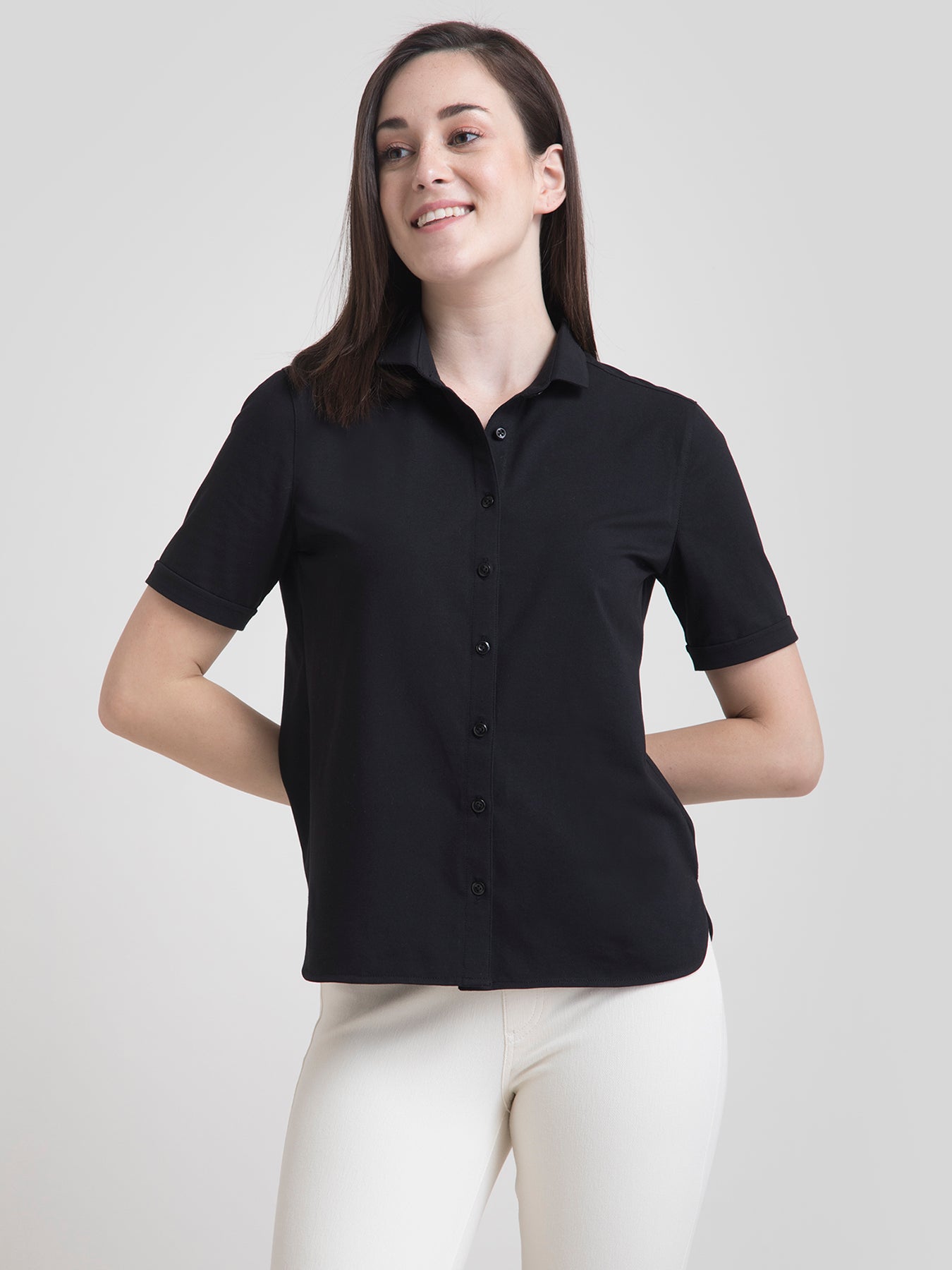 This classic black shirt is knitted. It has a Shirt collar, button placket, and short sleeves. Made from Cotton, it has extra stretch, is breathable and comfortable.