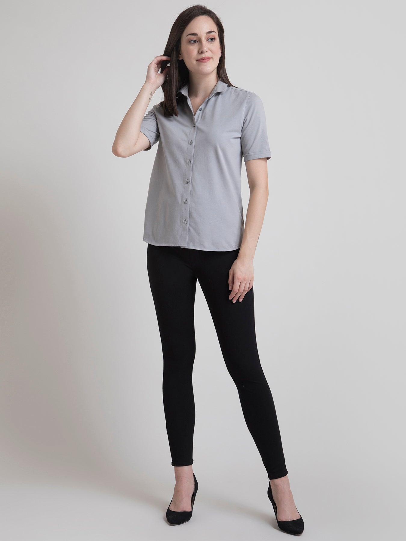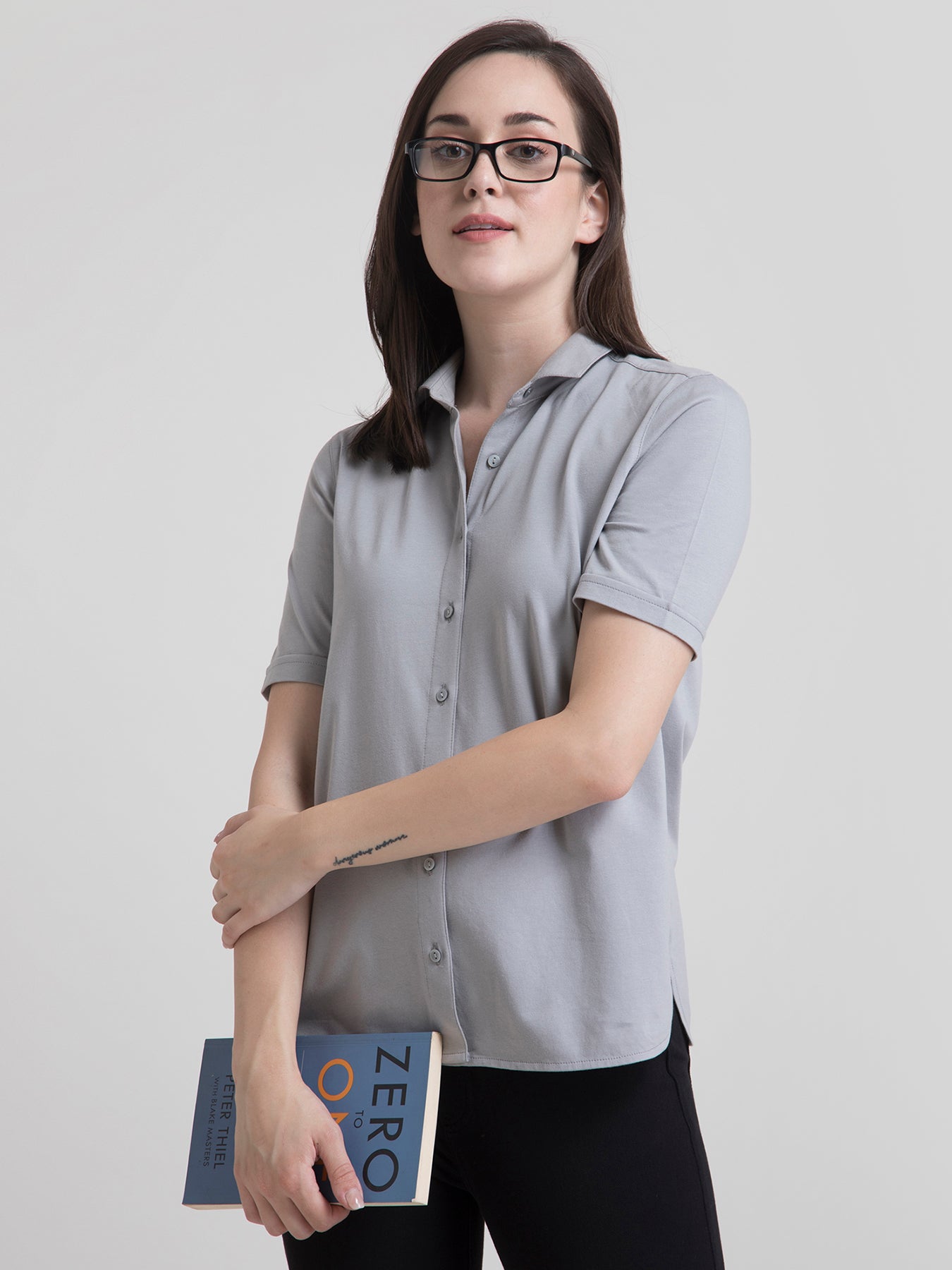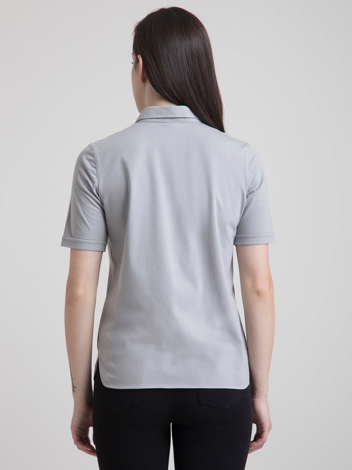 This classic grey shirt is knitted. It has a Shirt collar, button placket, and short sleeves. Made from Cotton, it has extra stretch, is breathable and comfortable.