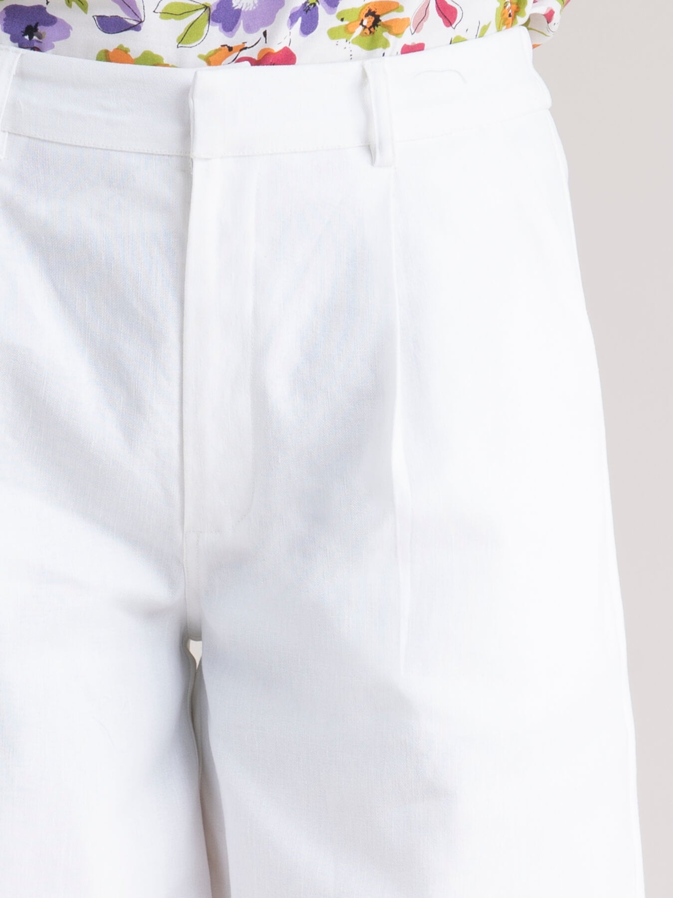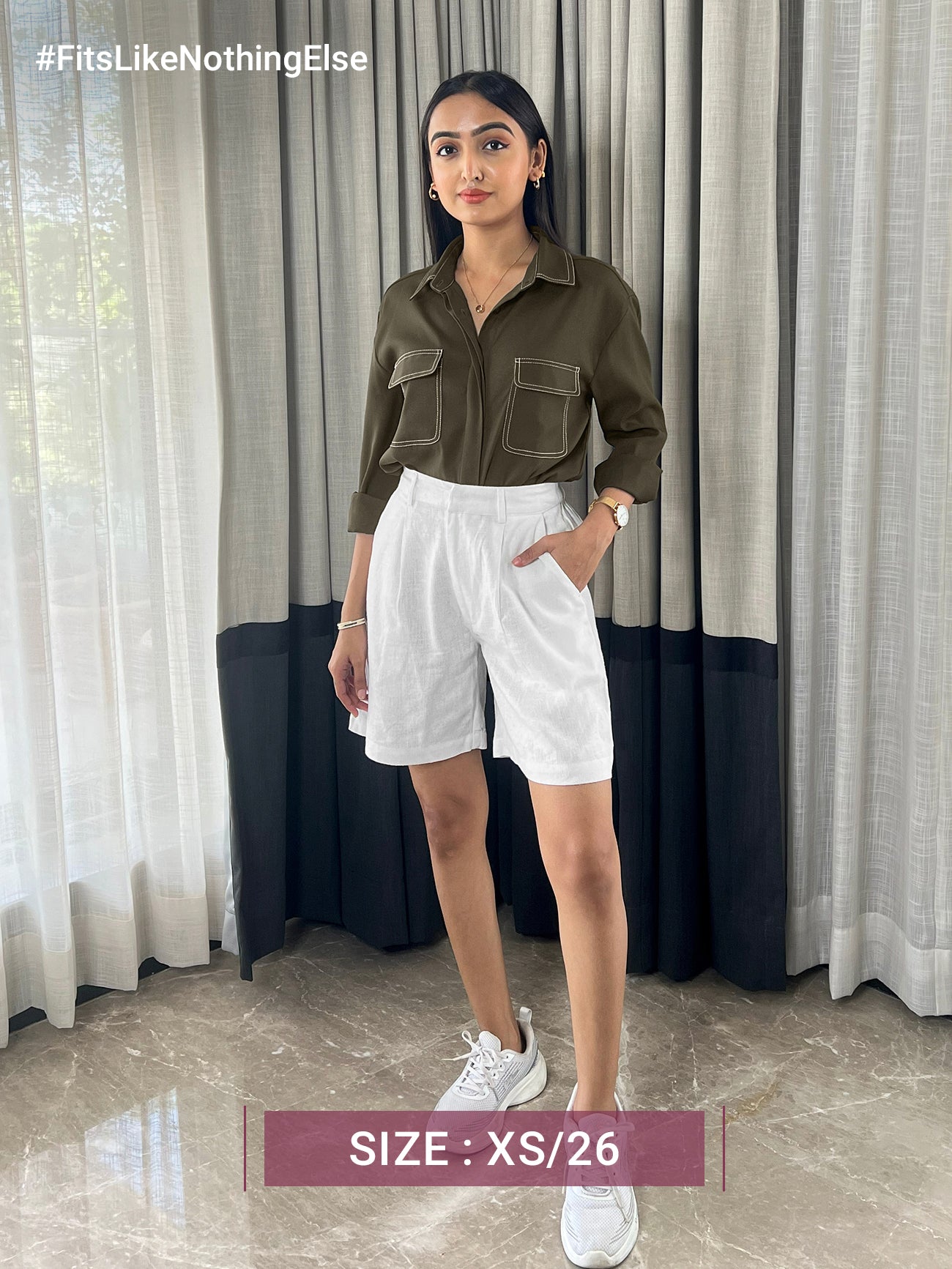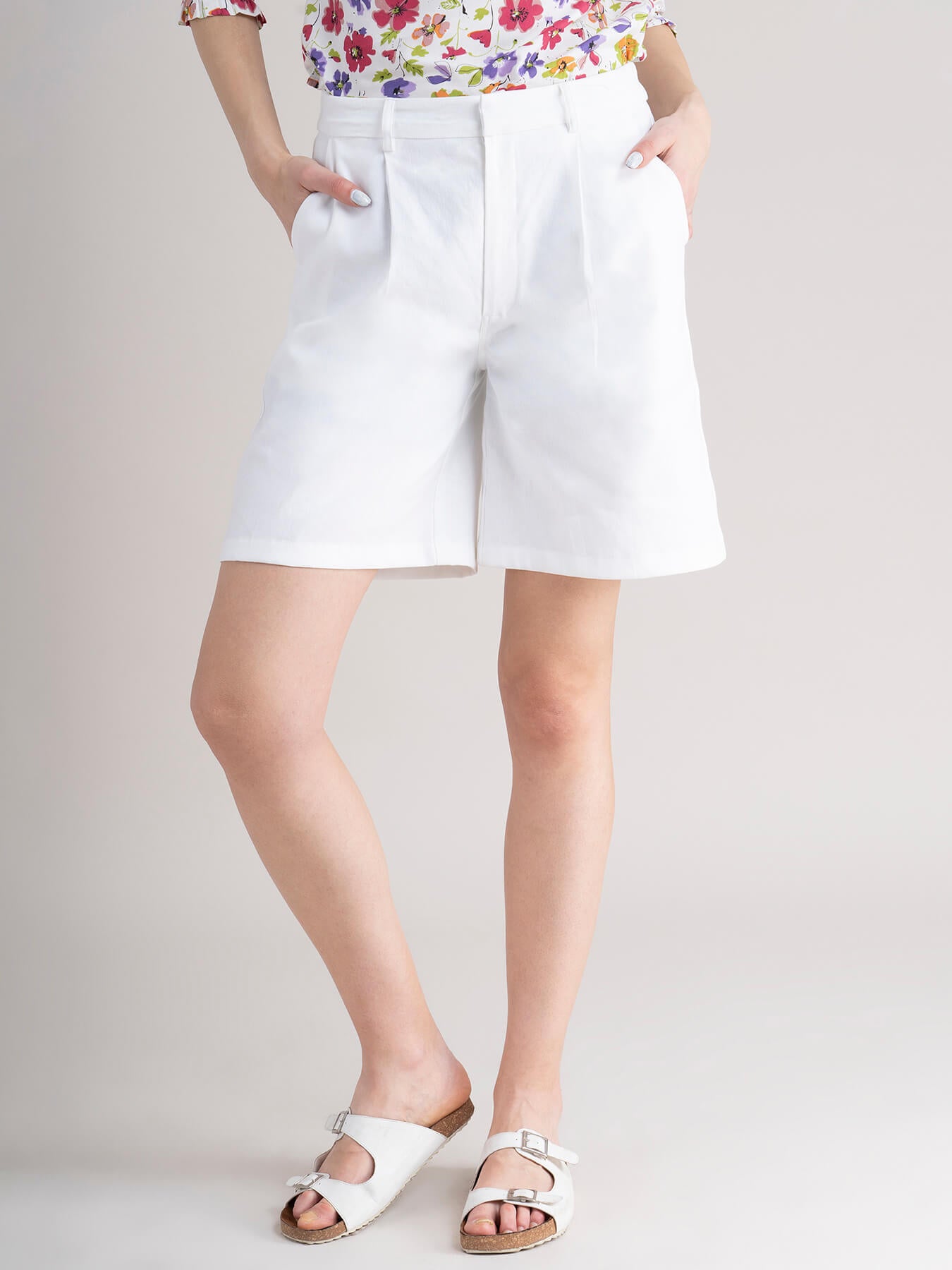 These white mid-rise shorts are comfortable and ideal for any travel. These above knee length shorts have pockets and hook and bar opening. Made from Cotton Linen, these are breathable and comfortable.
