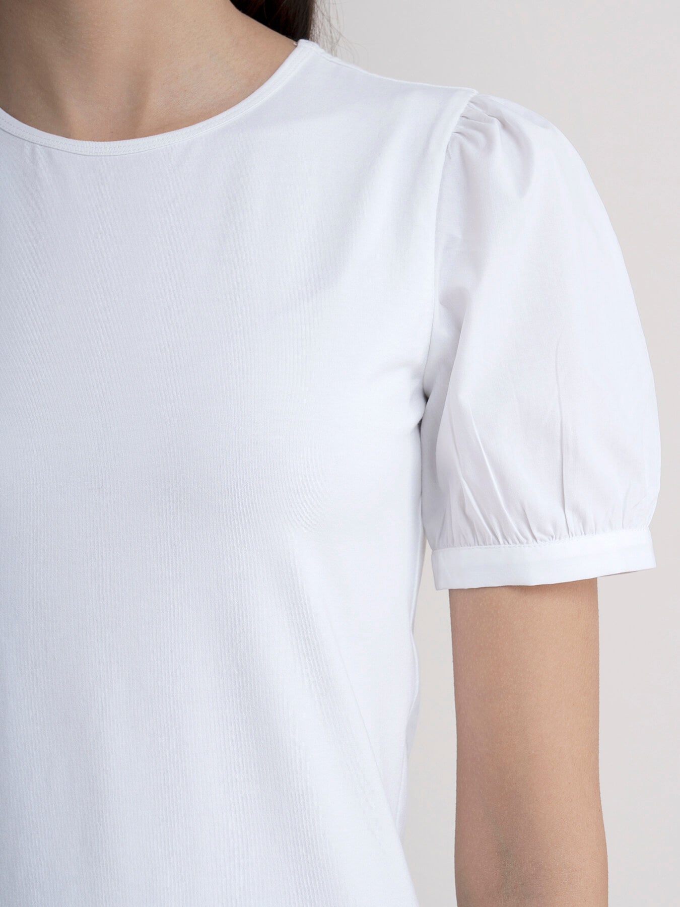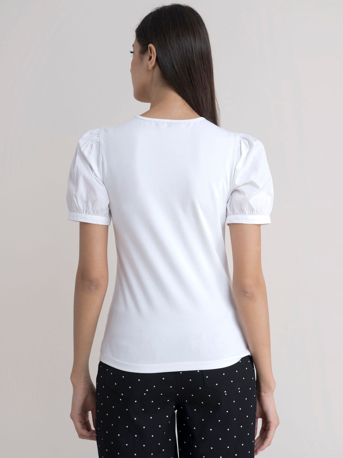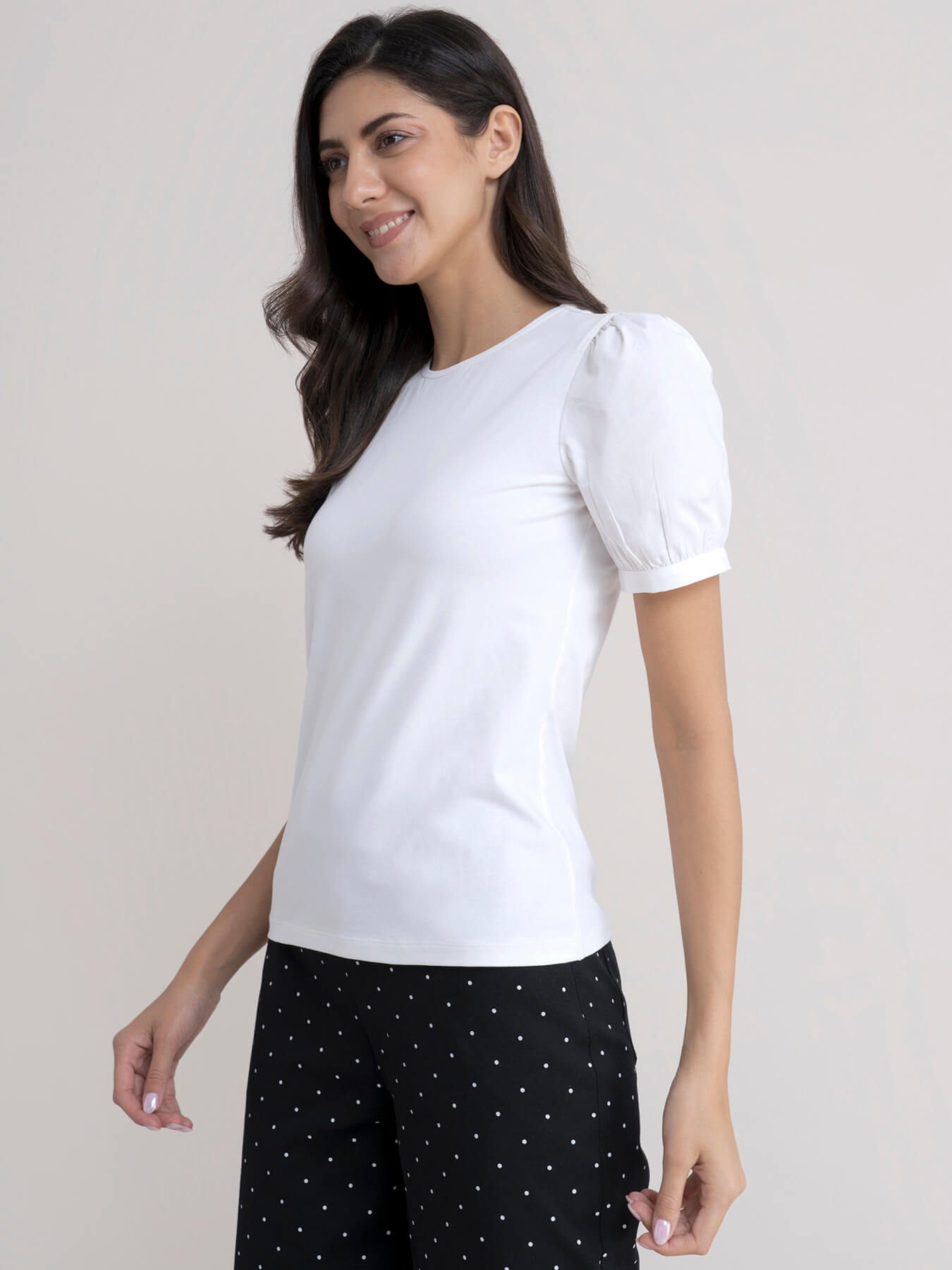 This white slim fit, knit tee has a crew neck and short puff sleeves. Made from Cotton Lycra, it is breathable, stretchable, soft, anti-wrinkle and comfortable.
