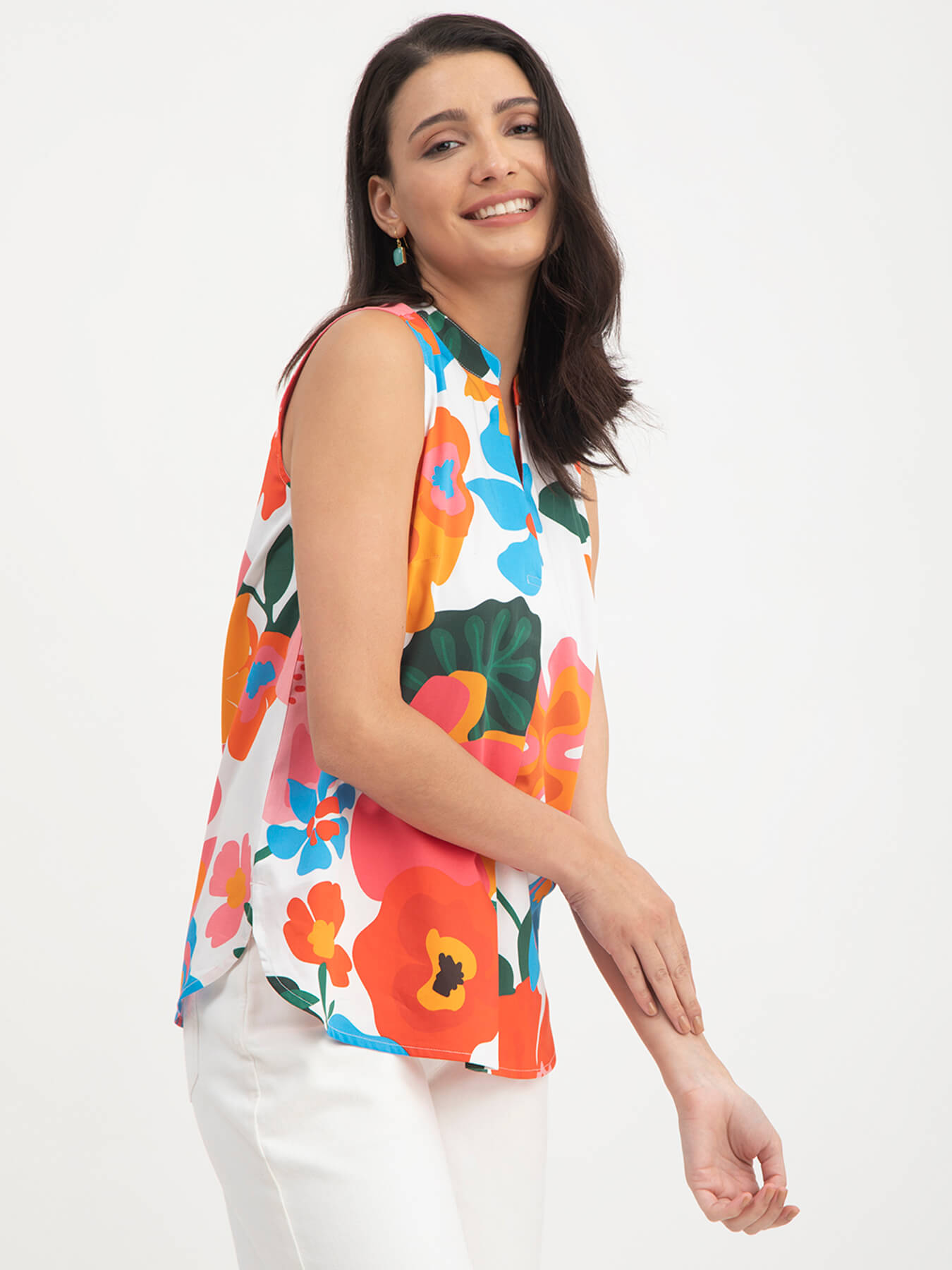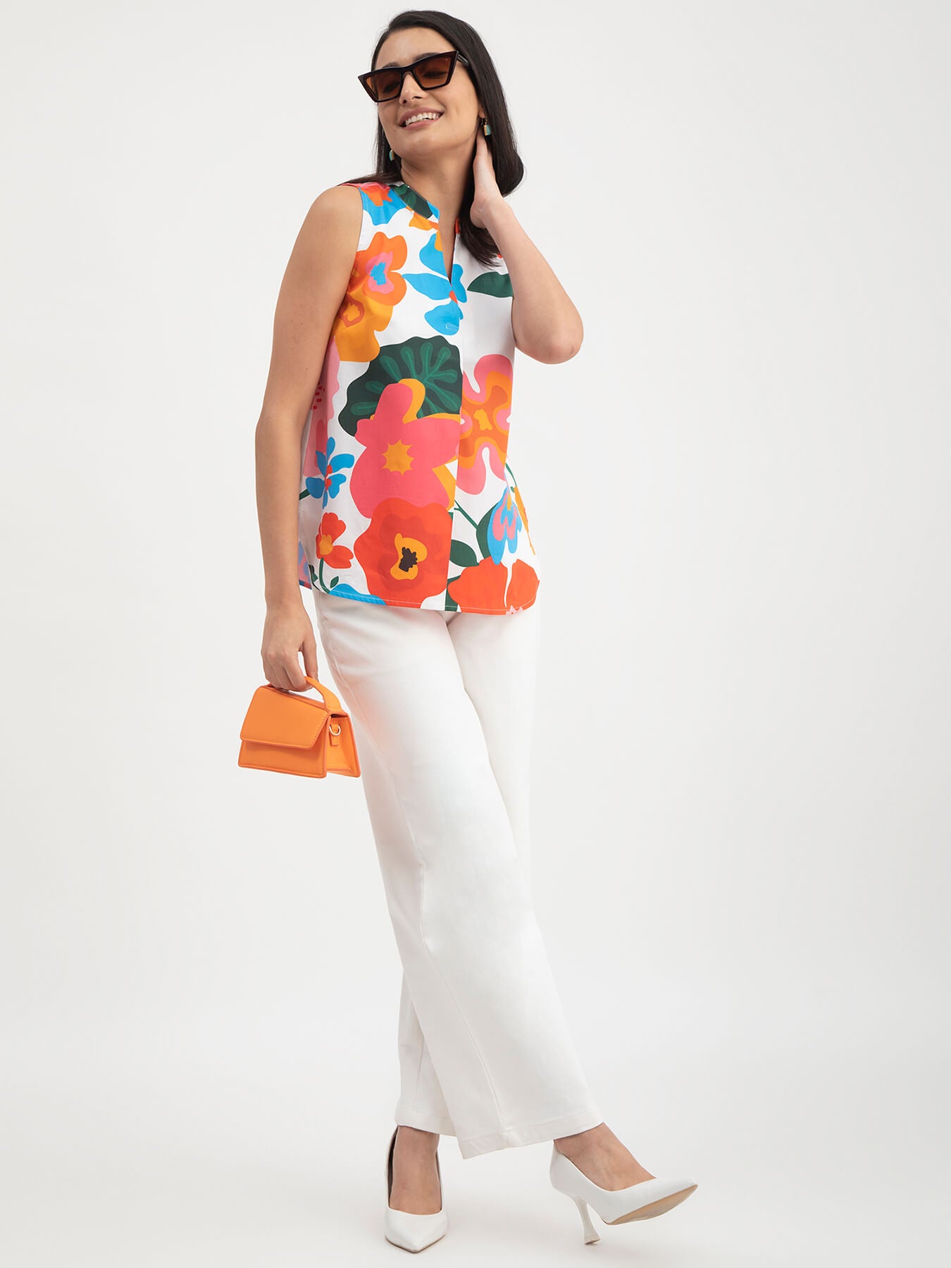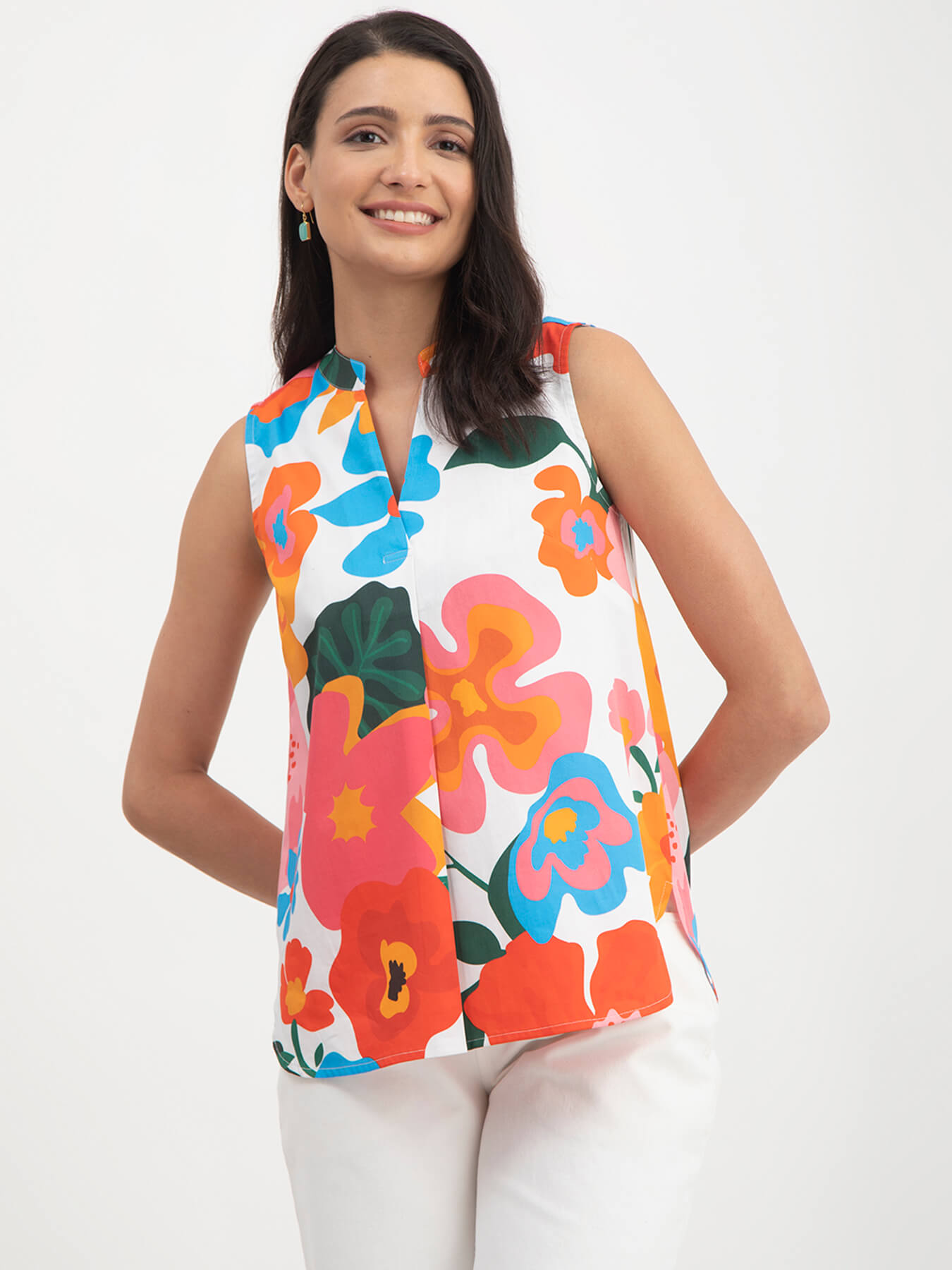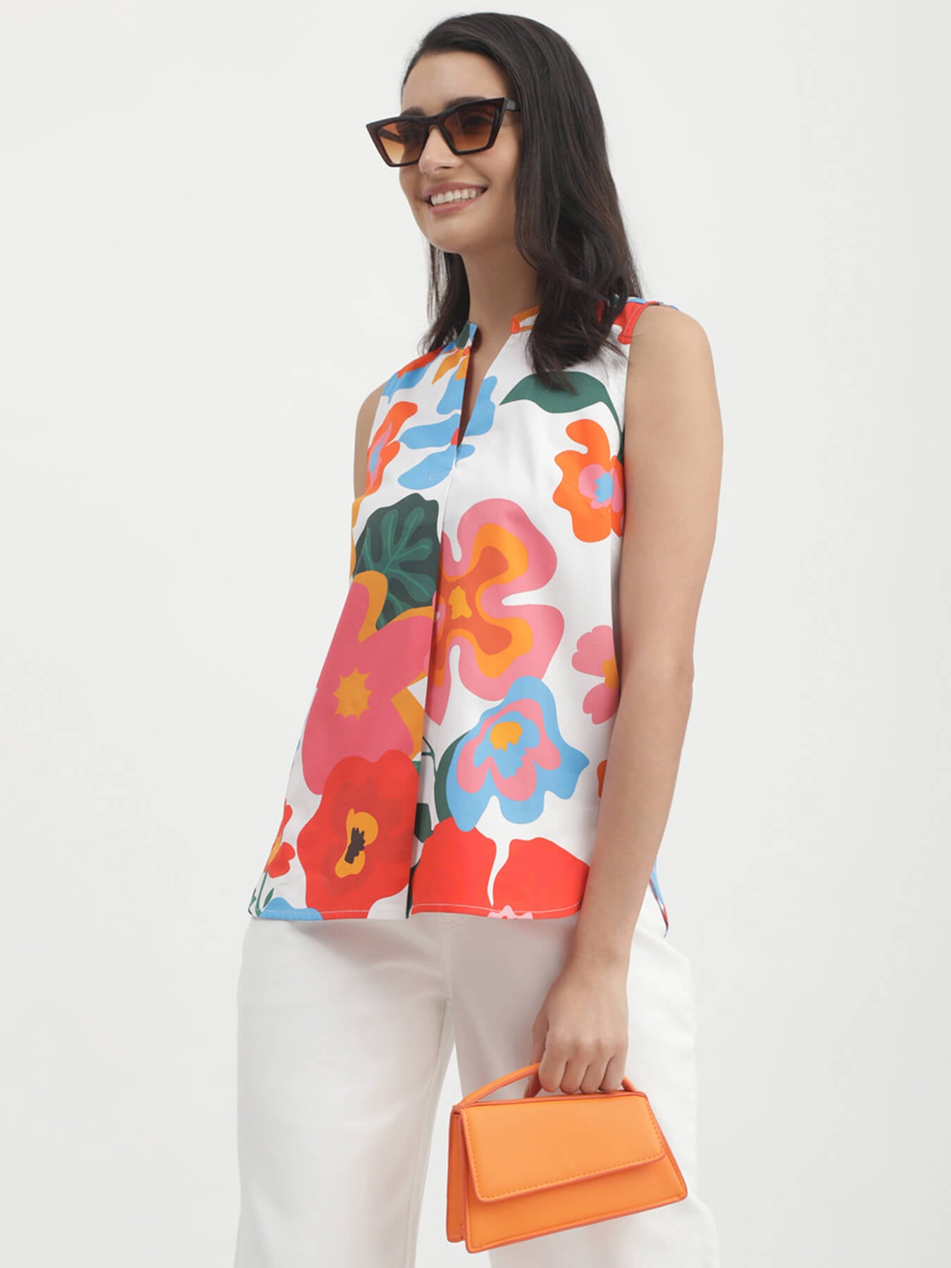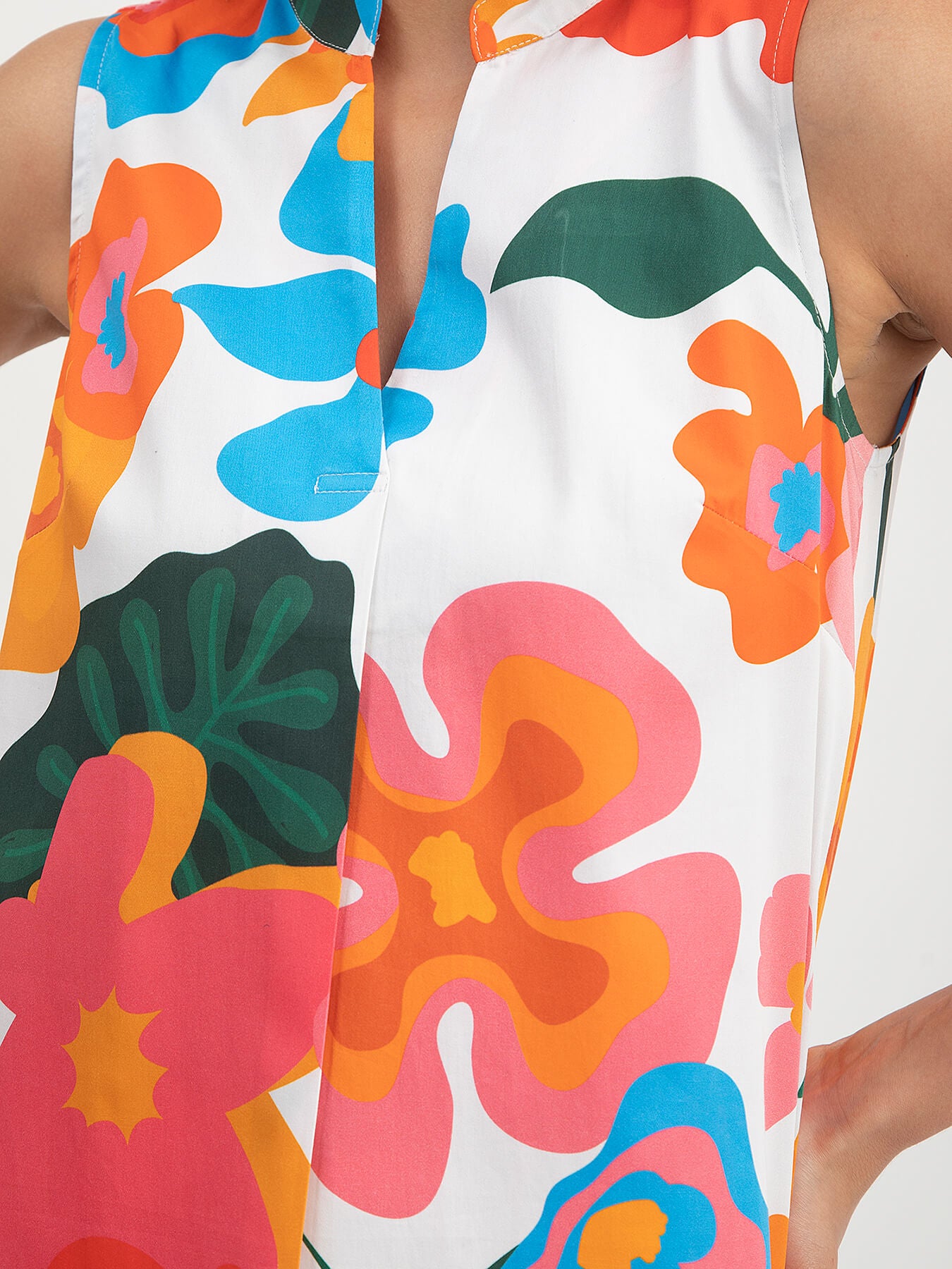 This multicolour sleeveless top has a mandarin neck and floral print detail. Made from Cotton Satin, it is soft and comfortable to wear.