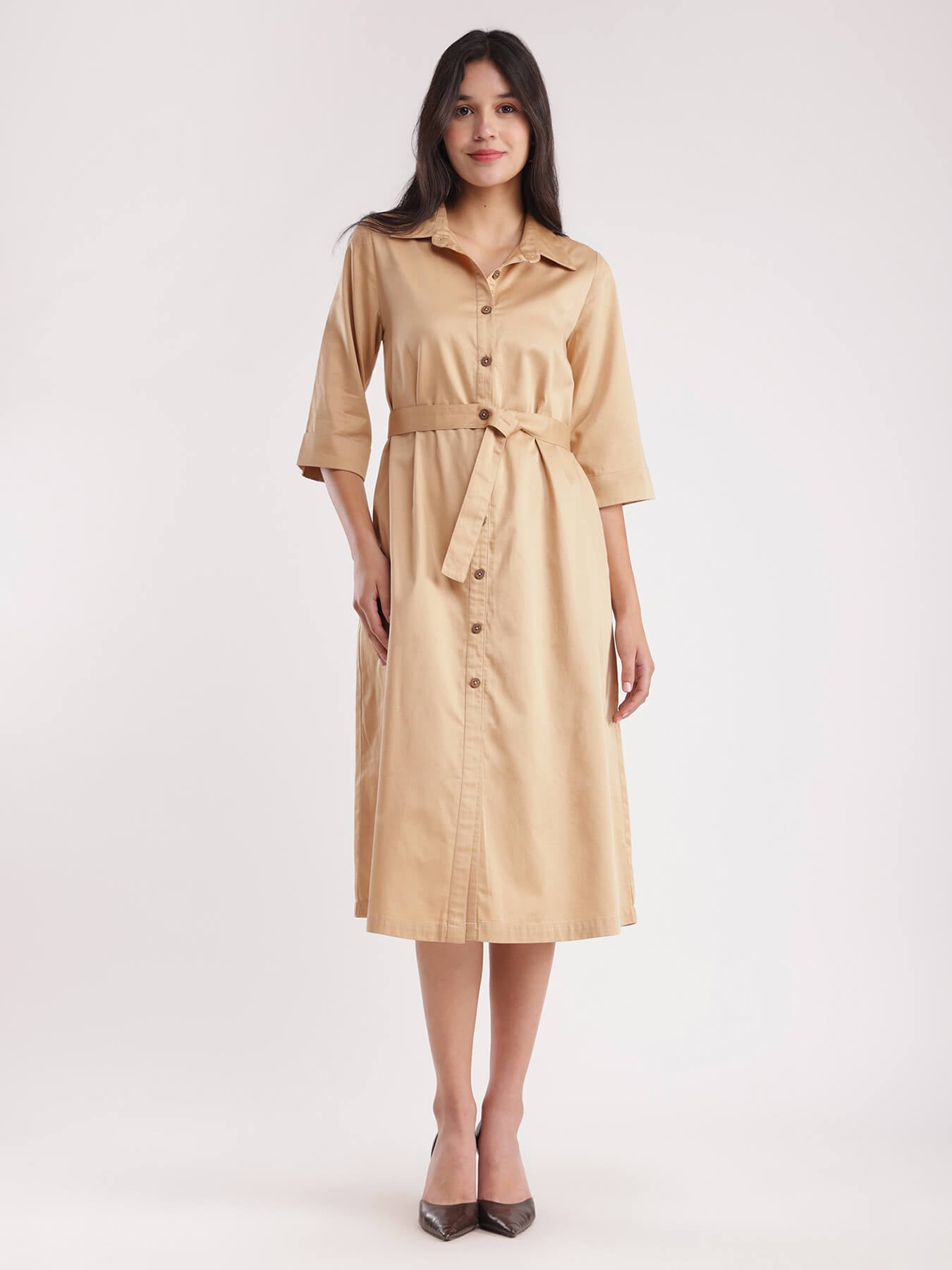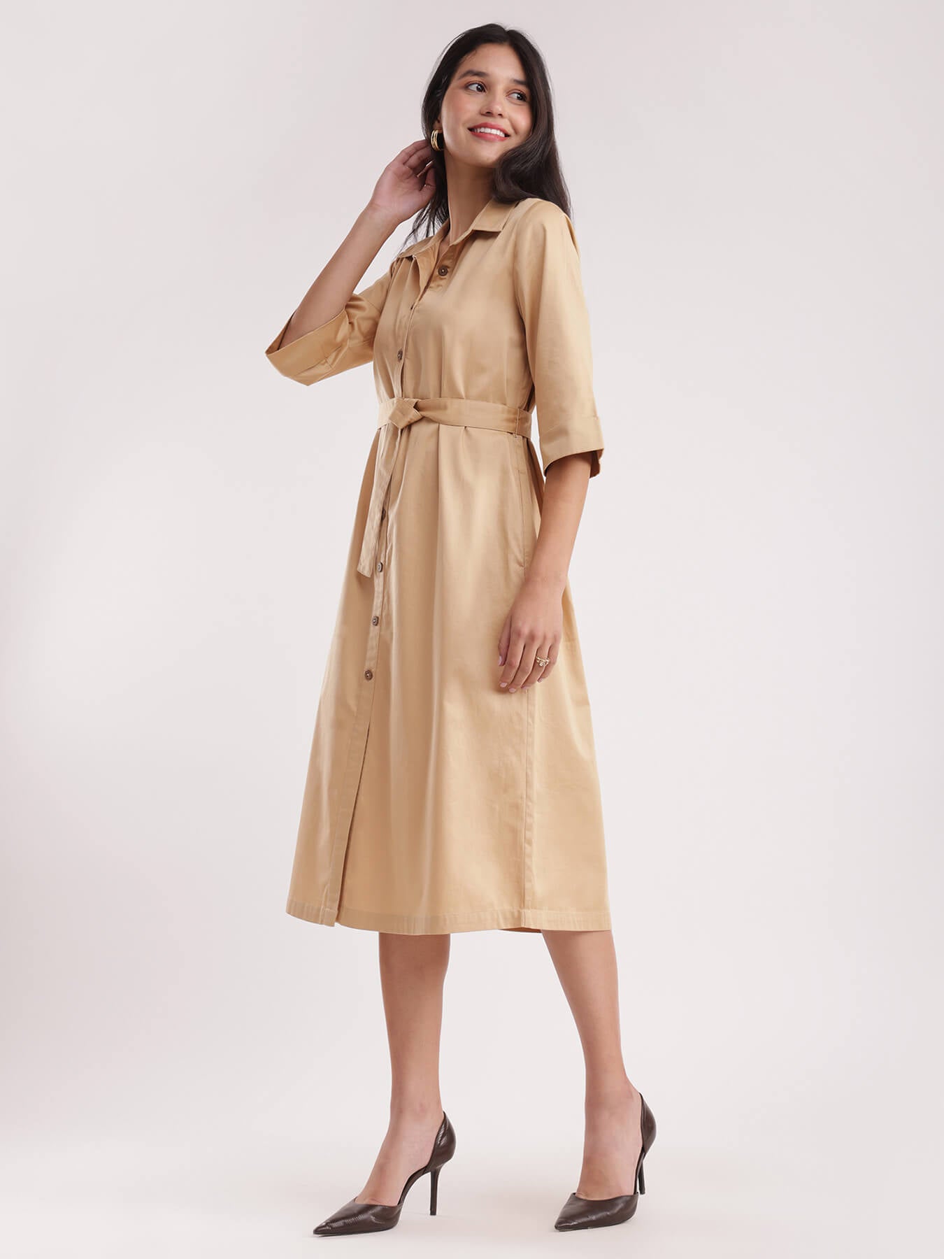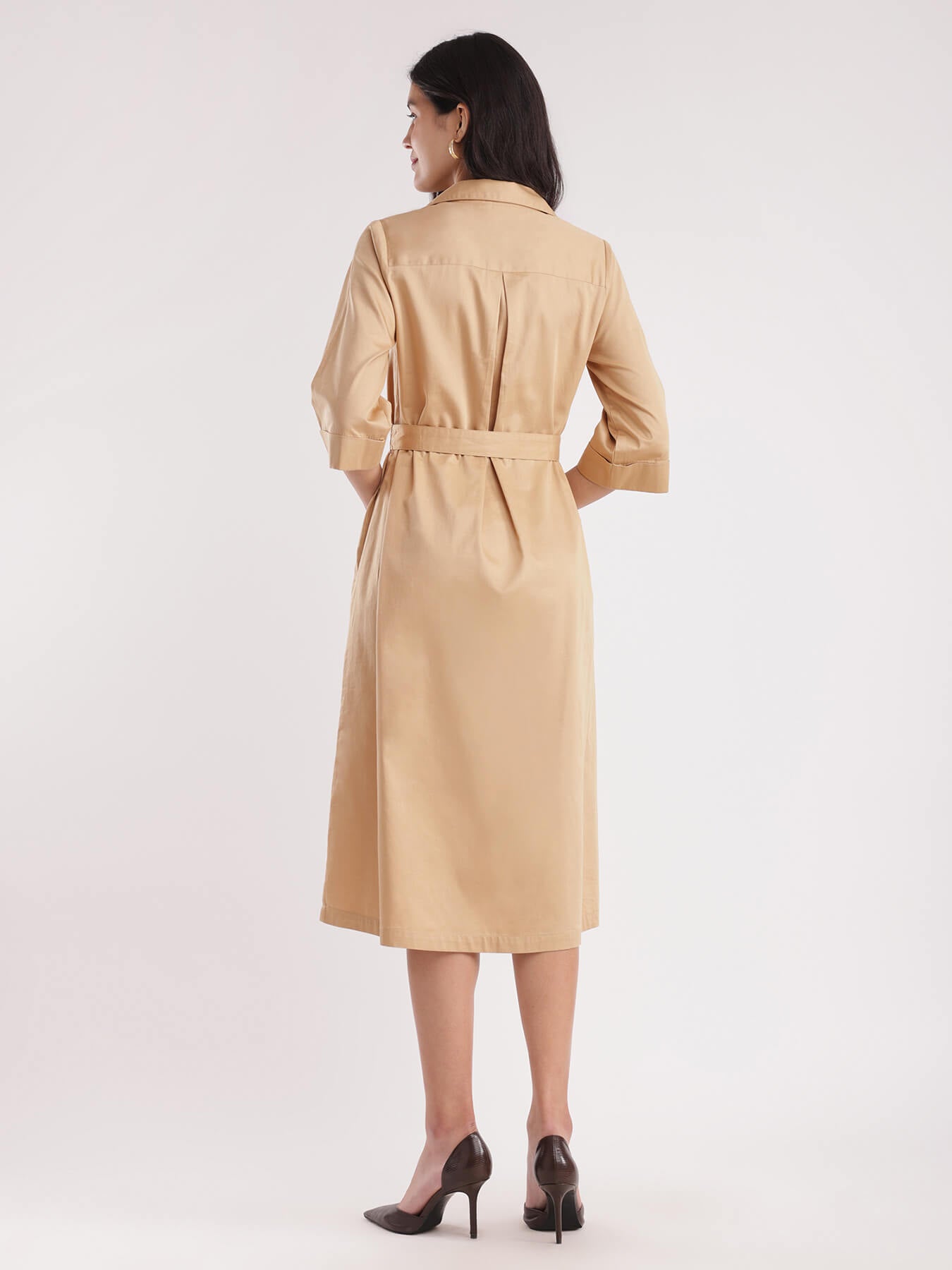 Cotton Satin Shirt Dress - Beige