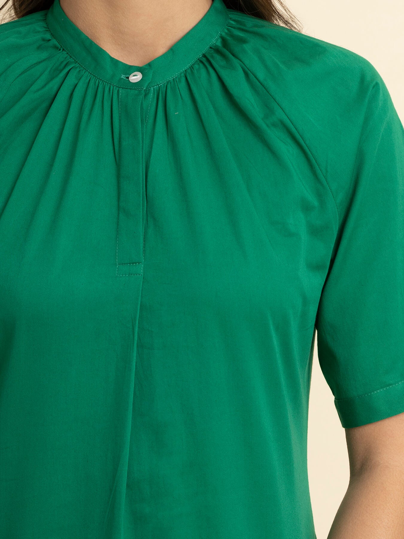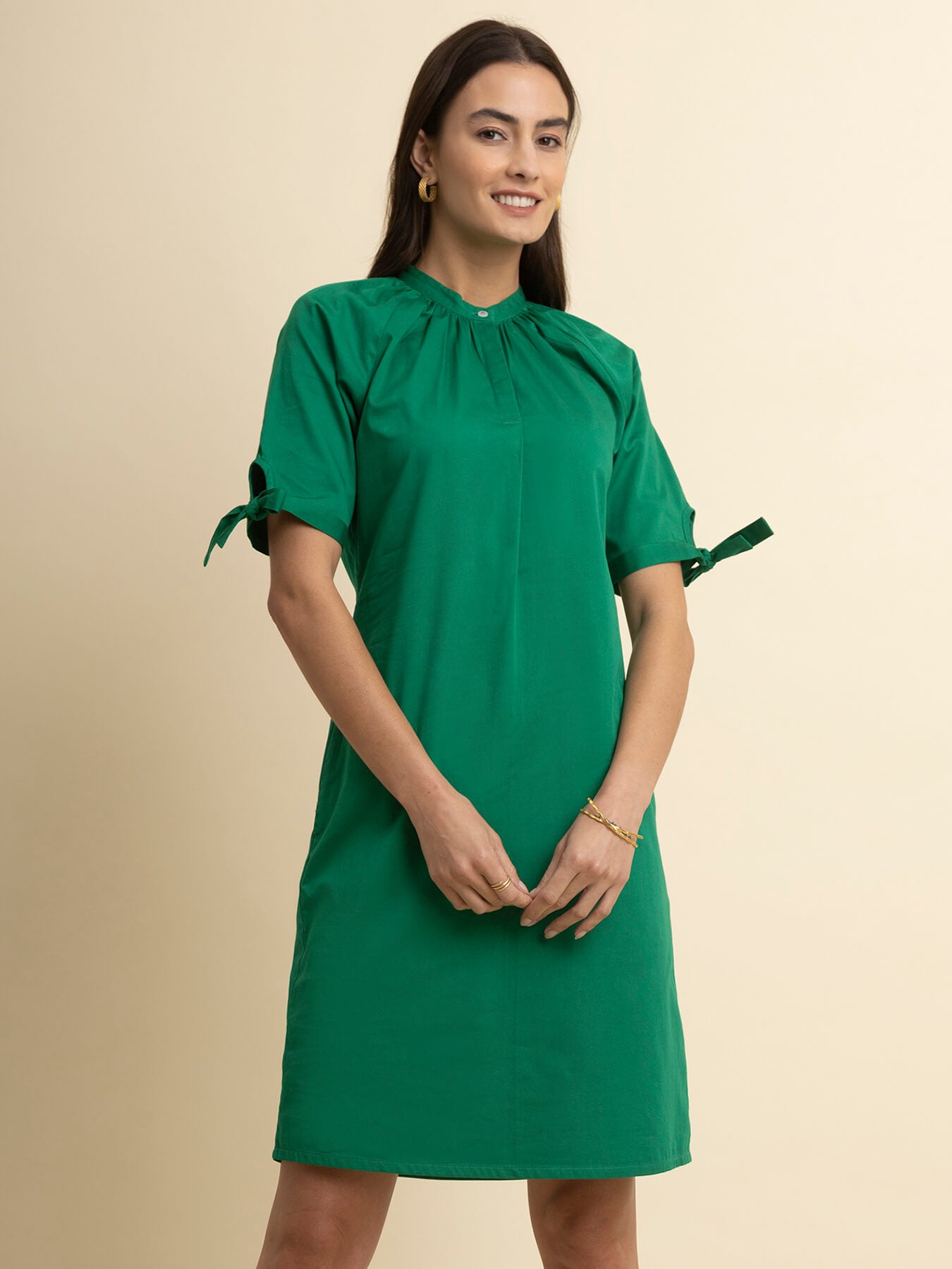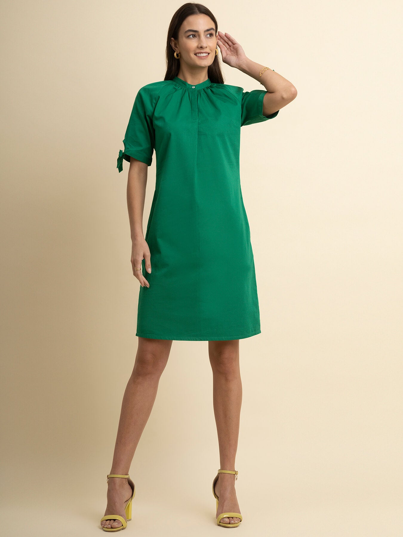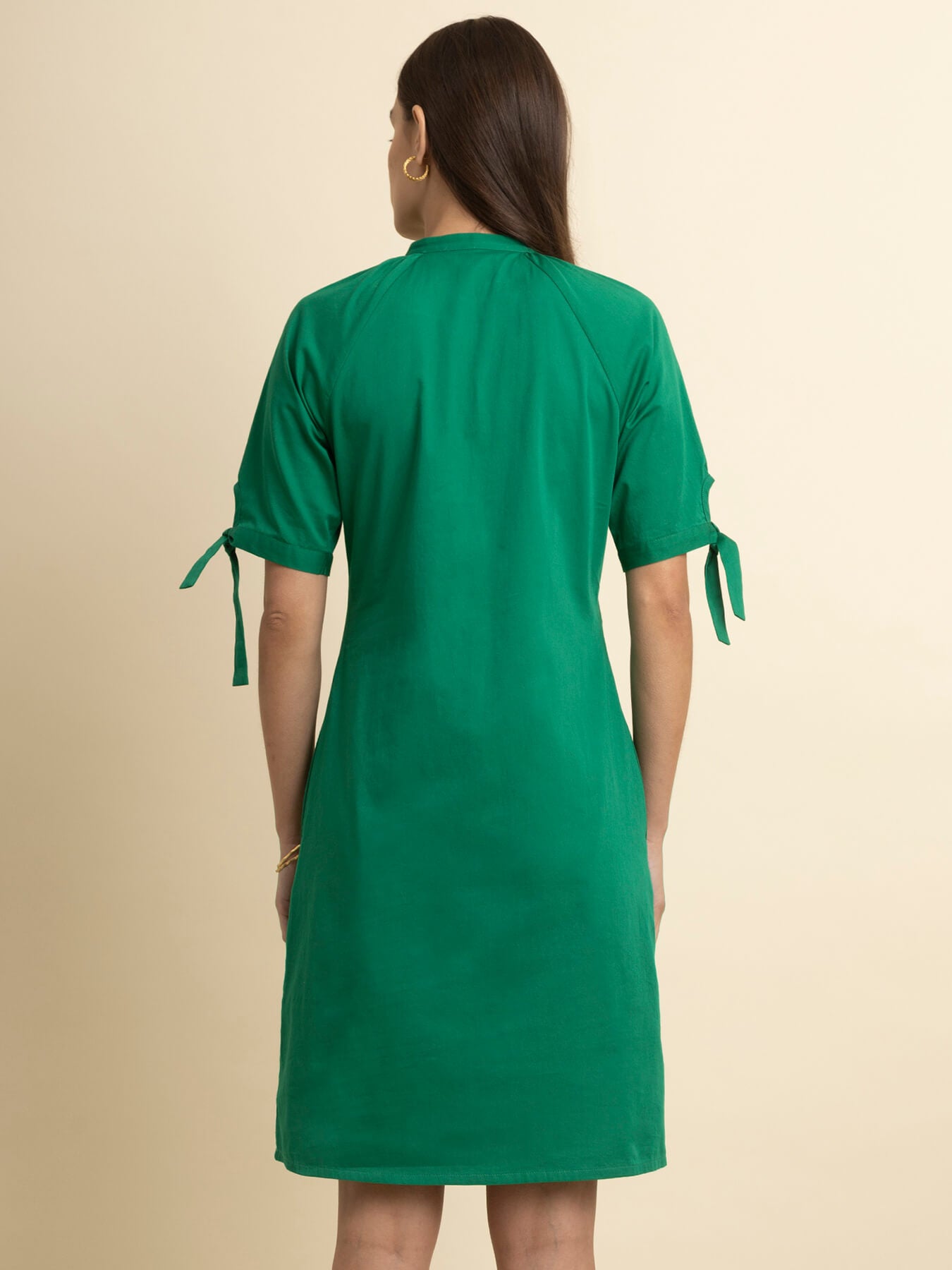 This green dress has a mandarin collar and tie-up sleeves. Made from Cotton Satin, it is soft and comfortable to wear.