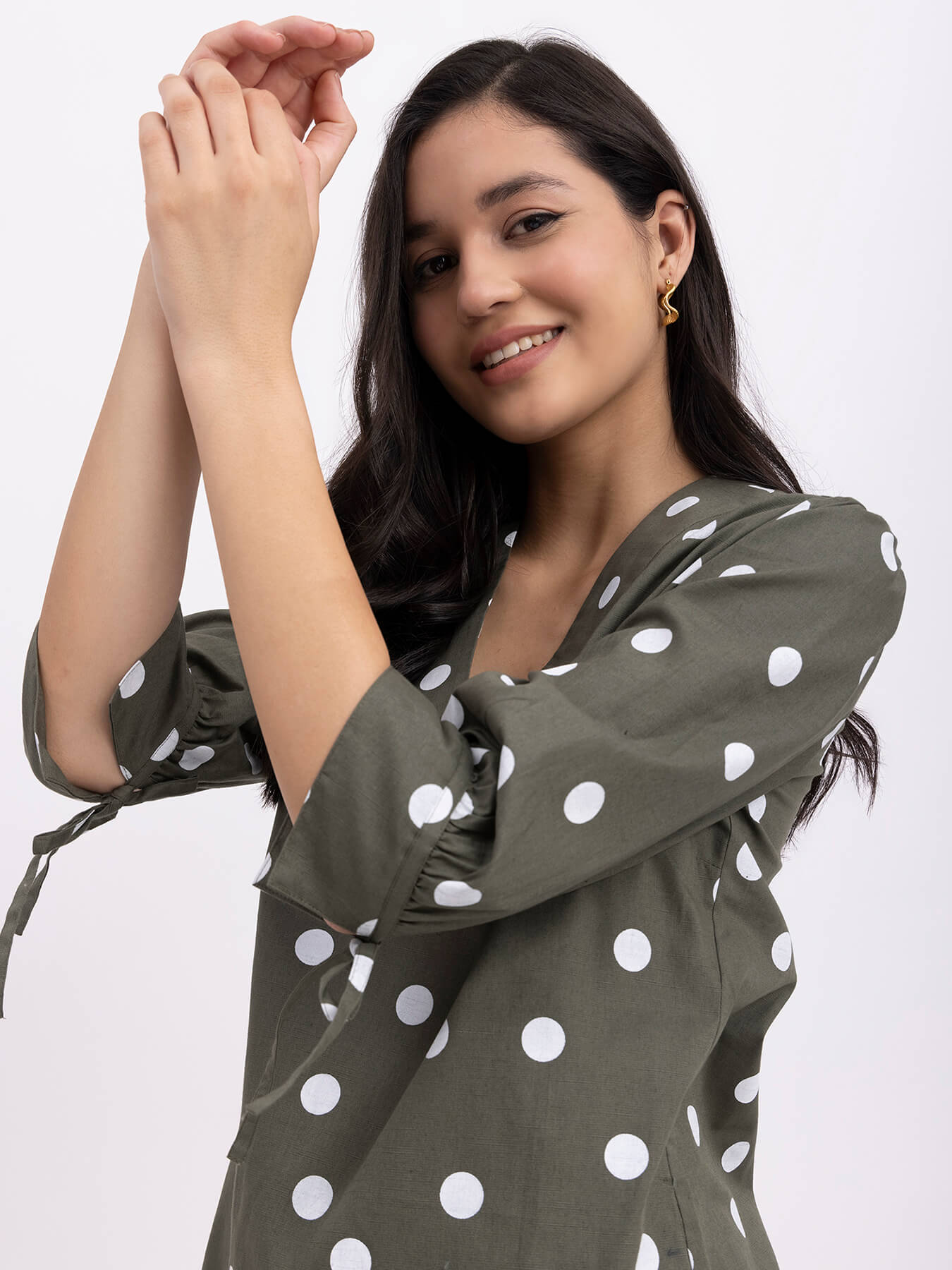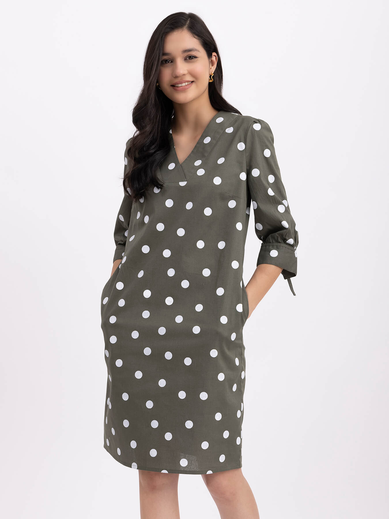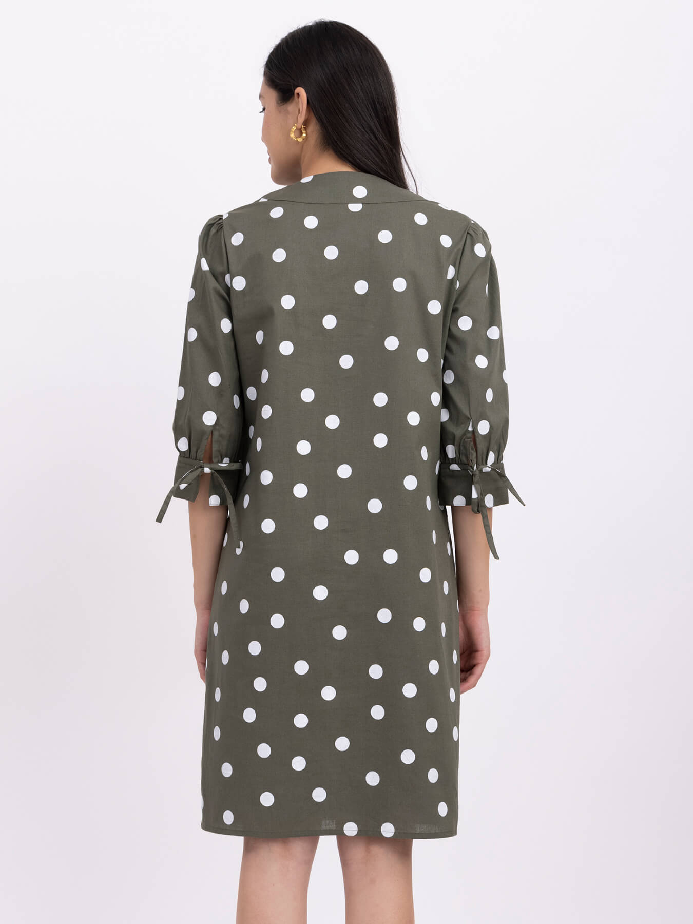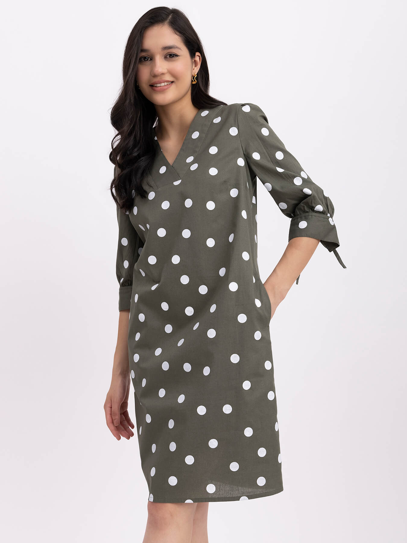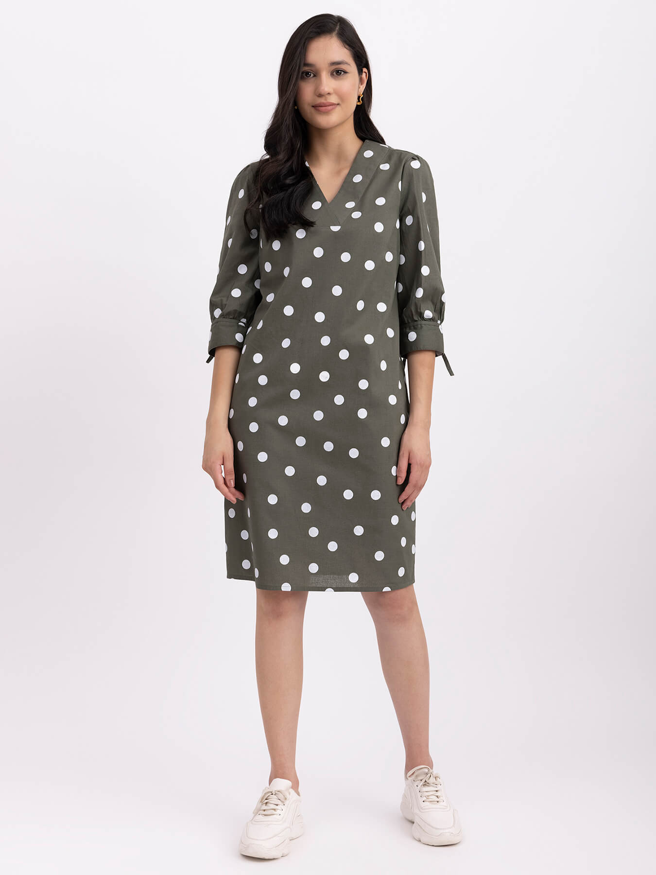 This olive and white polka dot dress has a V-neck and three-quarter sleeves with tie-up detail. Made from Cotton Linen, it is soft and comfortable to wear.