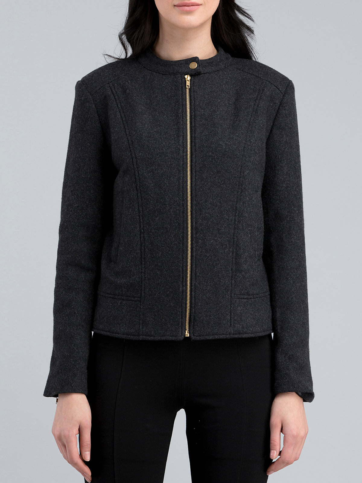 This dark grey jacket has a mandarin collar, full sleeves and a herringbone weave. It is short, has a zipper closure and a relaxed fit. Made from Wool, it is warm, breathable and comfortable. The hem of the jacket is intended to fall according to the image on a height of 5'3" to 5'5". Colour may vary slightly according to screen settings and resolution.
