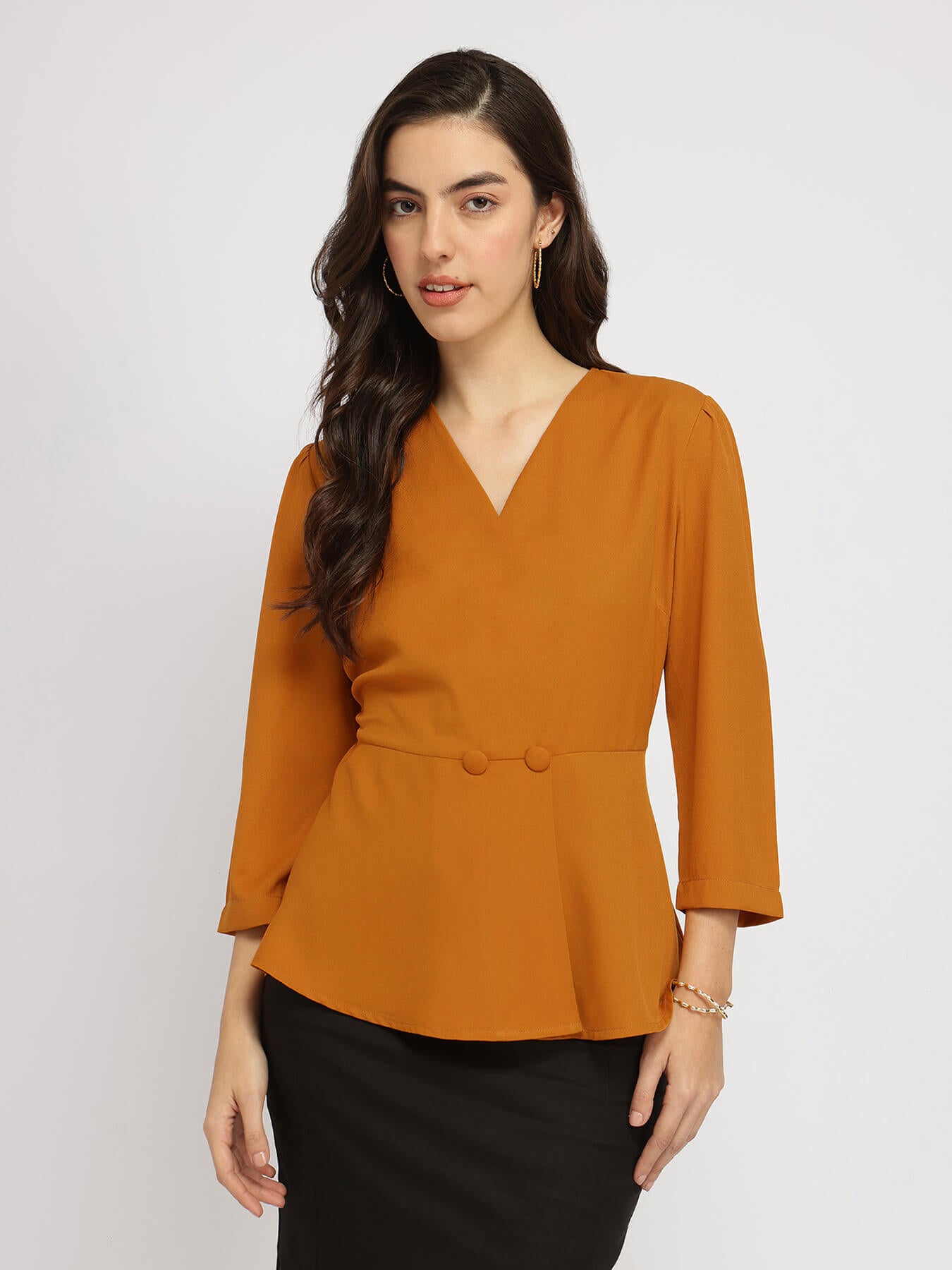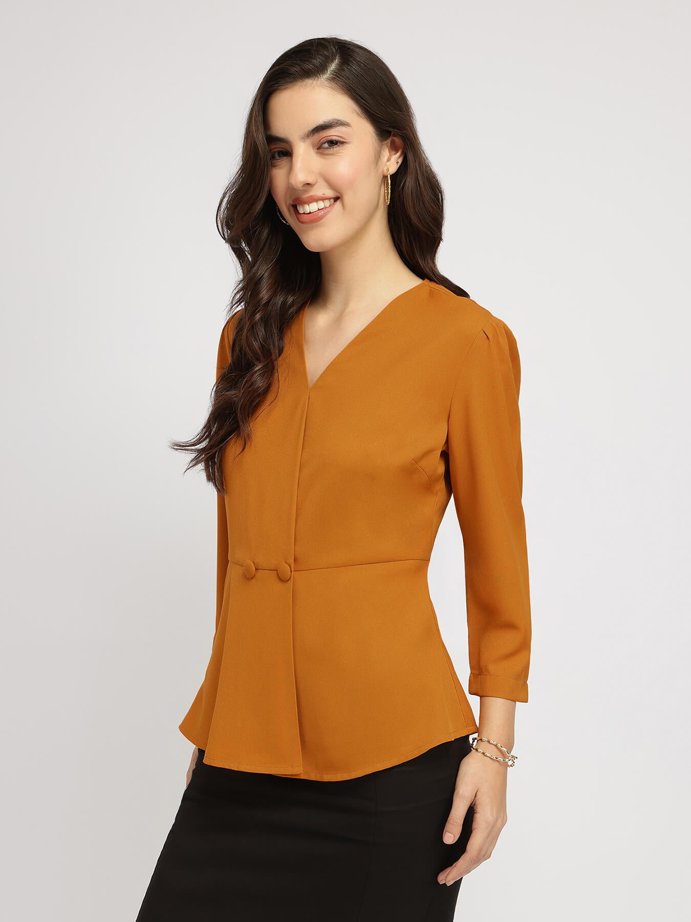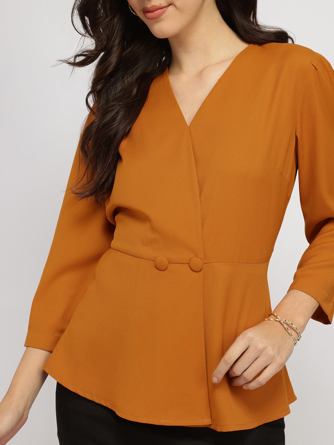 1. Key Detail - V neck wrap style top with two fabric button detail at waist