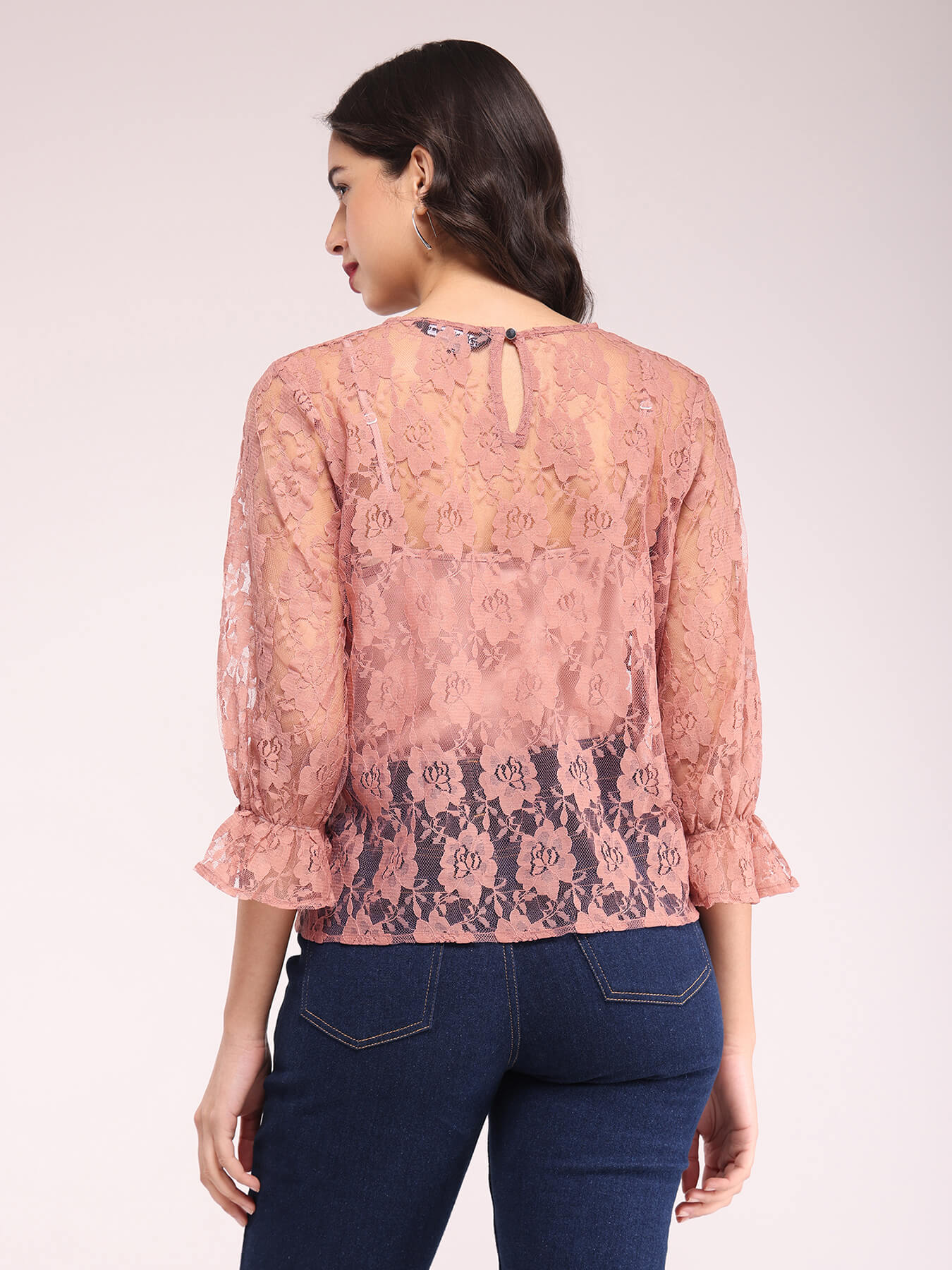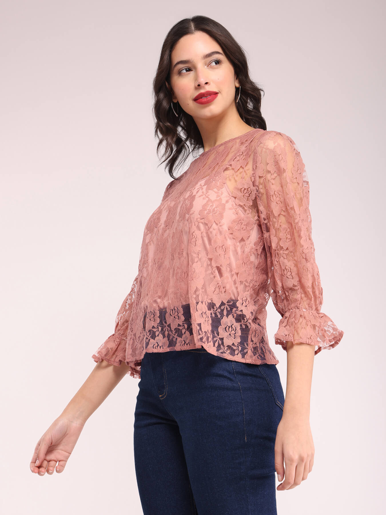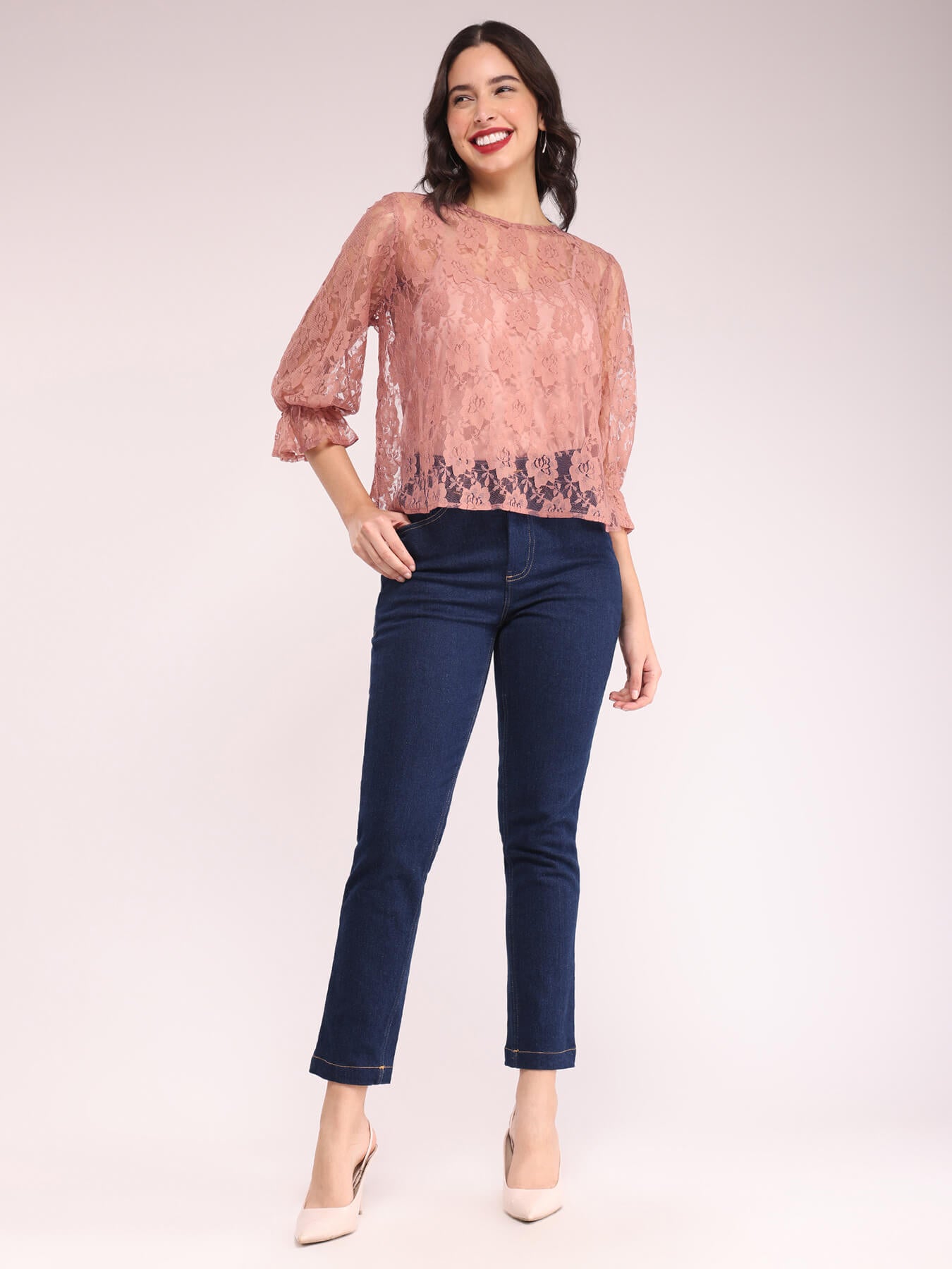 This pink top has a crew neck, three-quarter sleeves and lace detail. Made from Lace, it is soft and comfortable to wear.