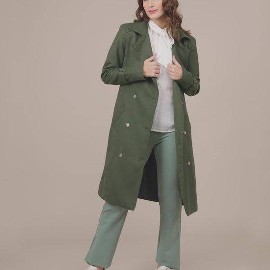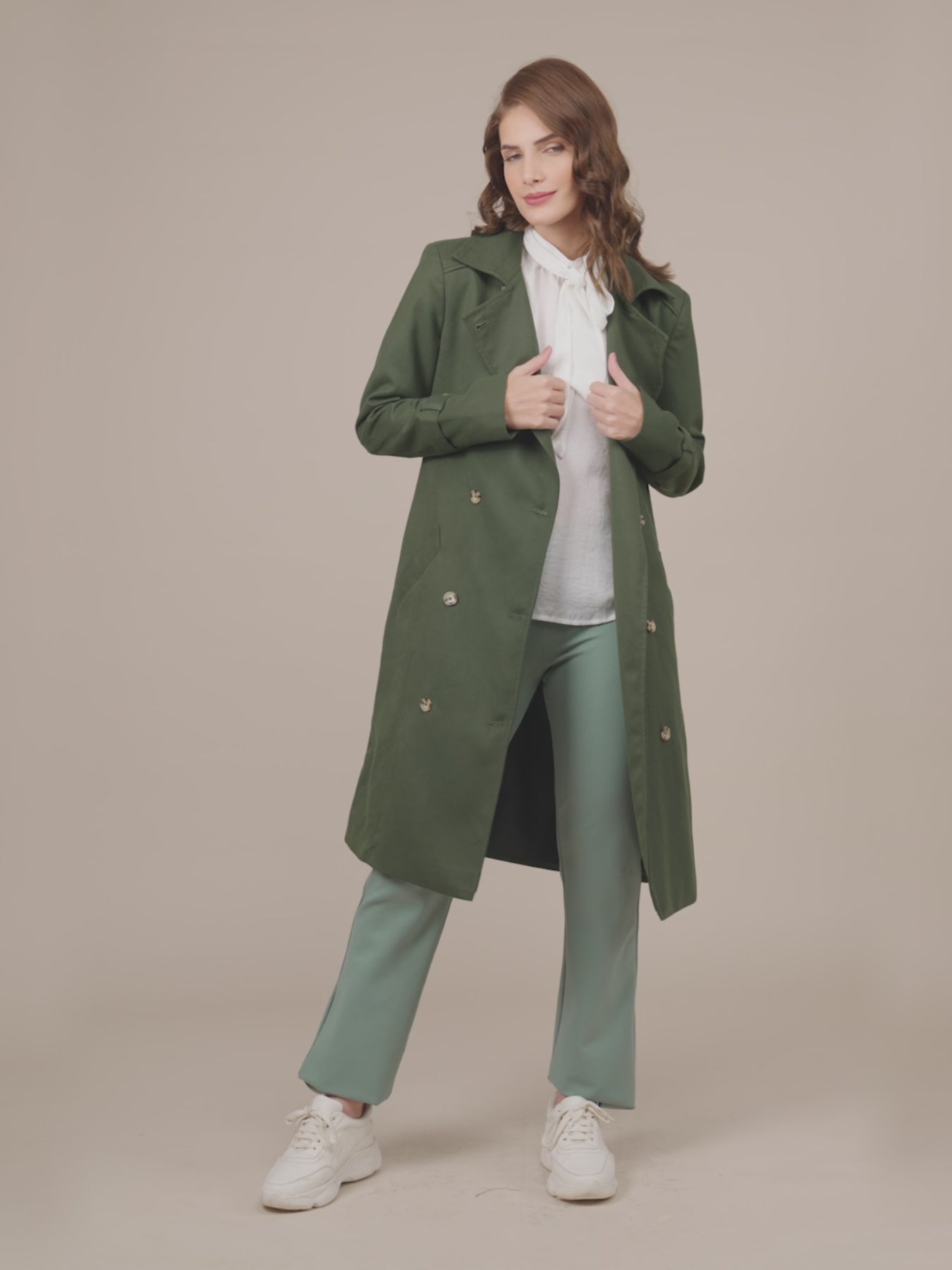 This olive double-breasted trench coat has a notch lapel collar, full sleeves and button details. It is knee length, has an A-line fit and comes with a belt. Made from Poly Viscose, it is soft, breathable and comfortable.