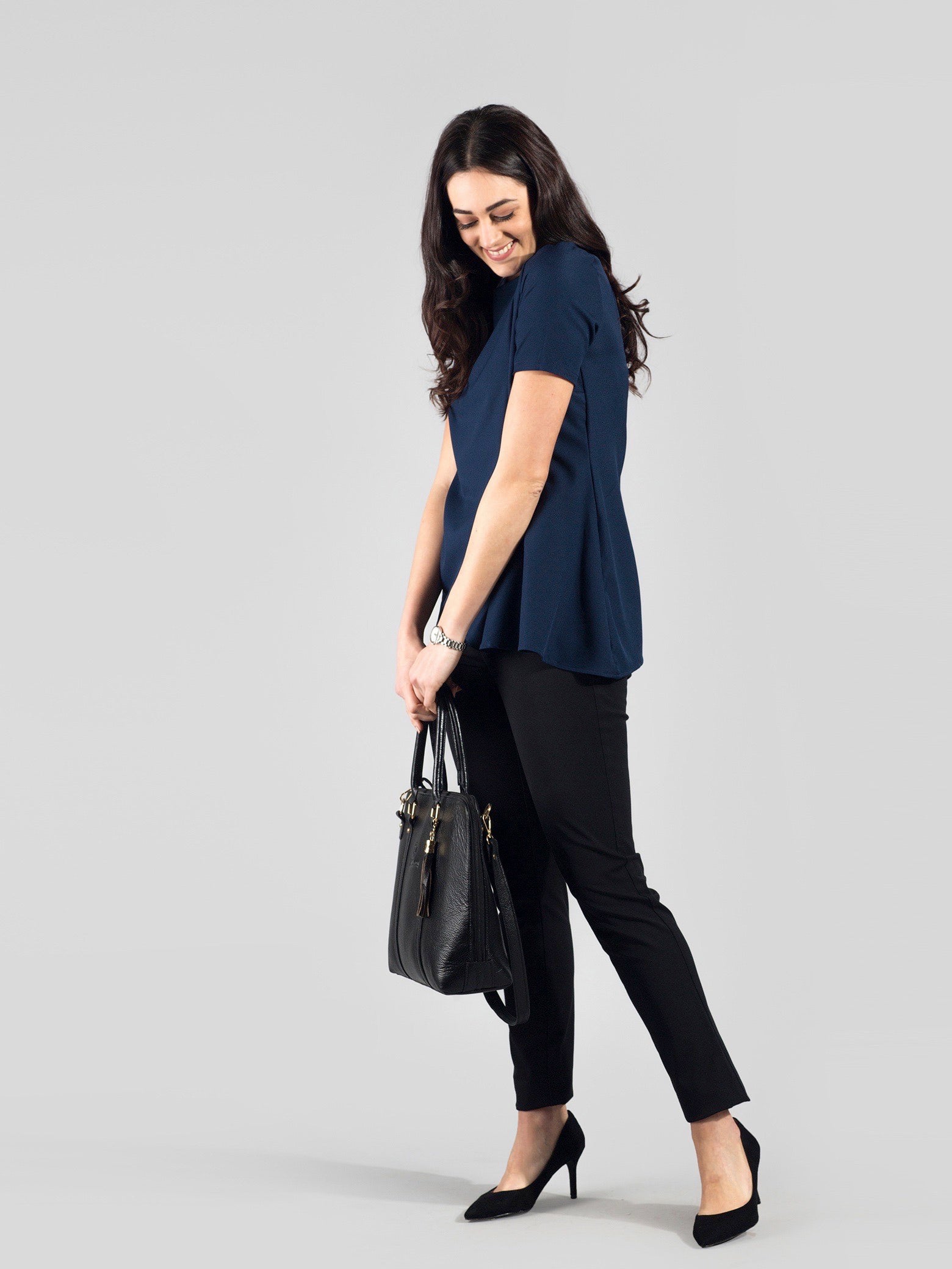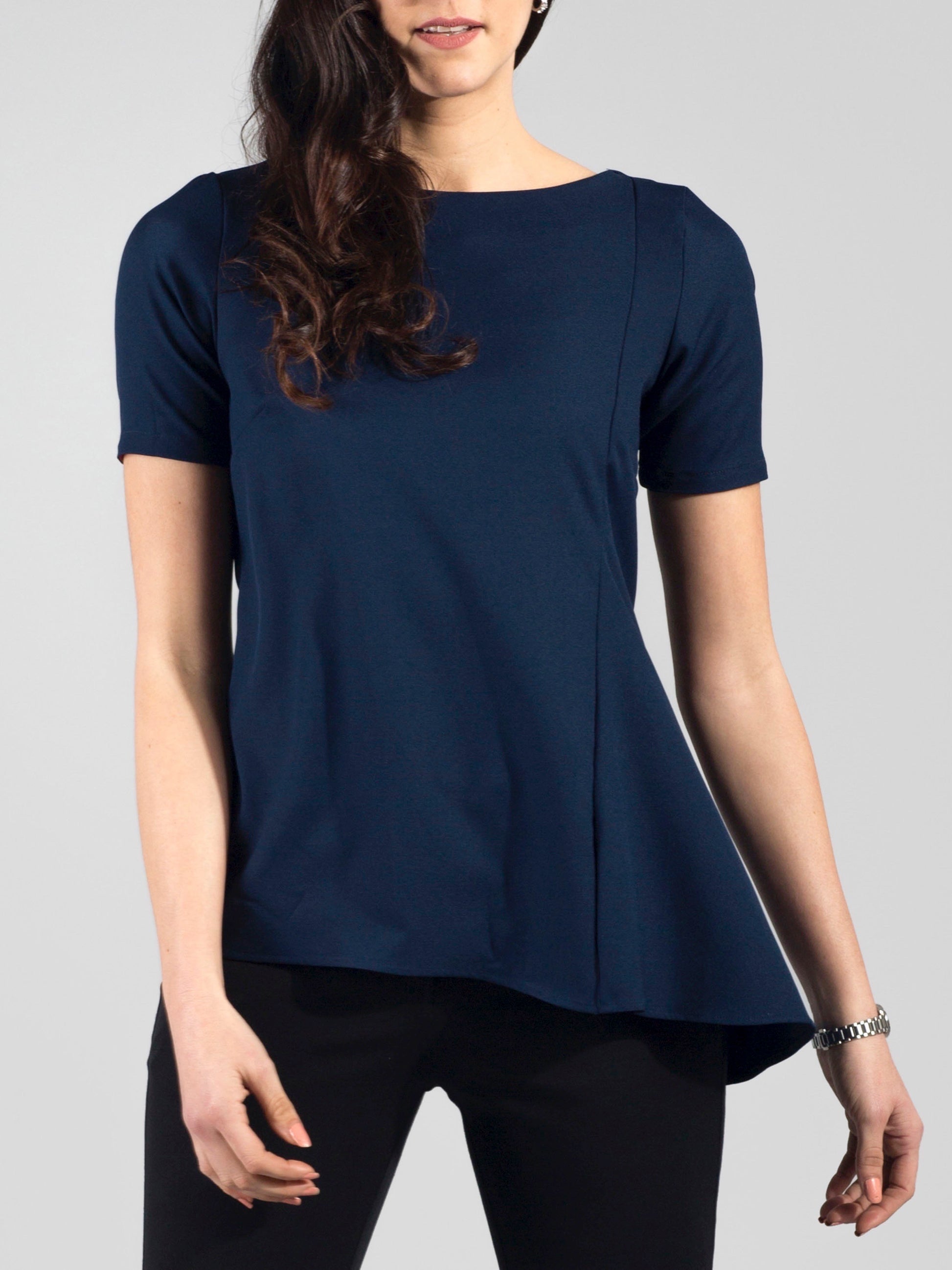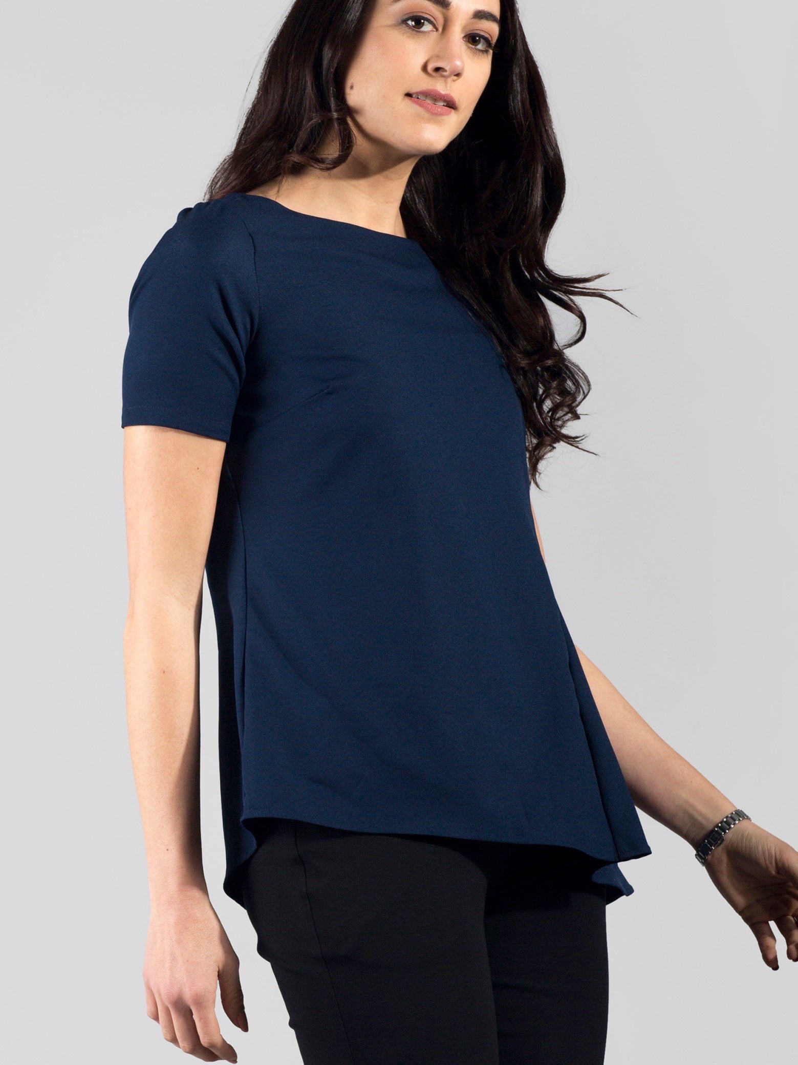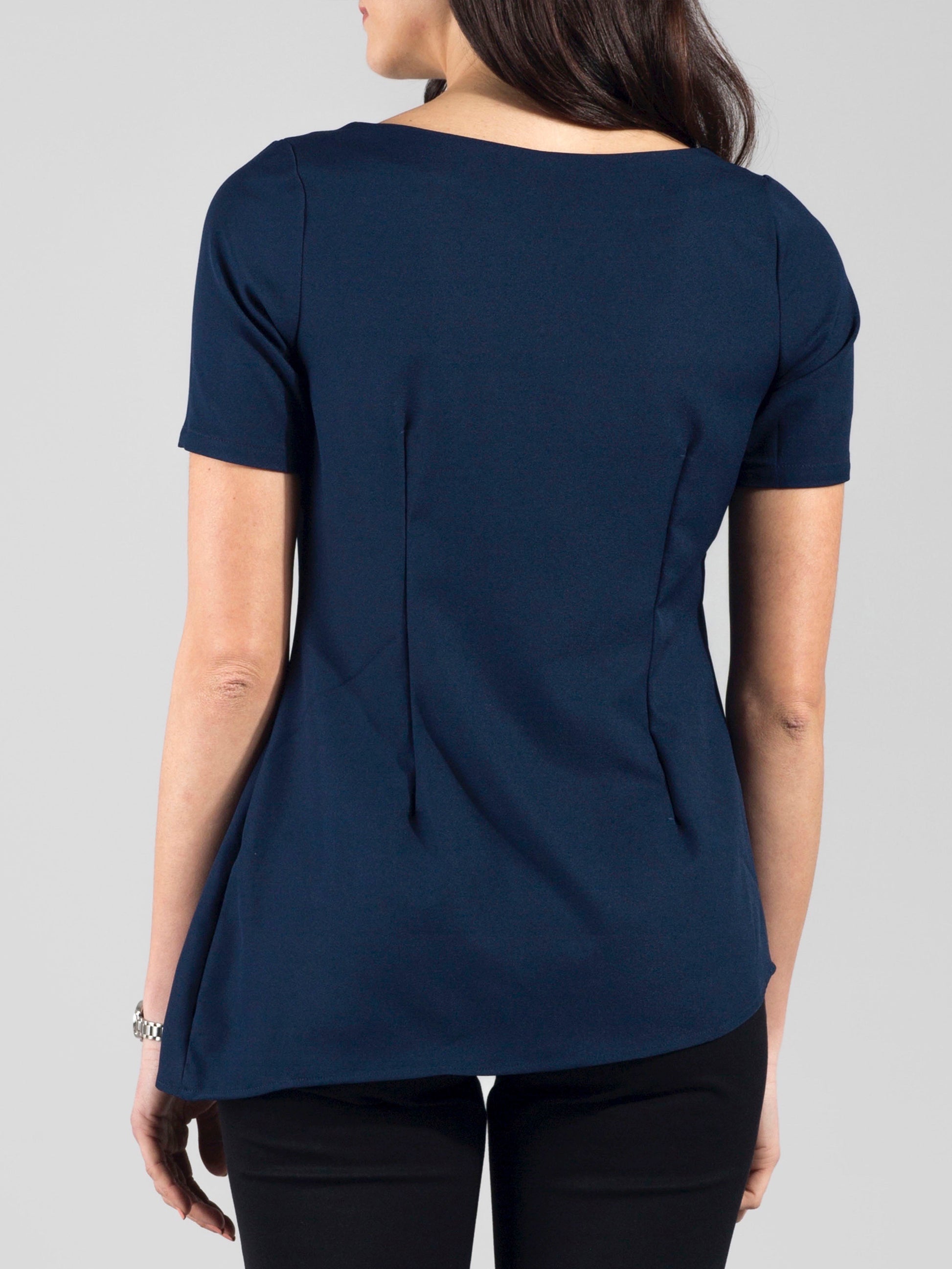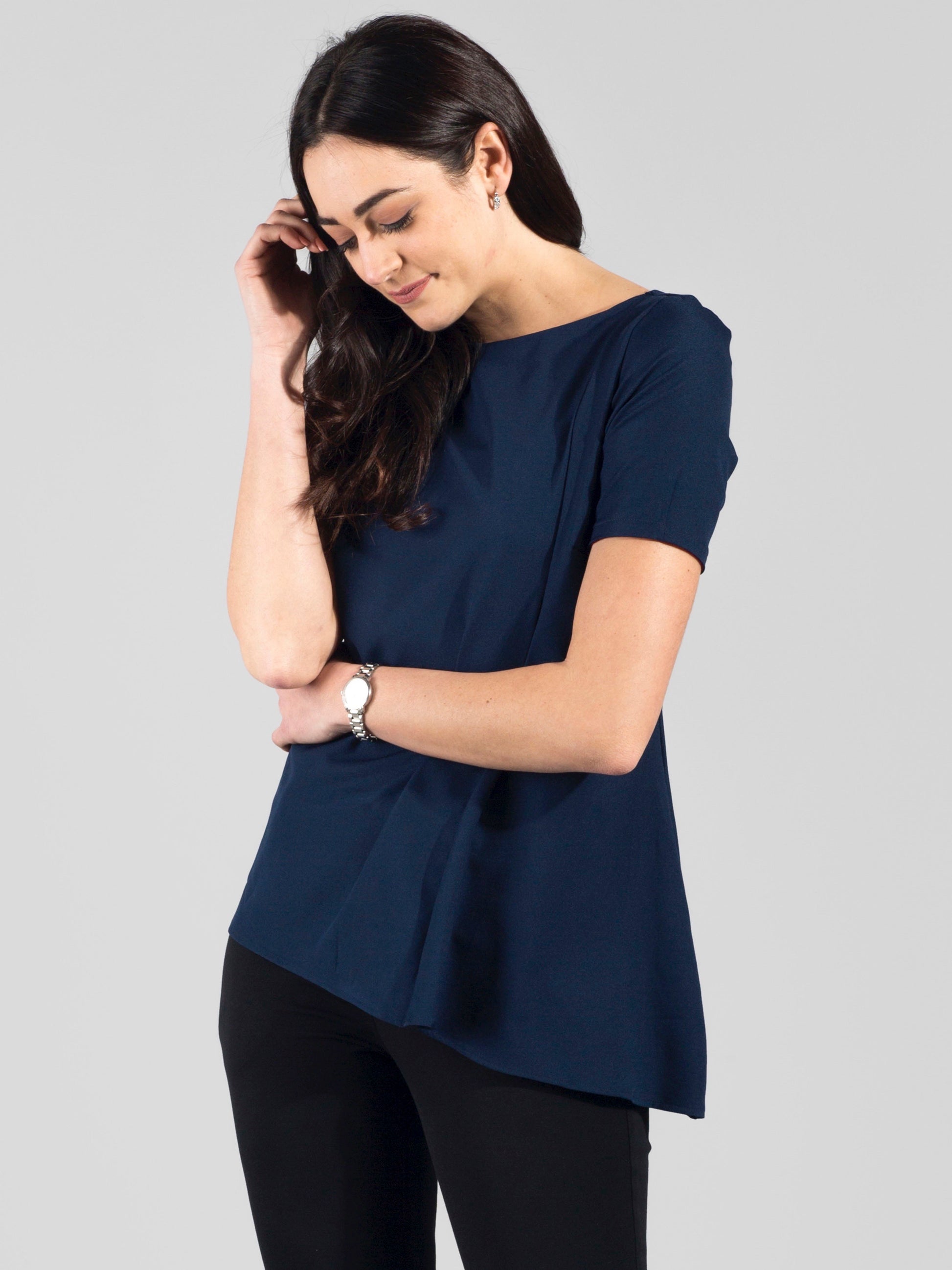 Crafted from an immensely soft poly moss, this top has a boat neck with a slight A-line shape through the torso. A layered asymmetric panel adds edge to this formal navy top.