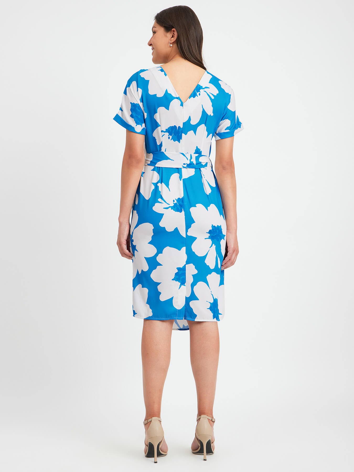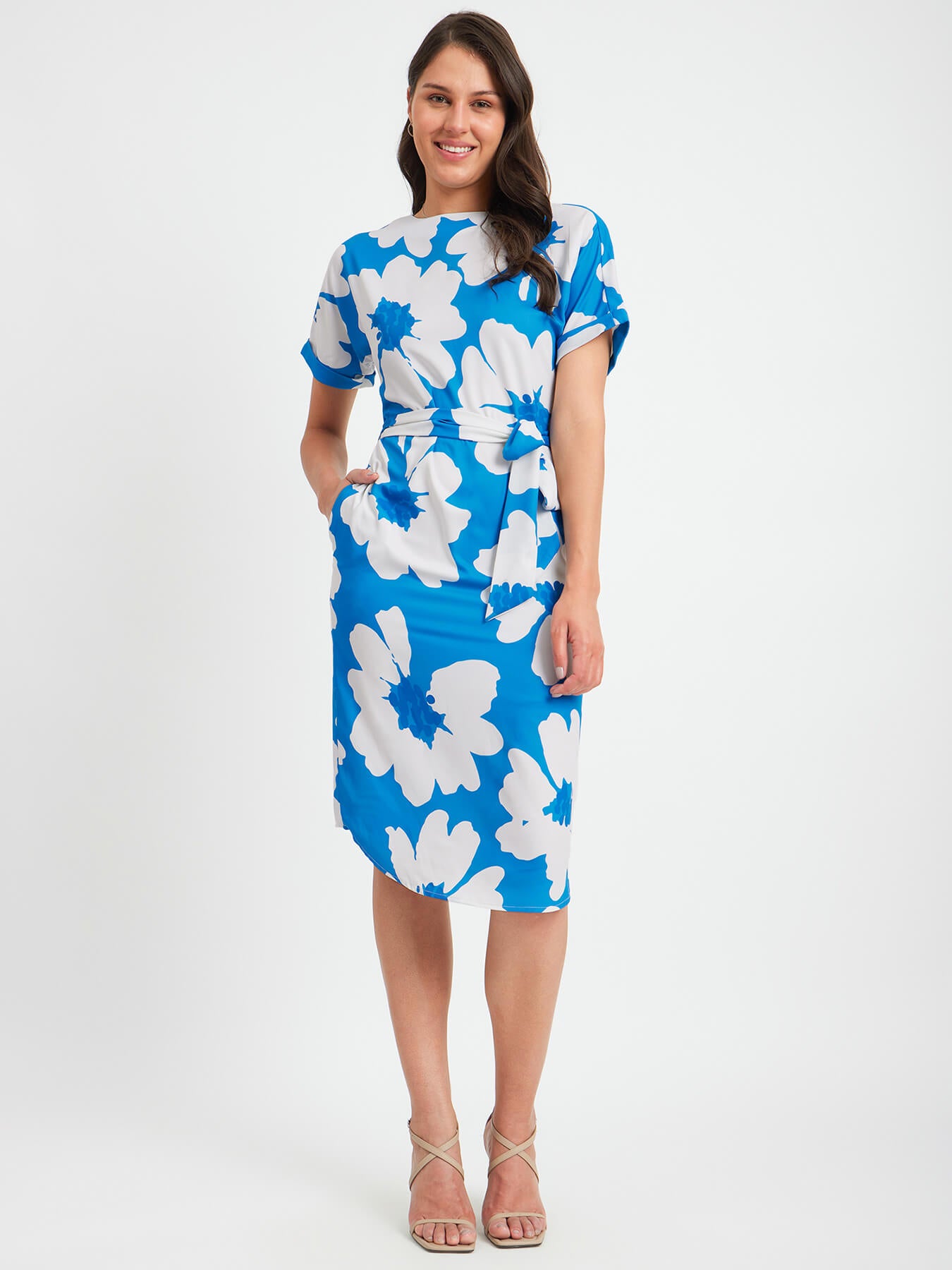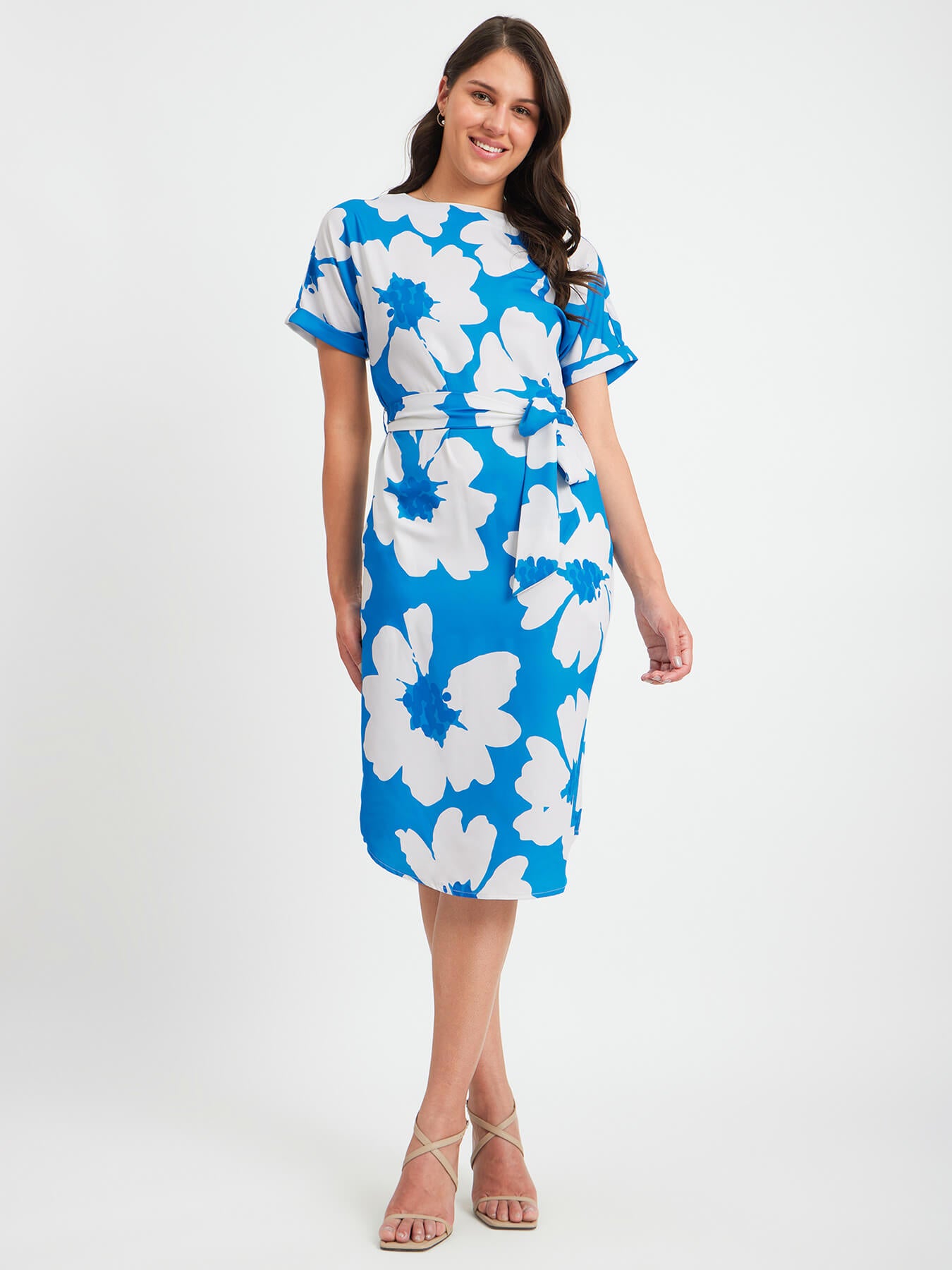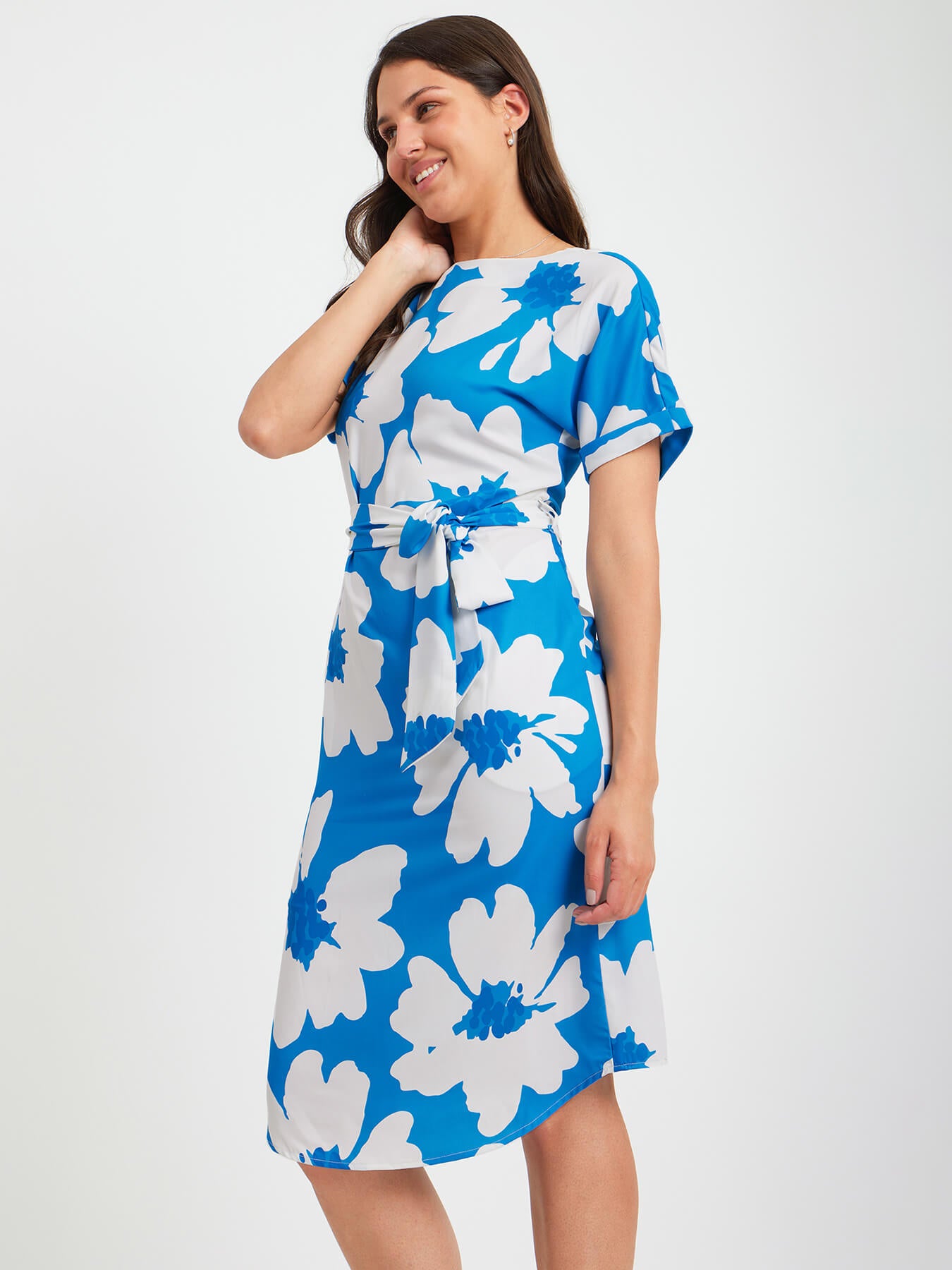 This blue and white dress has a round neck, drop shoulder and floral print detail. Made from Polyester Summercool, it is soft and comfortable to wear.
