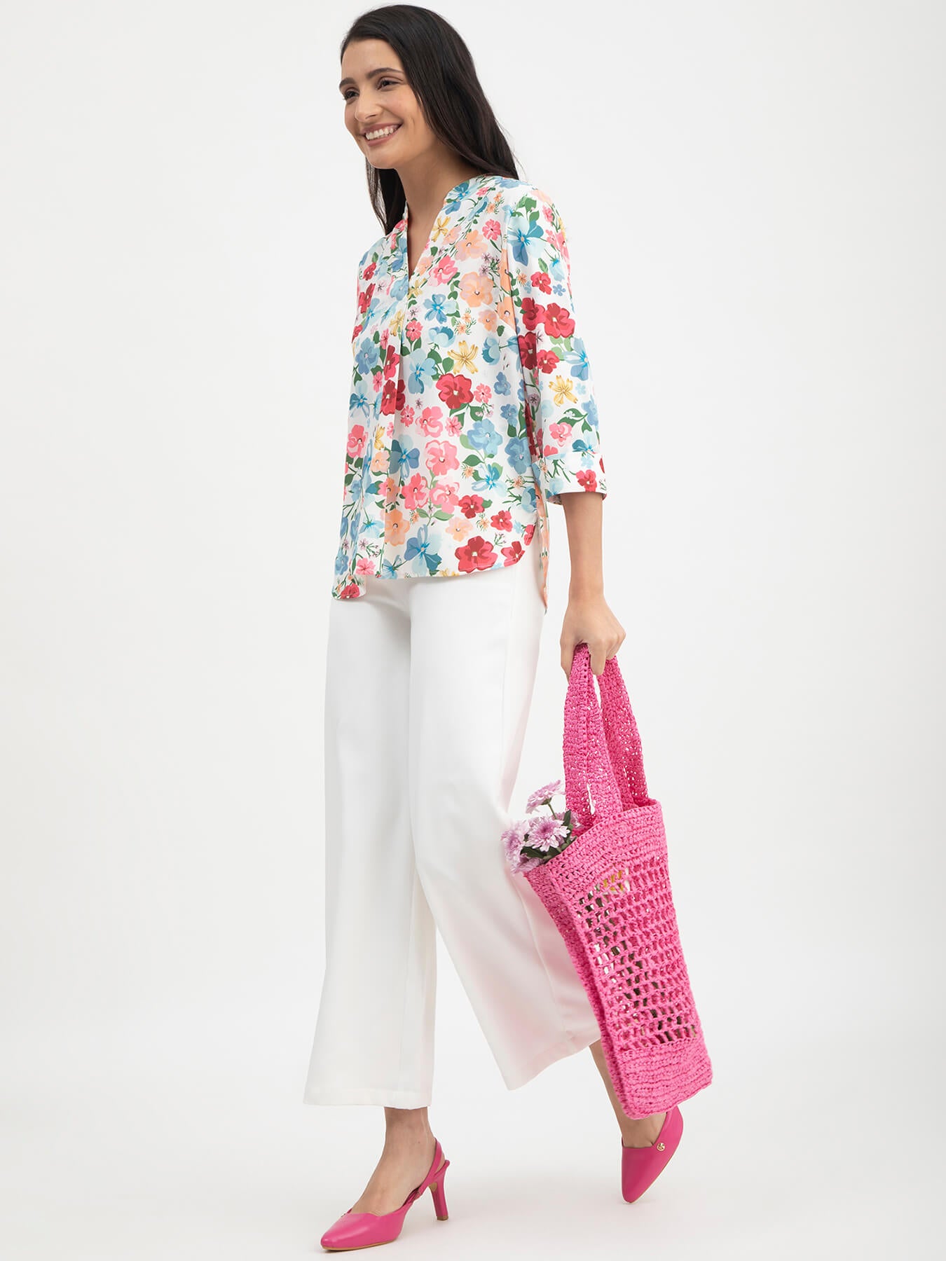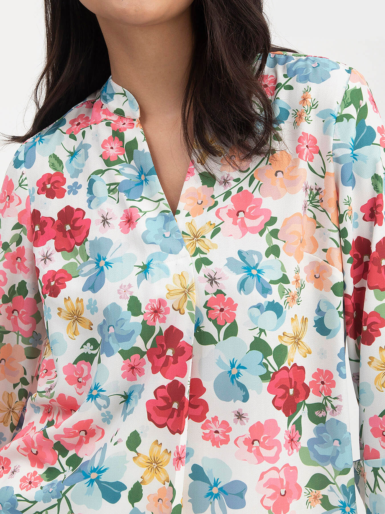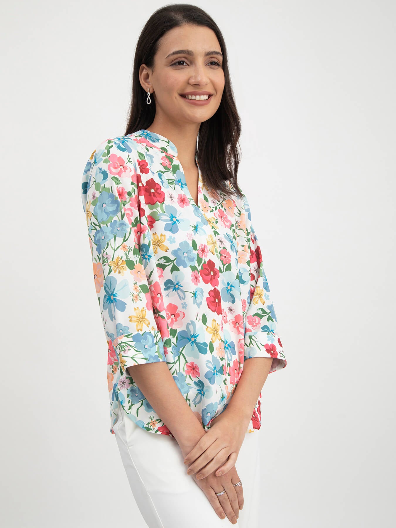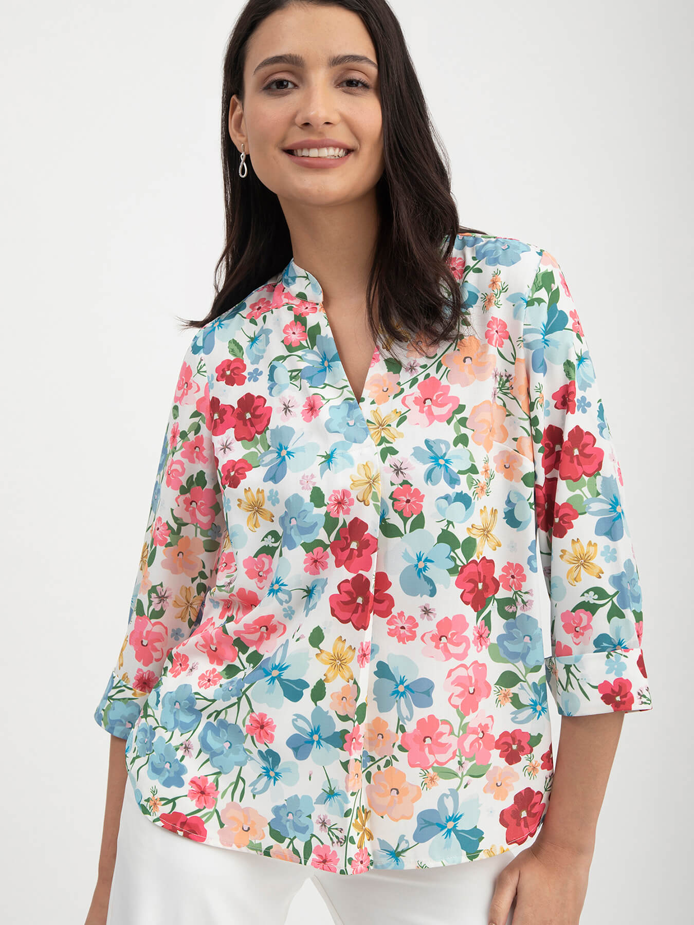This multicoloured top has a mandarin neck, three-quarter sleeves and floral print detail. Made from Polyester, it is soft and comfortable to wear.