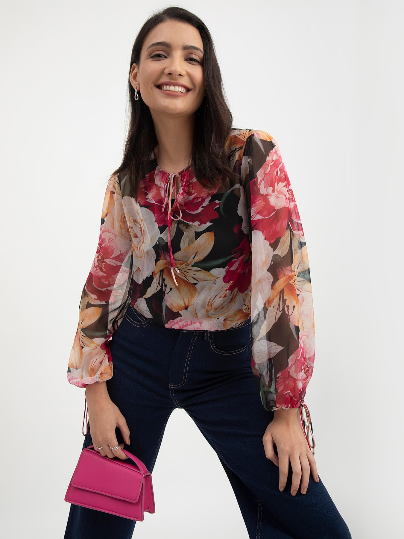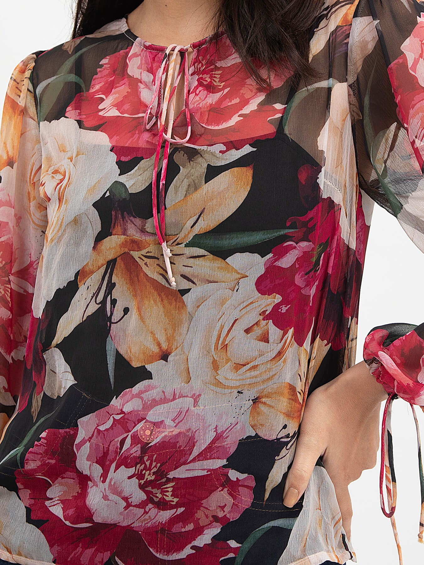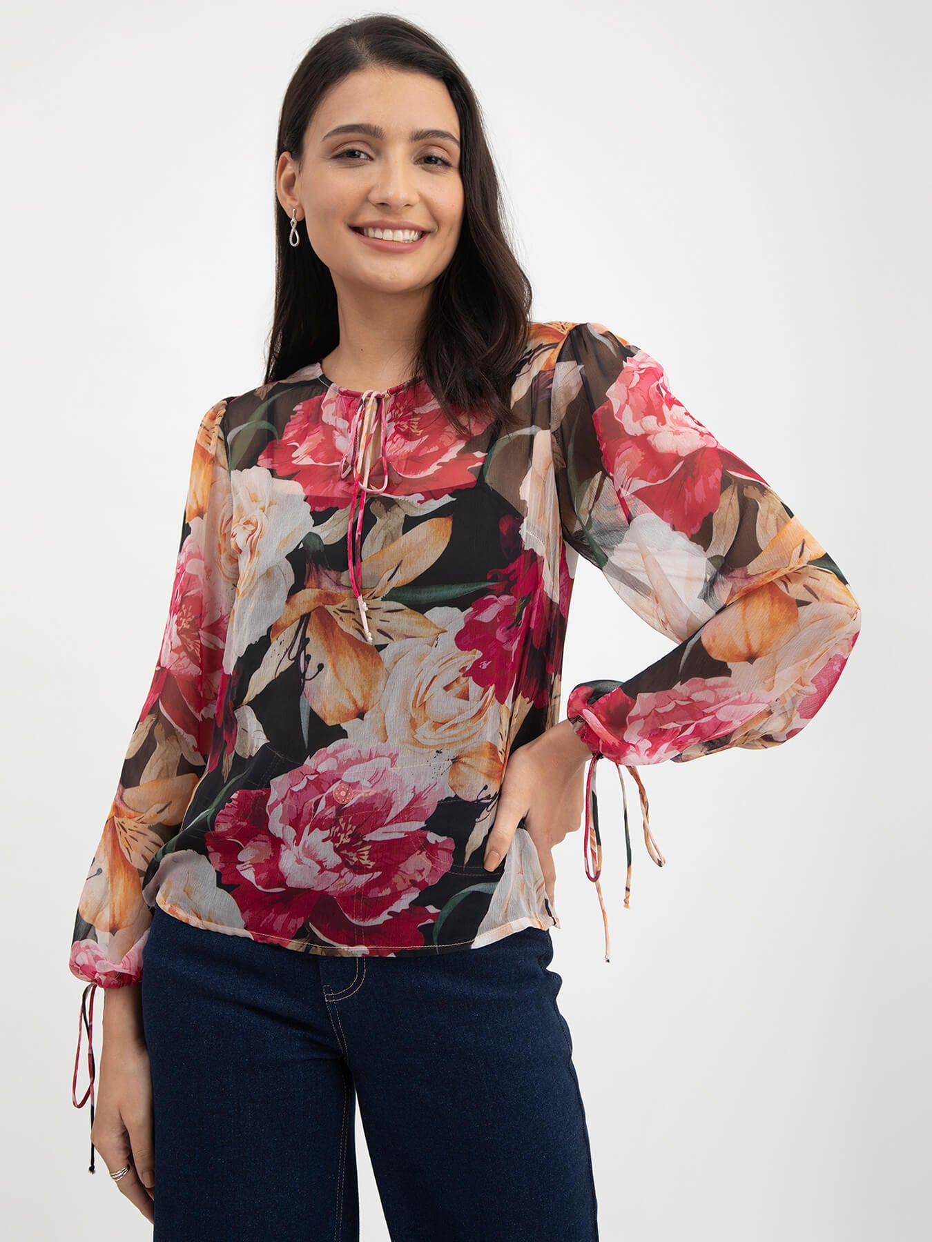 This multicolour top has a tie-up neck, long sleeves and floral print detail. Made from Chiffon, it is soft and comfortable to wear. This top comes with a separate black camisole.