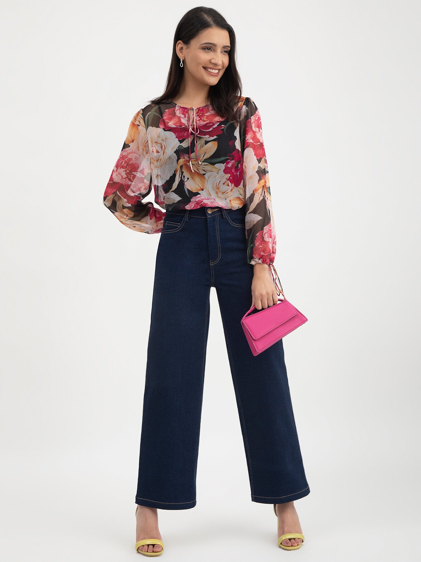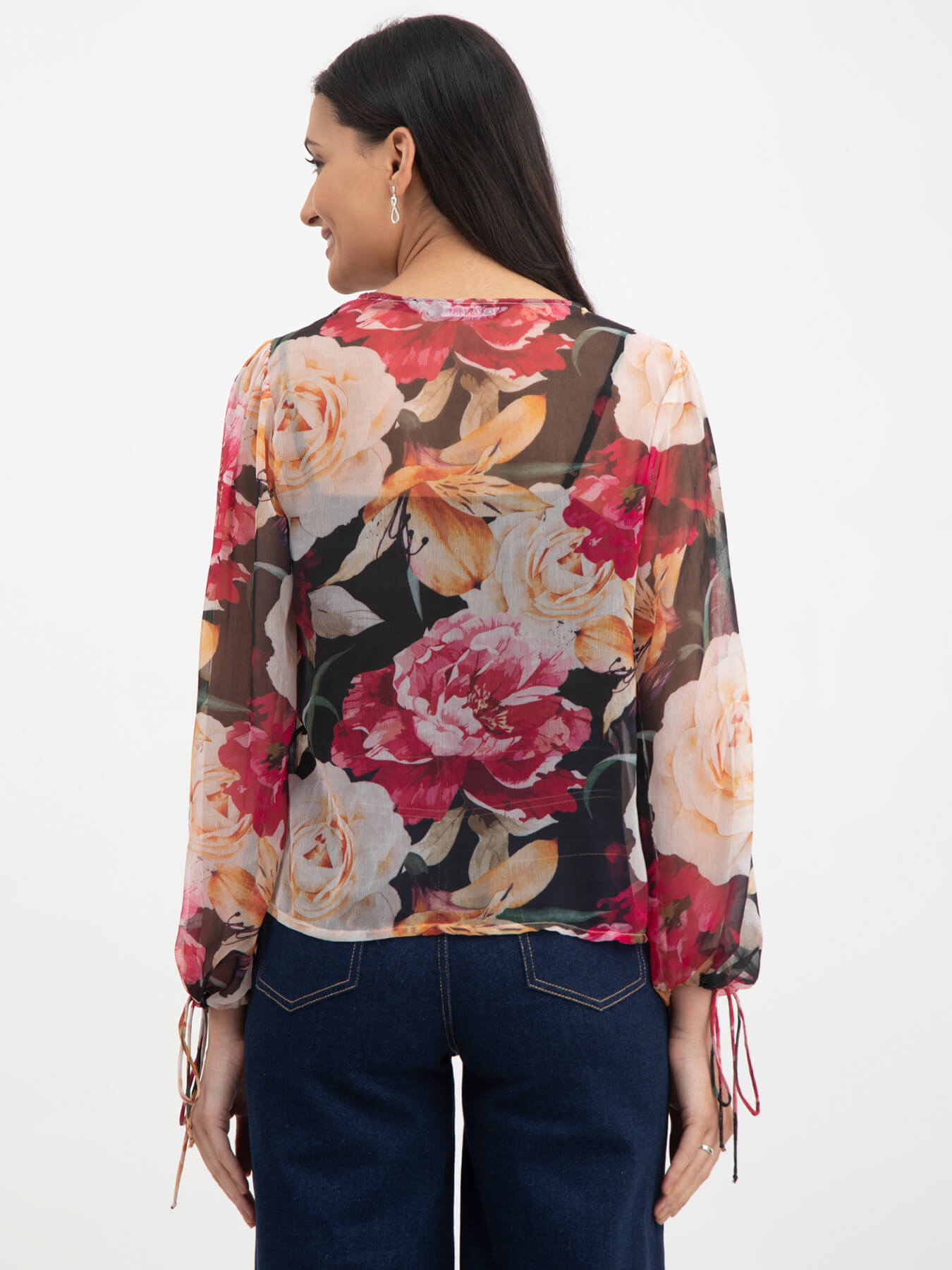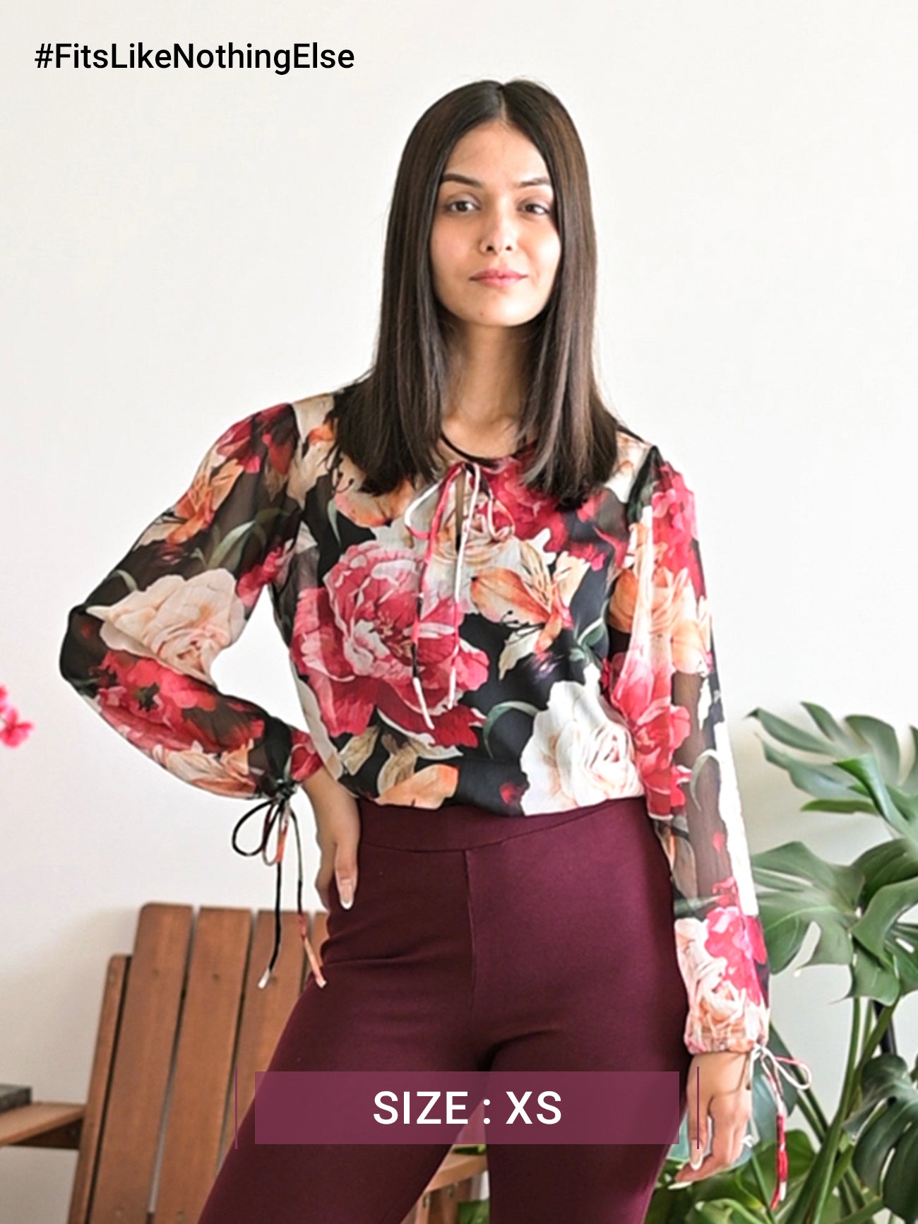This multicolour top has a tie-up neck, long sleeves and floral print detail. Made from Chiffon, it is soft and comfortable to wear. This top comes with a separate black camisole.