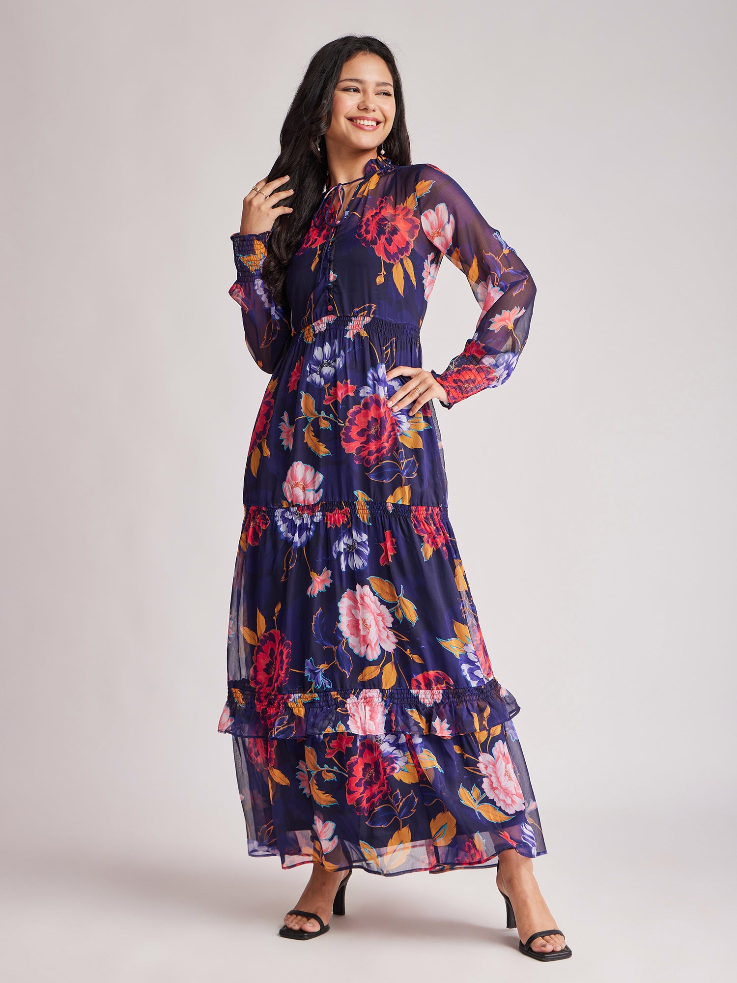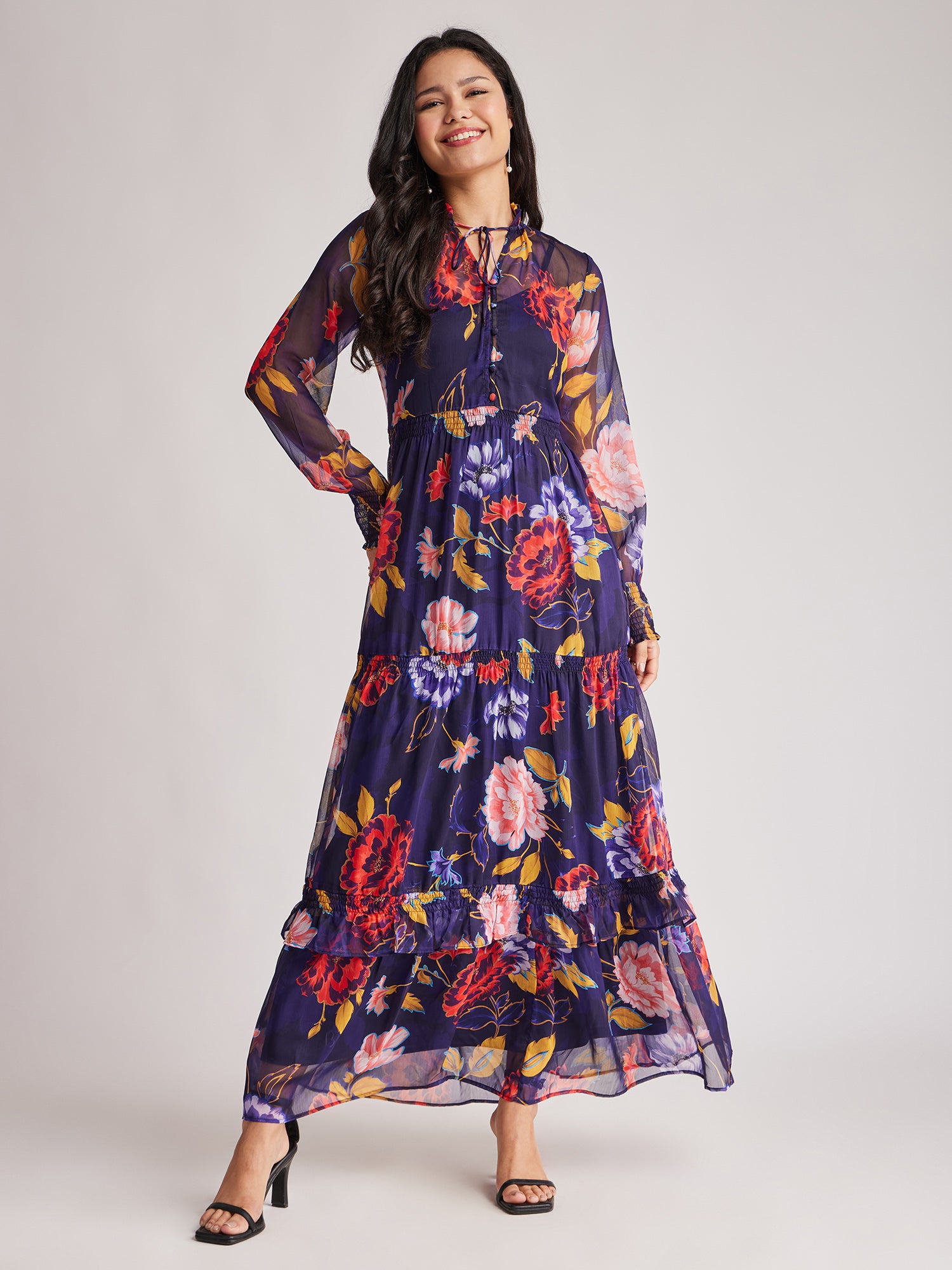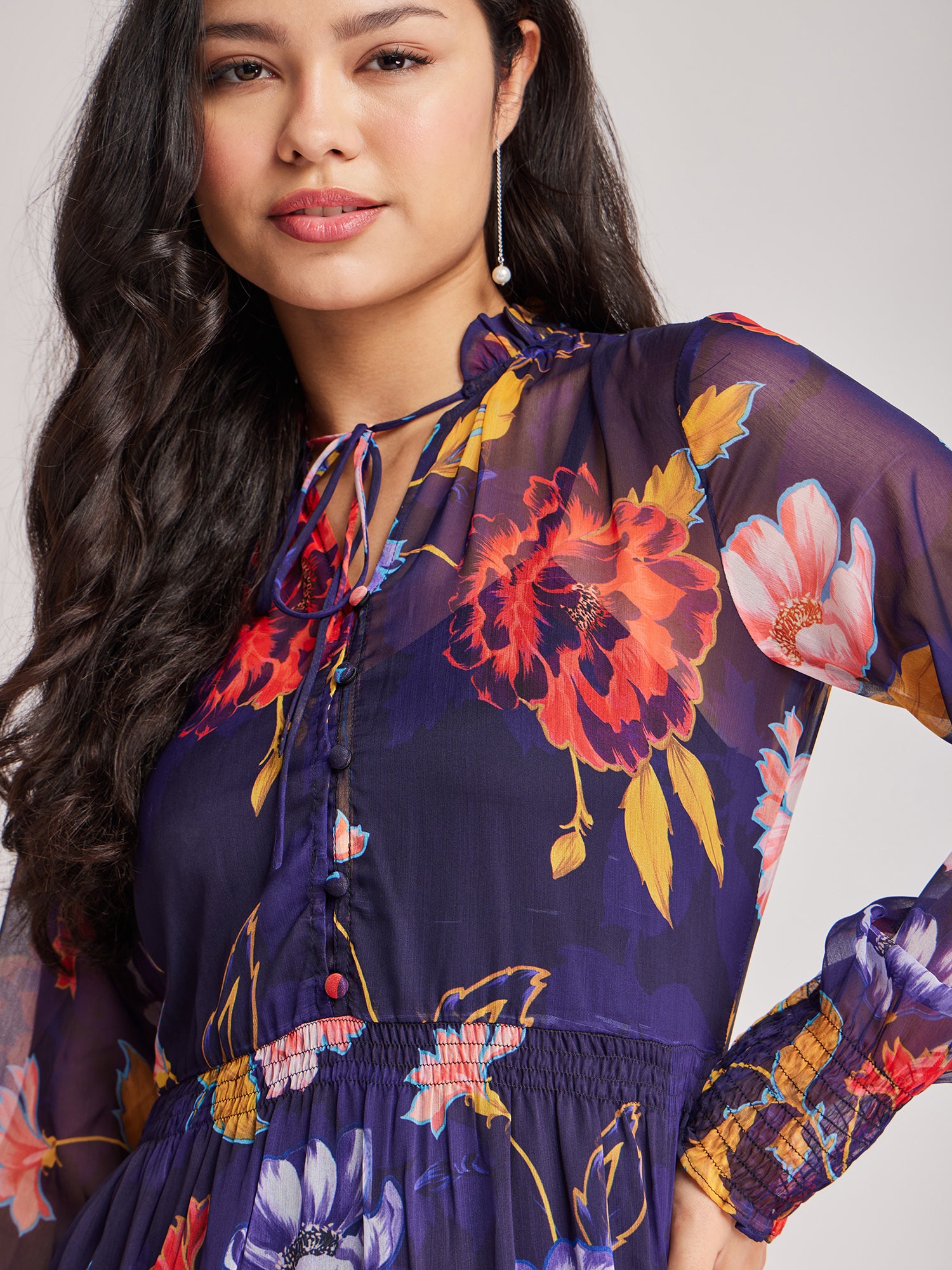 Floral Ruffle Dress - Navy Blue And Multicolour