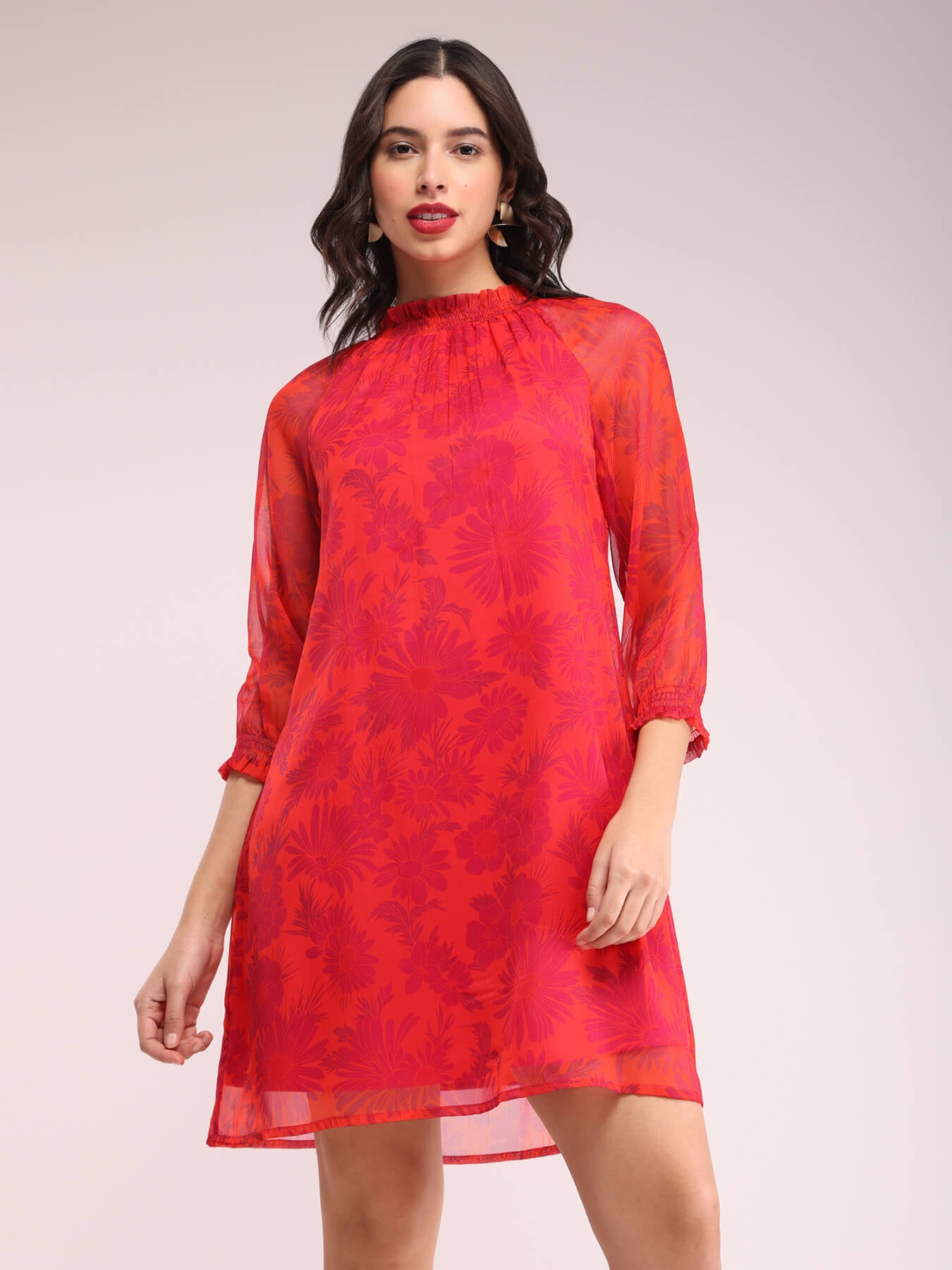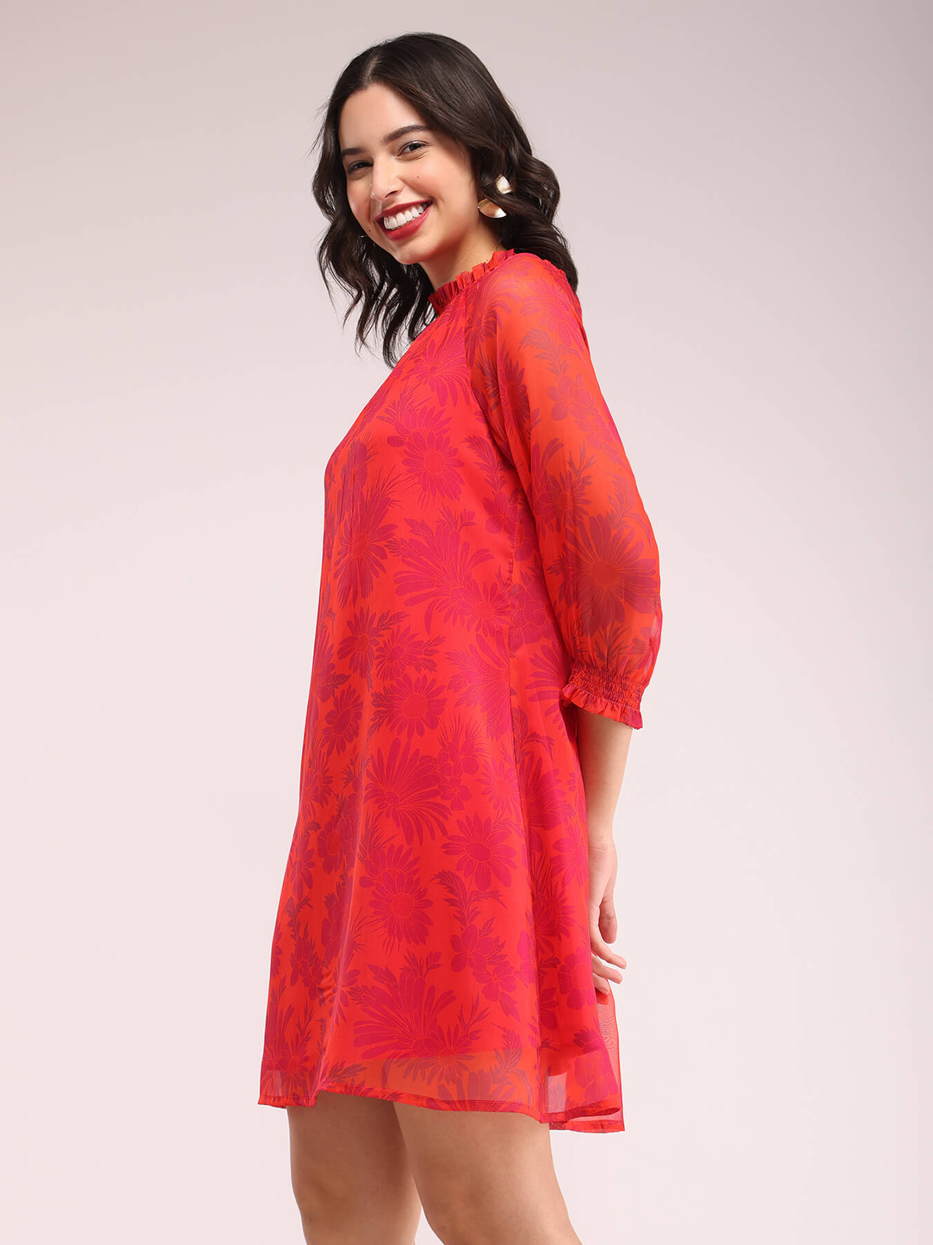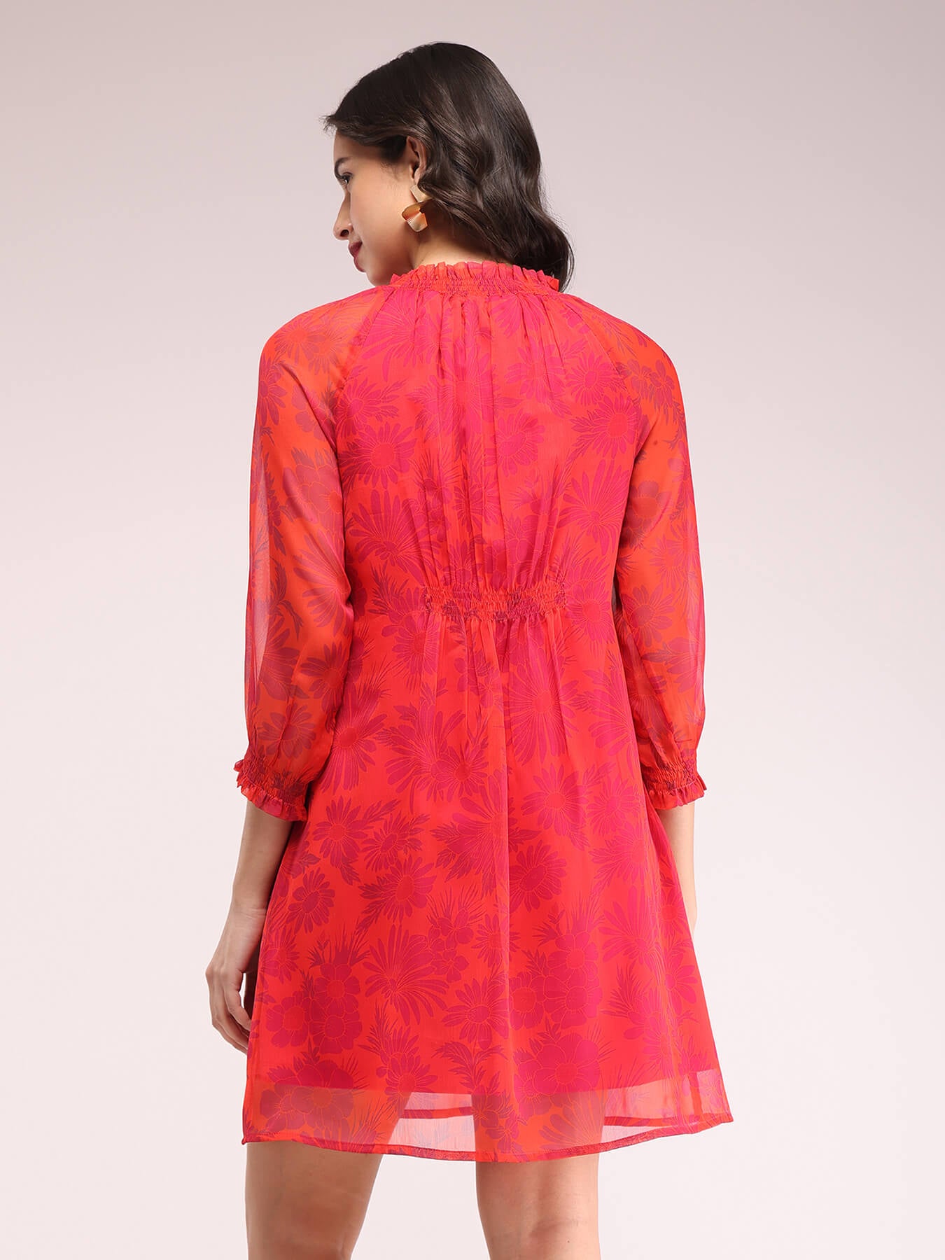 Floral Smocked Neck Dress - Orange And Fuchsia