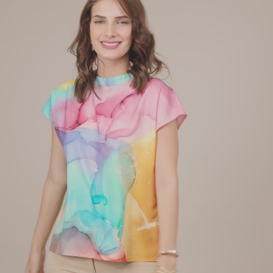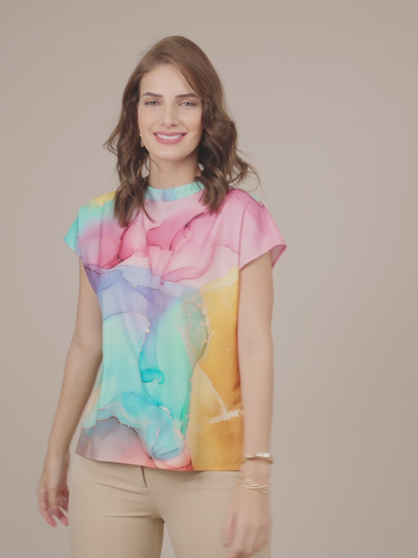 This multicoloured top has a high neck, fumes print and short sleeves. Made from Summercool, it's soft, lightweight and comfortable to wear.