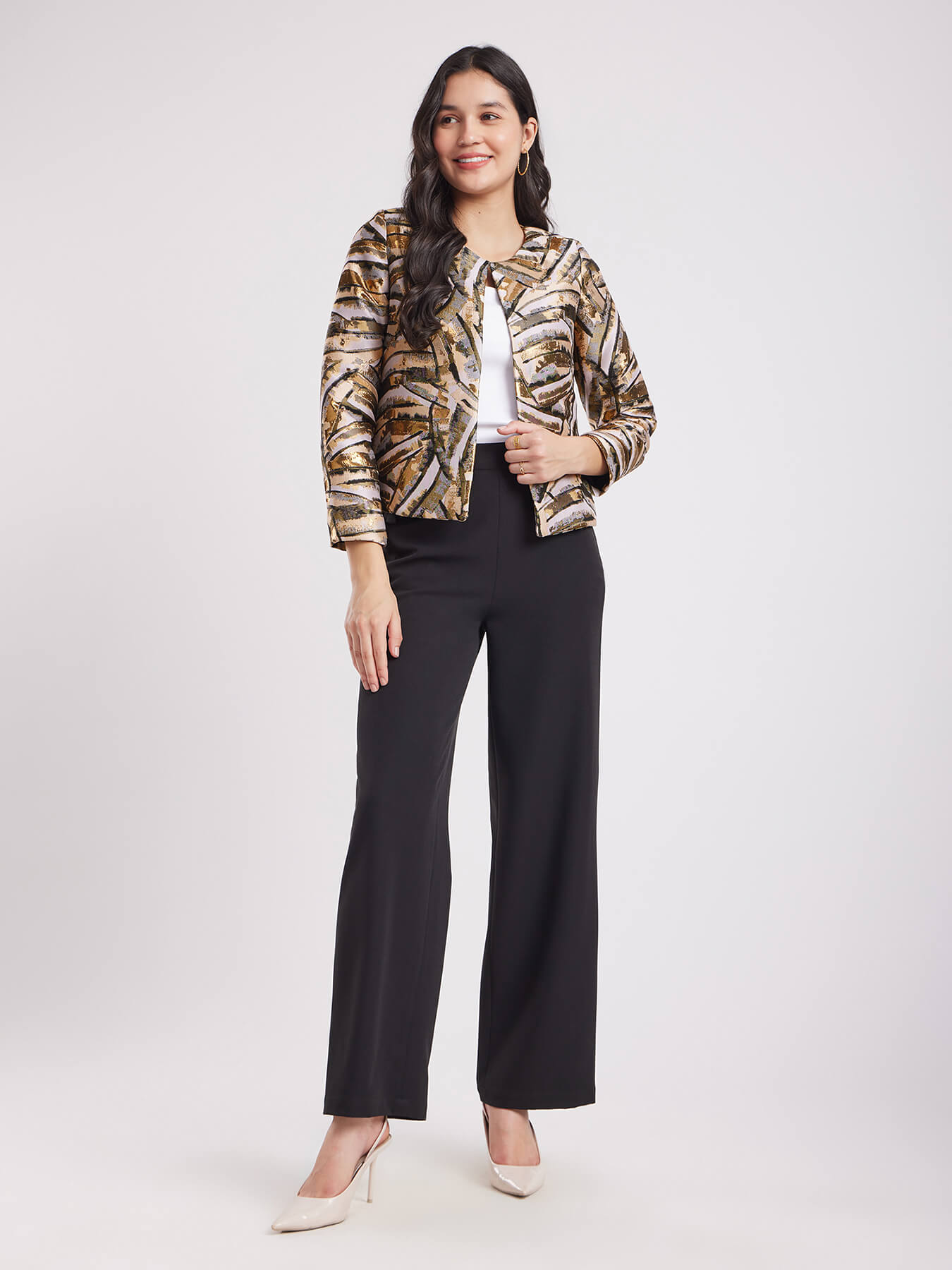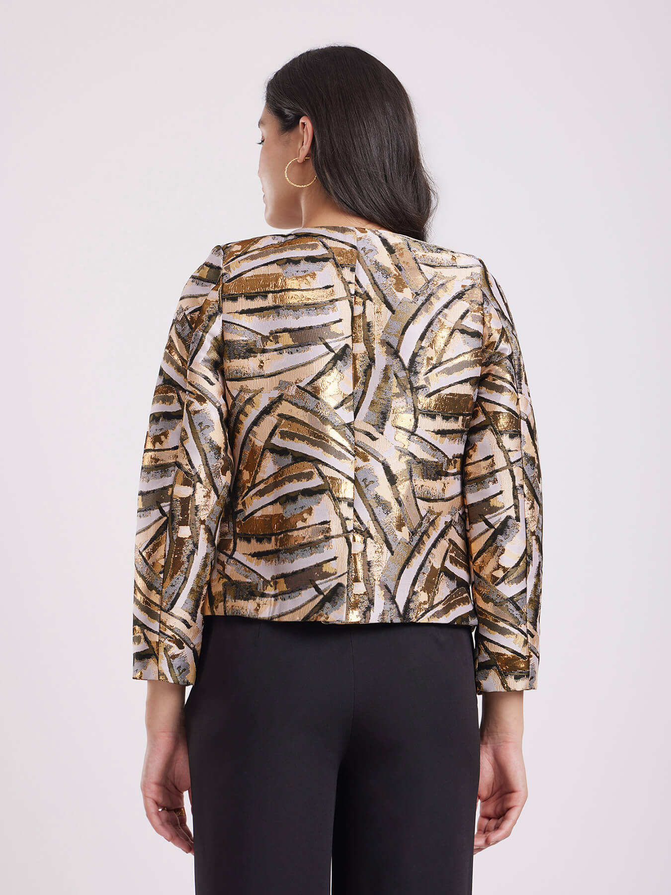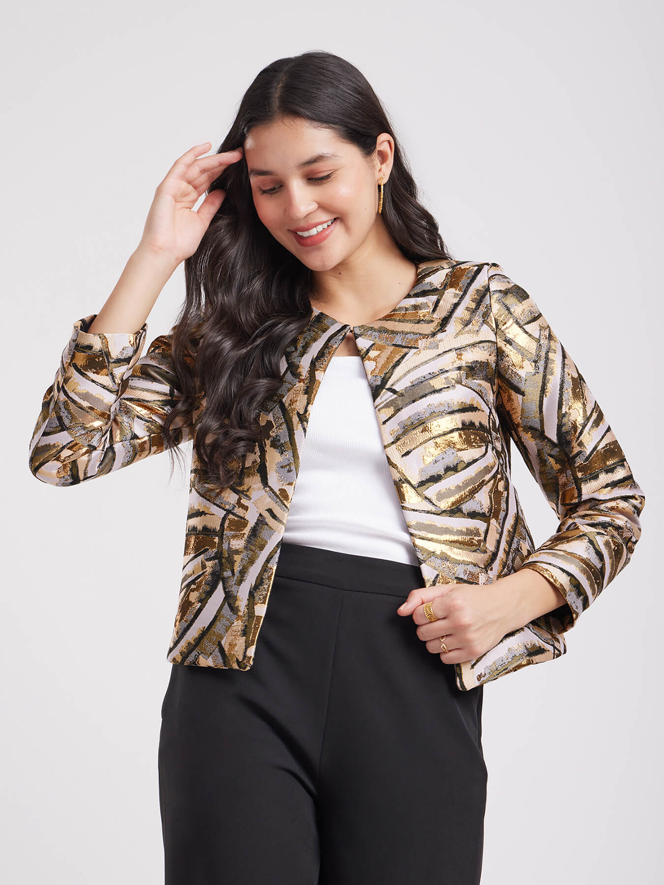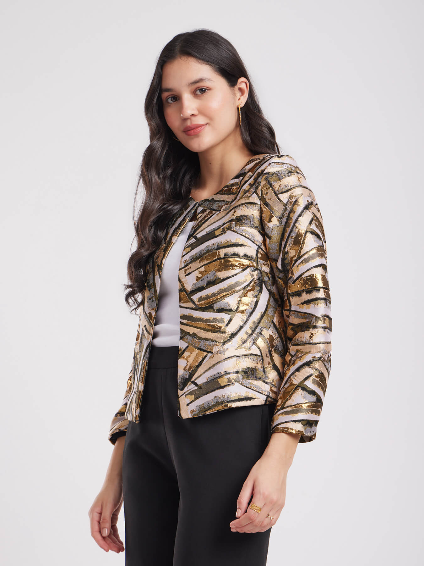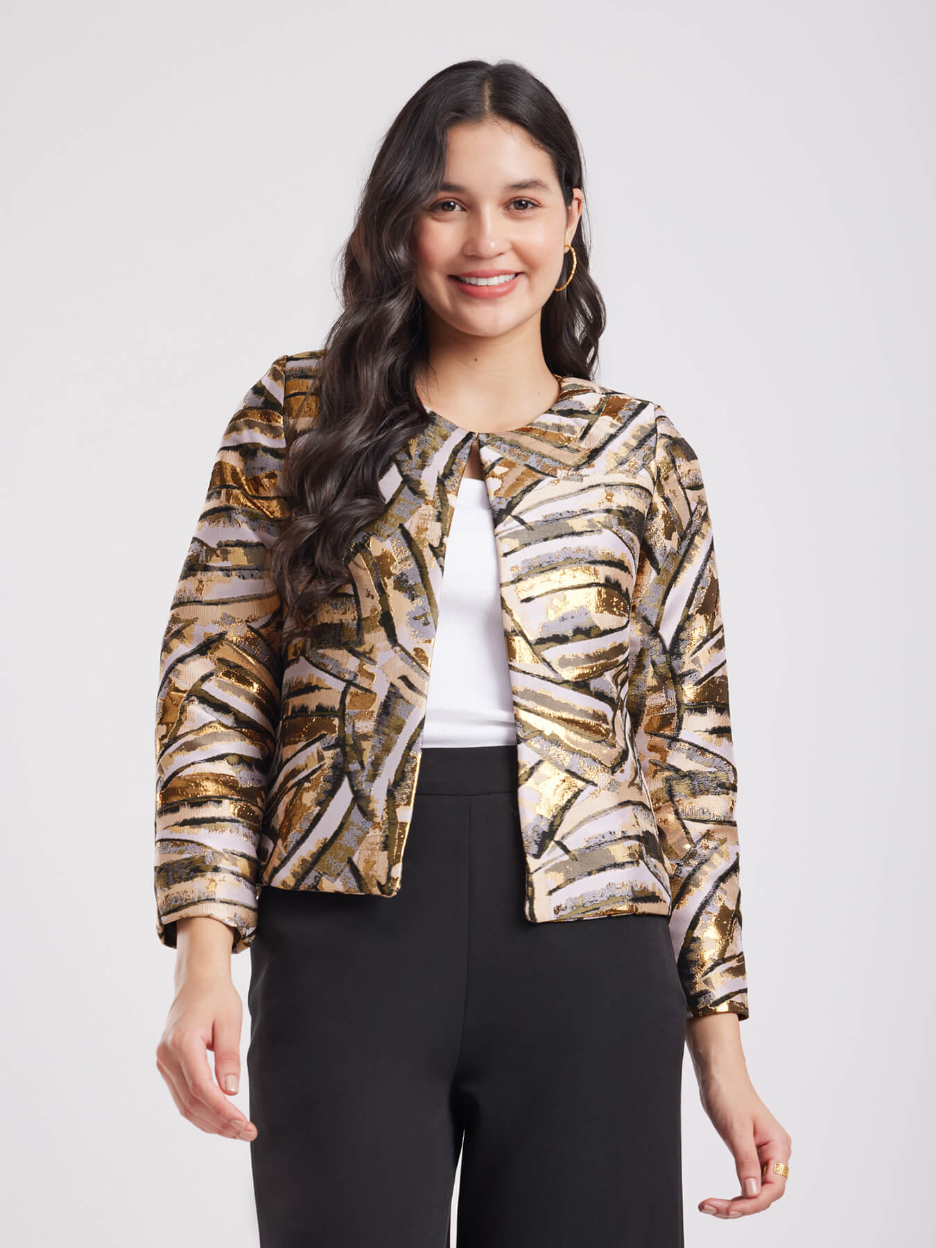 Jacquard Open Front Jacket - Beige And Gold