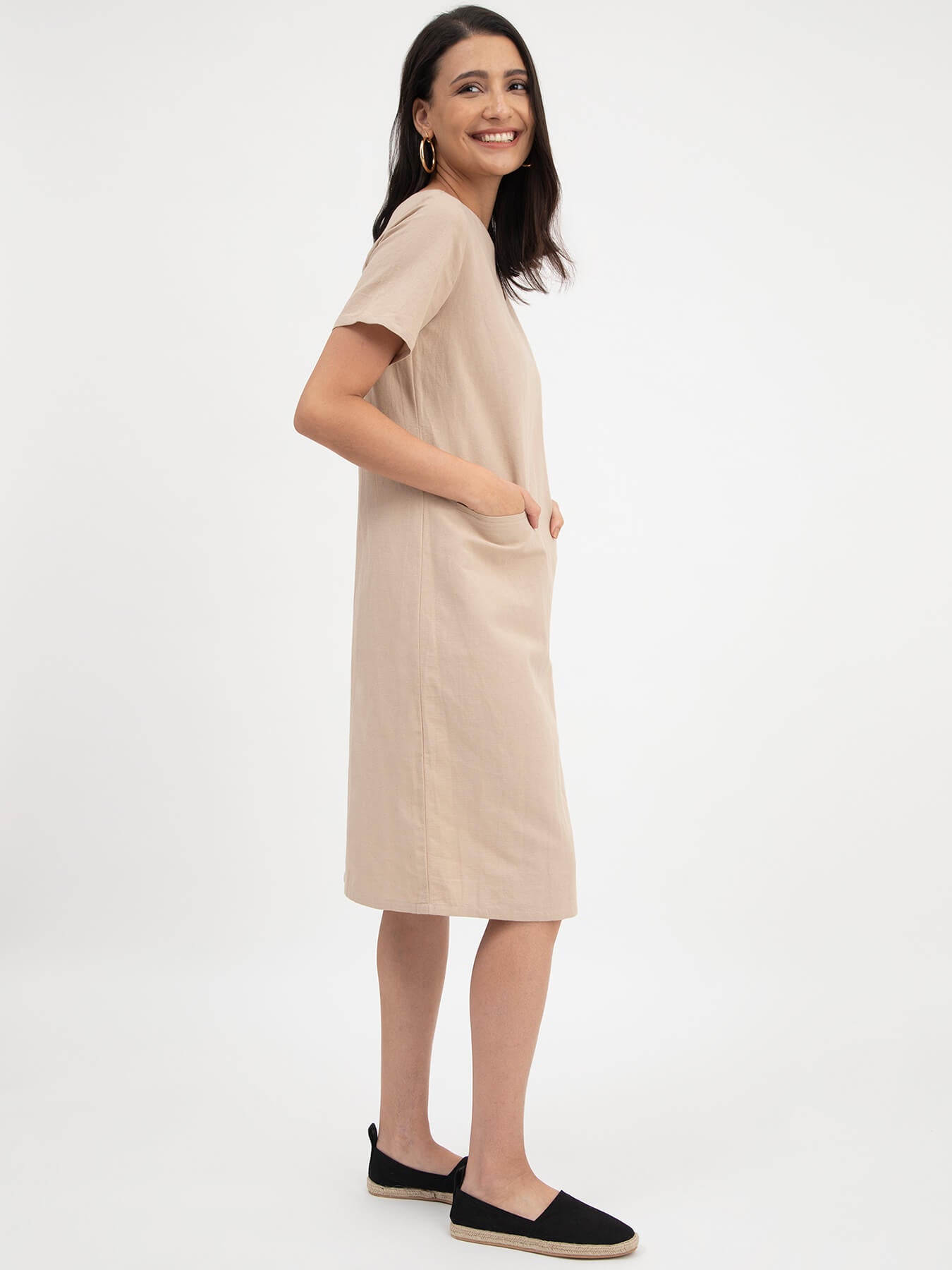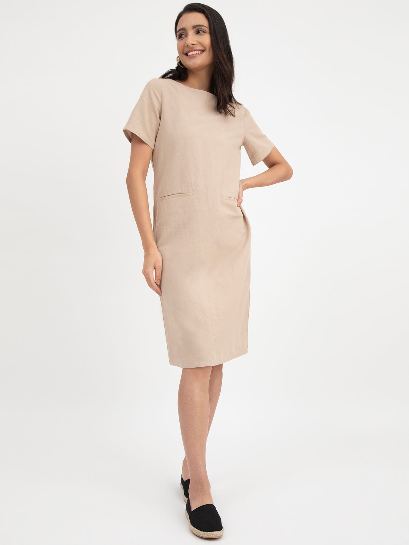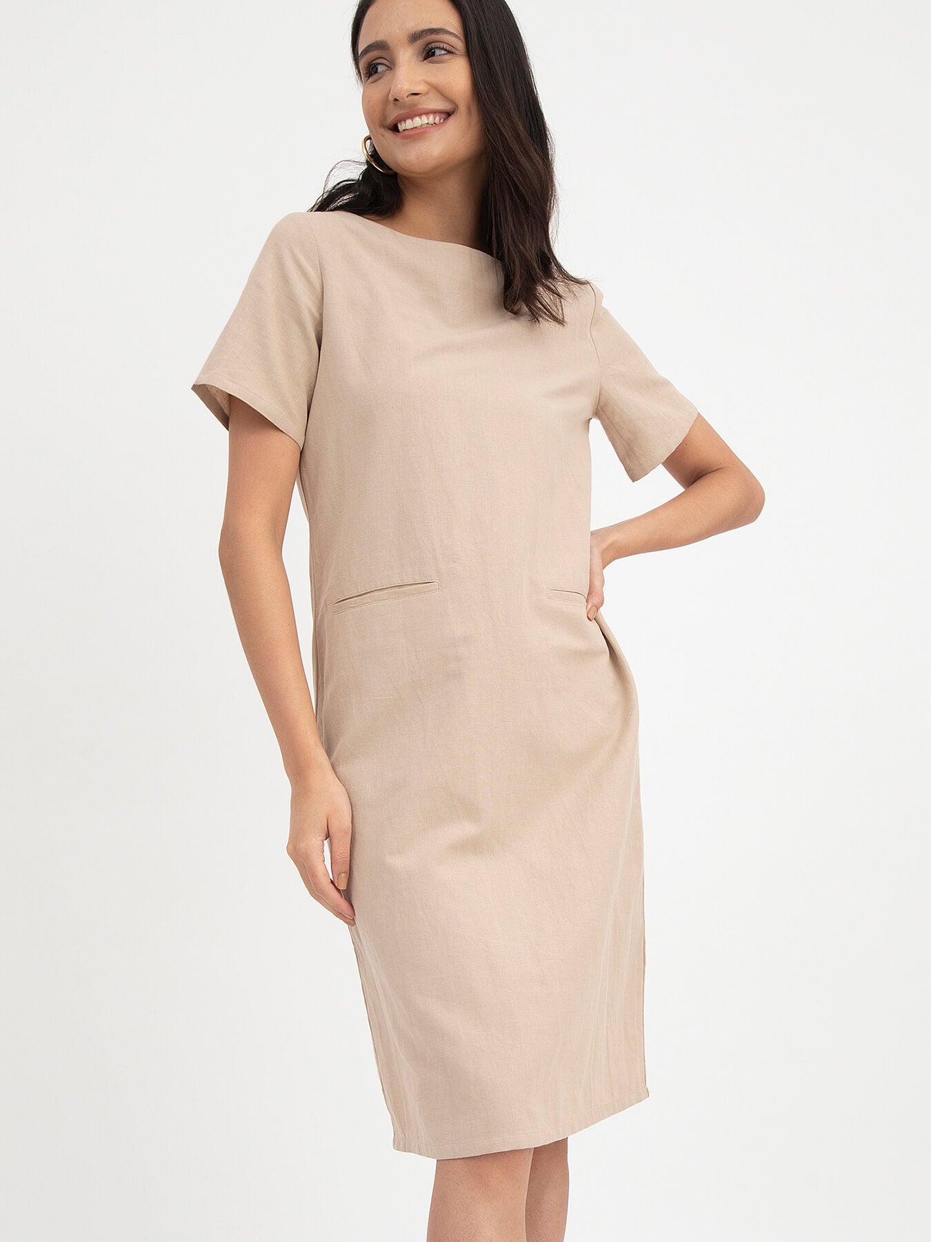 Linen Boat Neck Dress - Beige