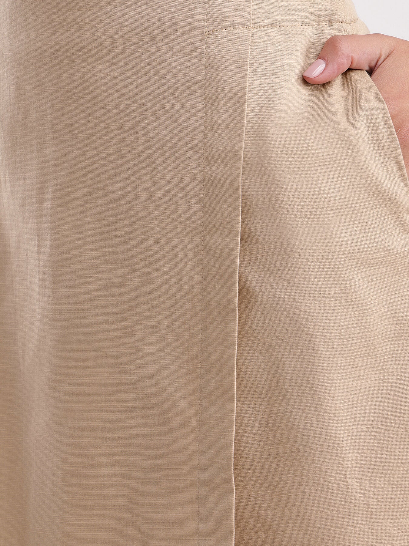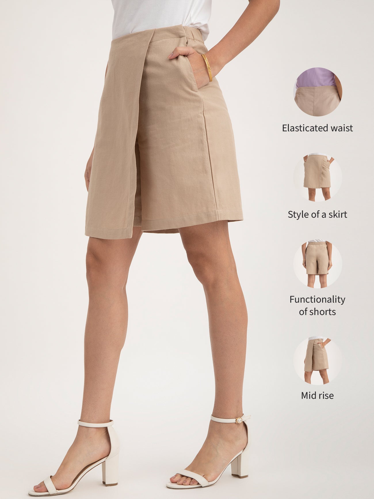 This beige A-line skort has a mid-rise waist and front overlap panel. Made from Linen, this formal skort is soft and comfortable to wear.
