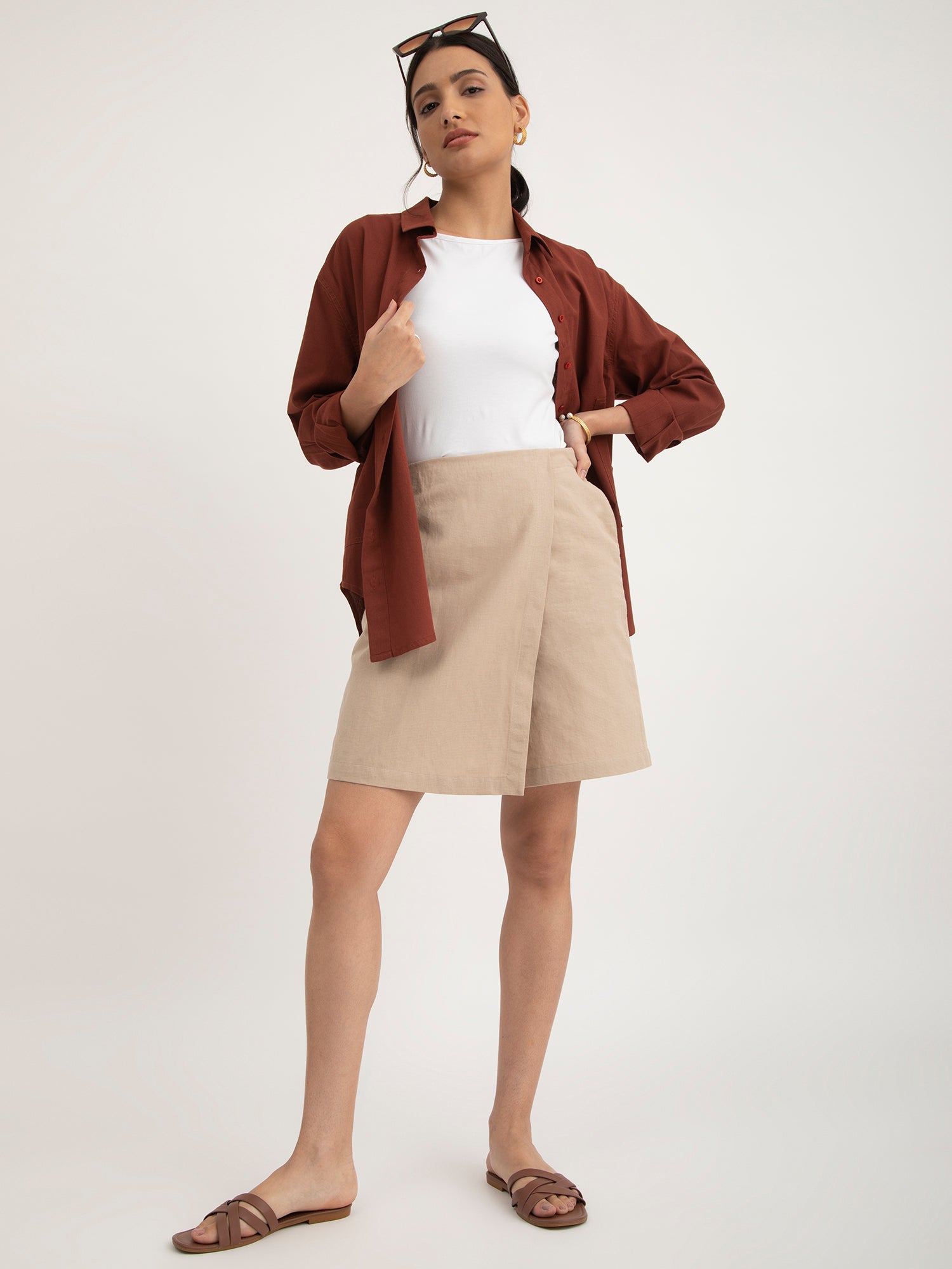 Linen Front Overlap Panel Skort - Beige