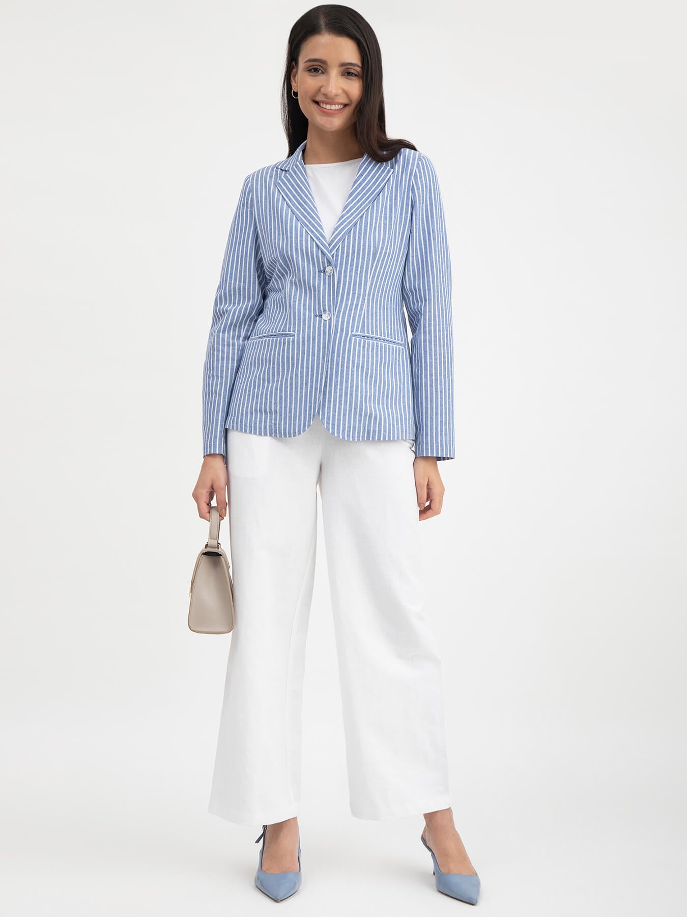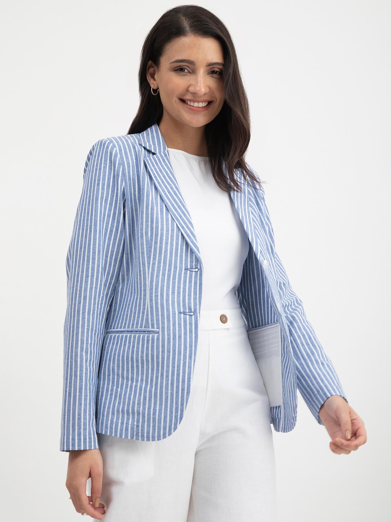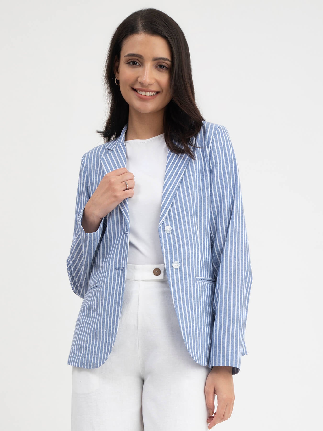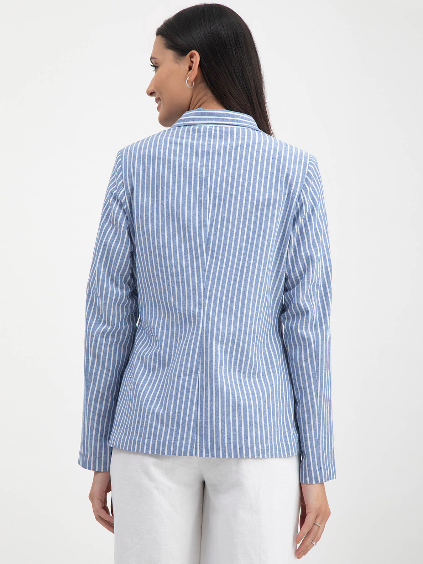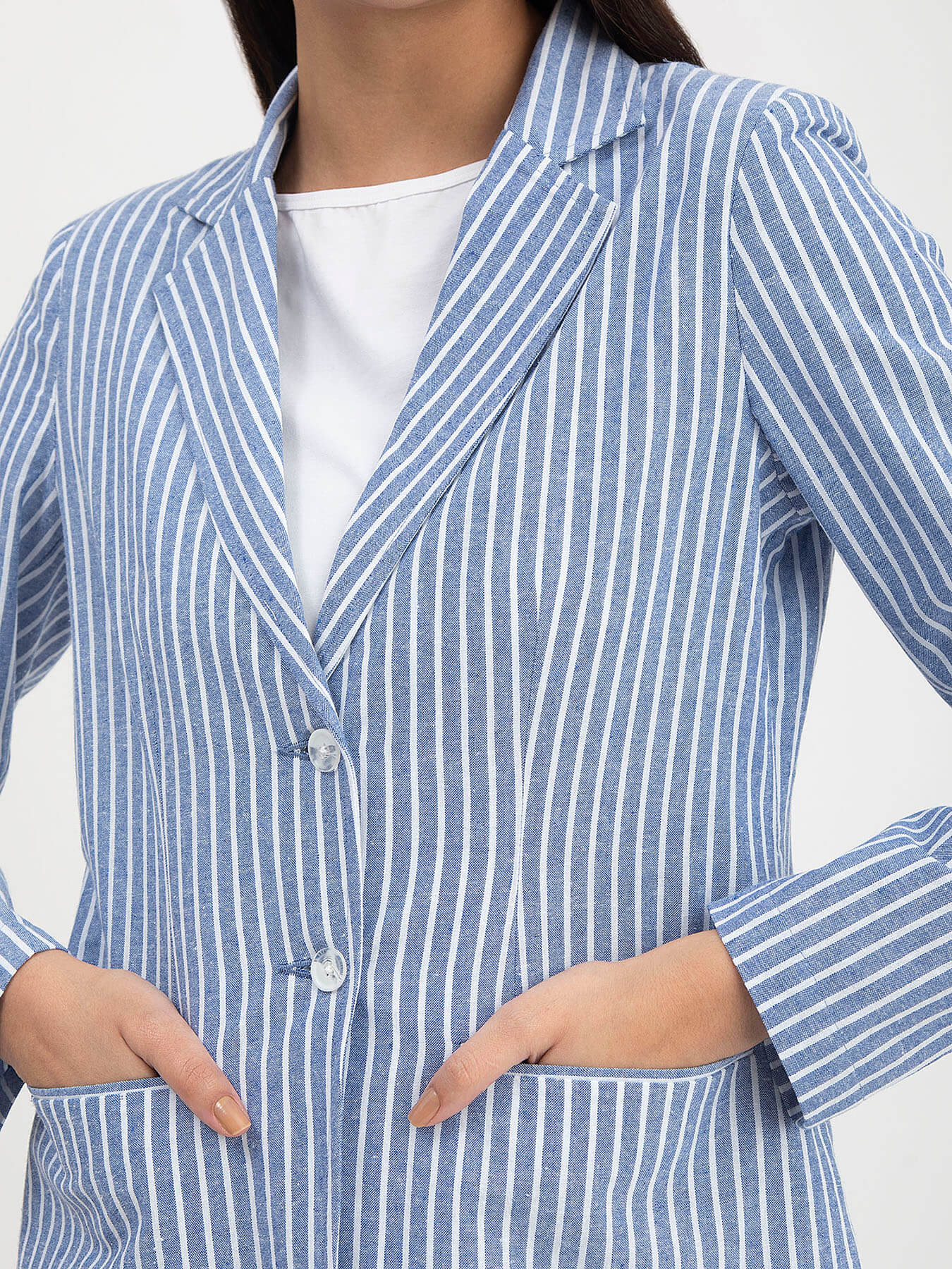 This blue single breasted blazer has a lapel collar and long sleeves. Made from Cotton Linen, it is soft and comfortable to wear.