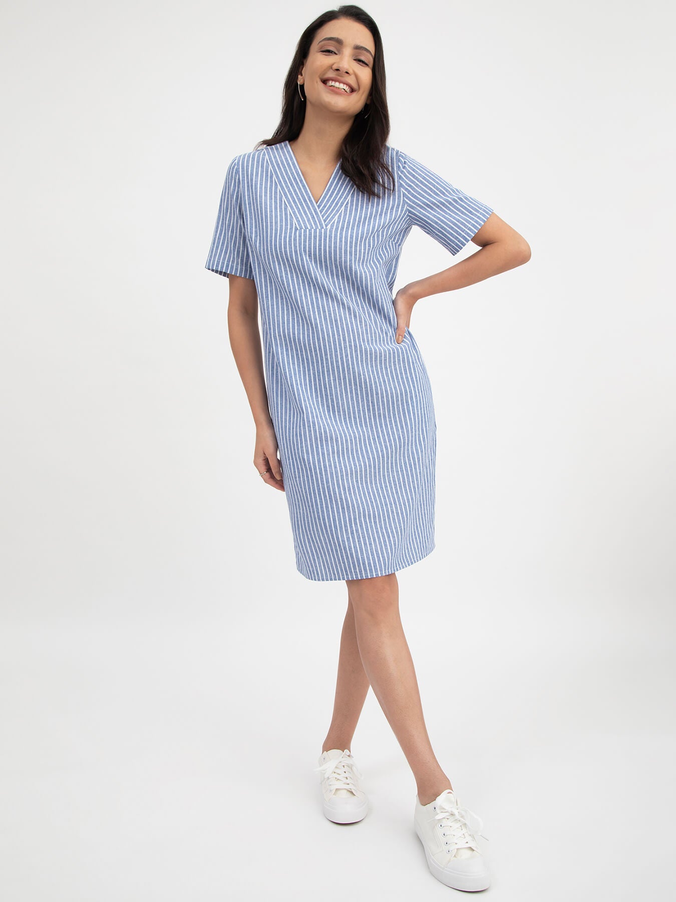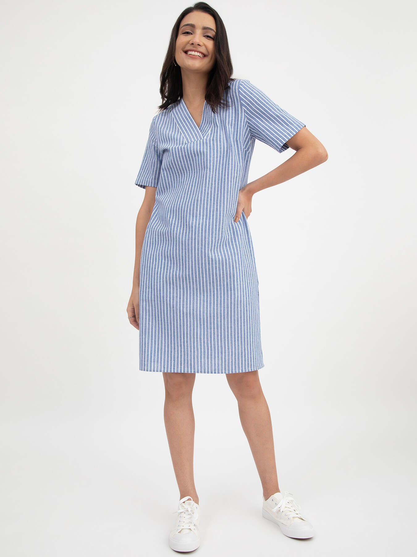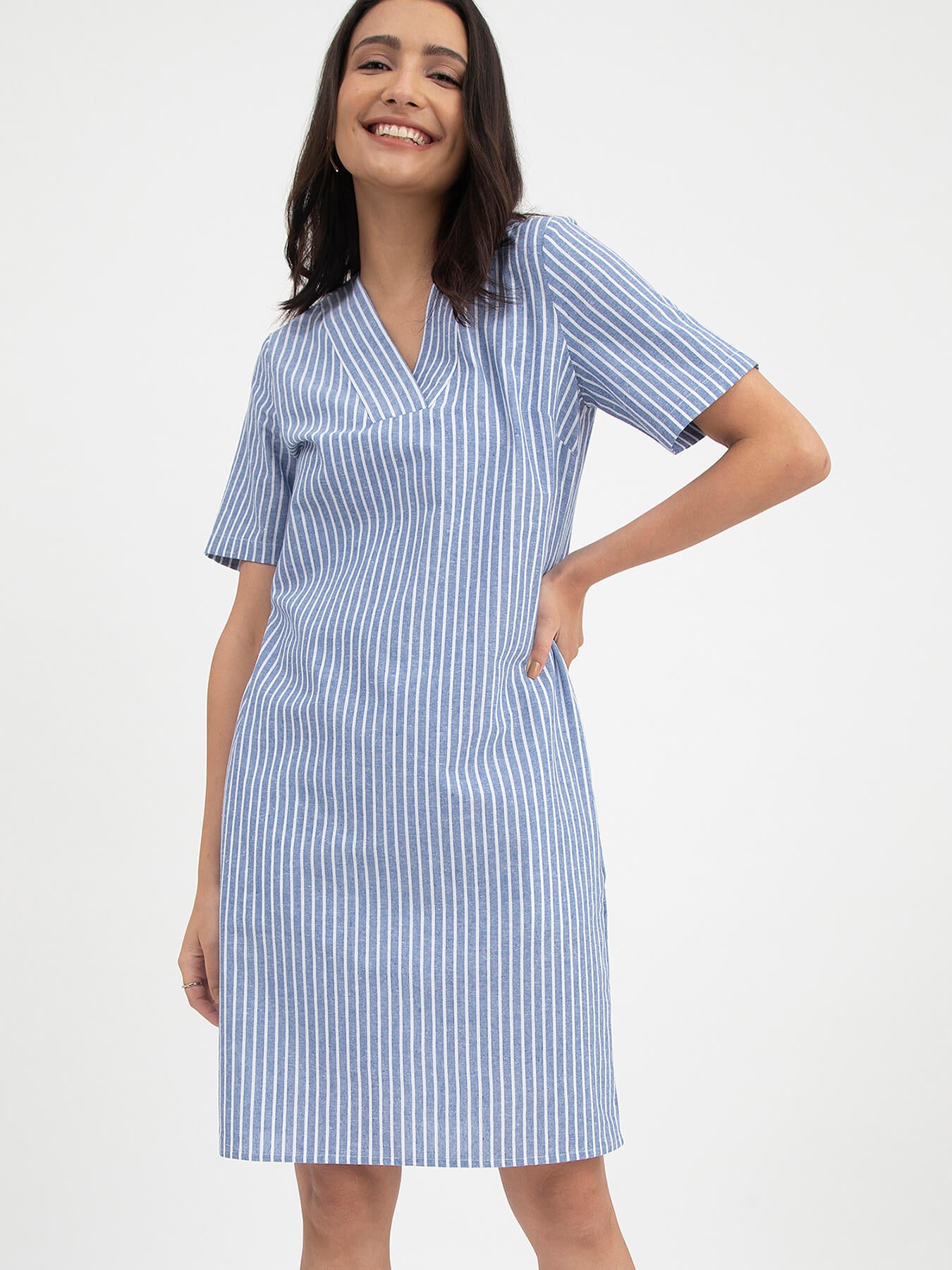 This white and blue striped boxy dress has a V-neck and short sleeves.