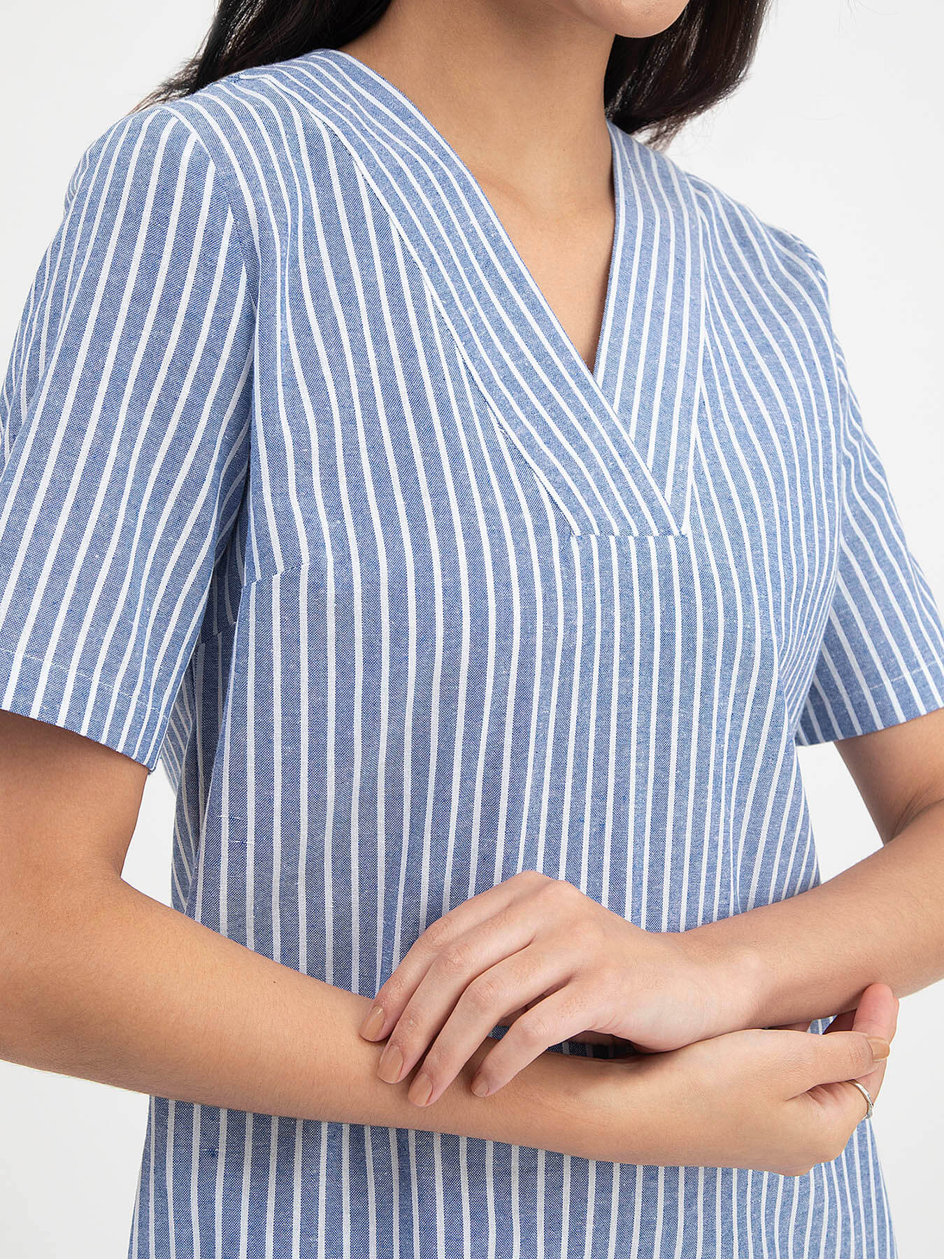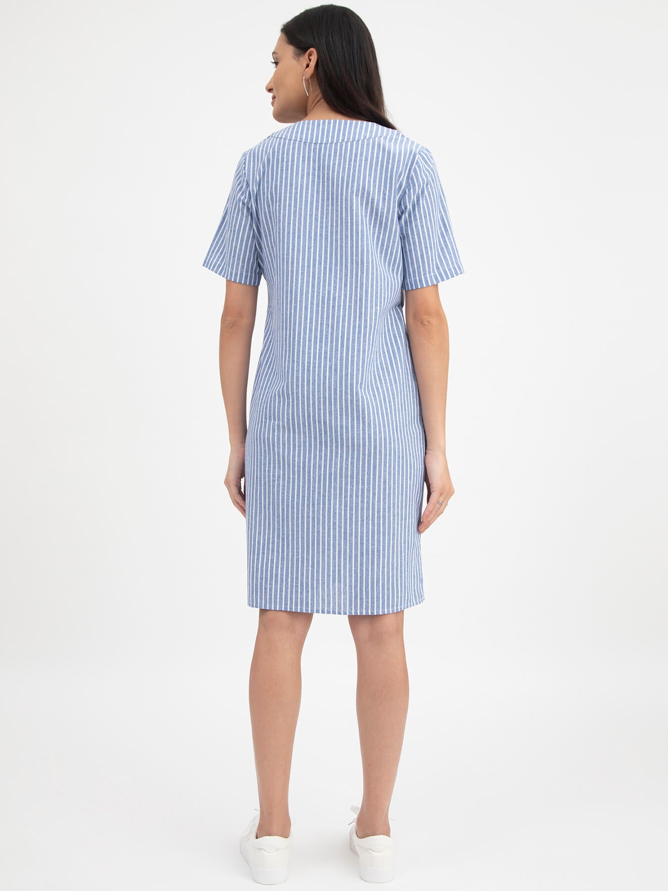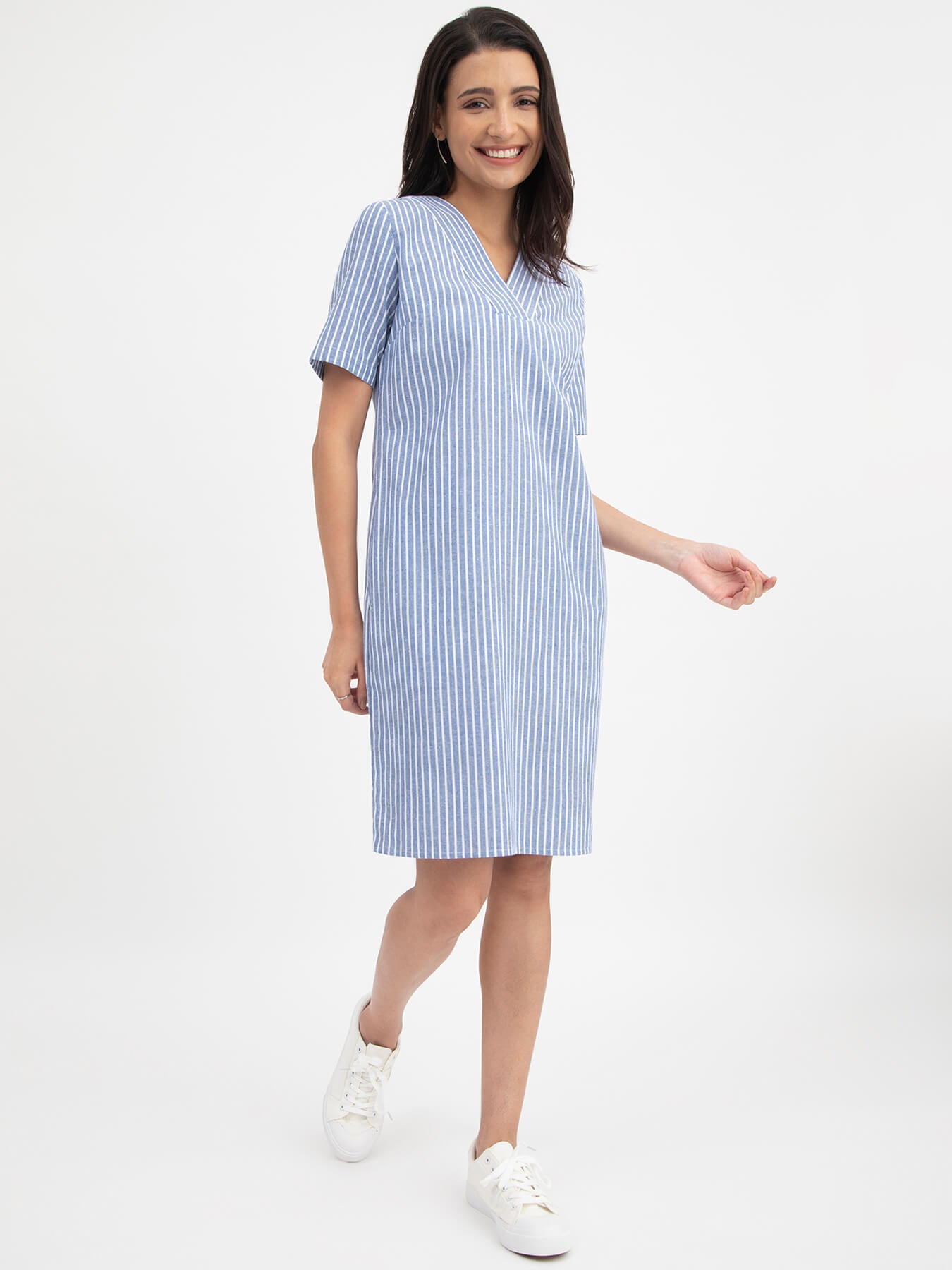 This white and blue striped boxy dress has a V-neck and short sleeves.