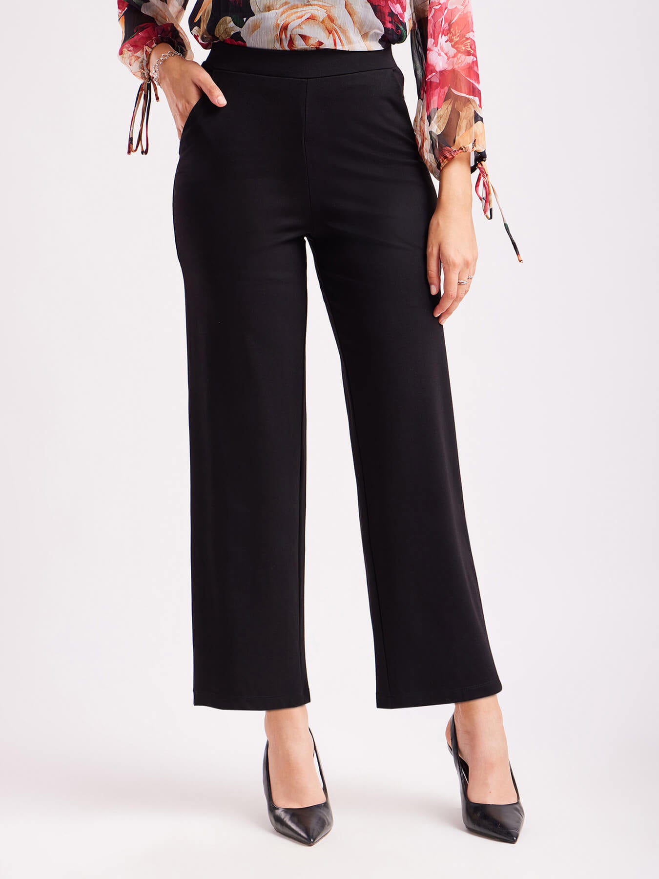 These black wide leg LivIn Air pants have ankle length and a high rise waist. These pants are stretchable, slip-on and don't need a closure.