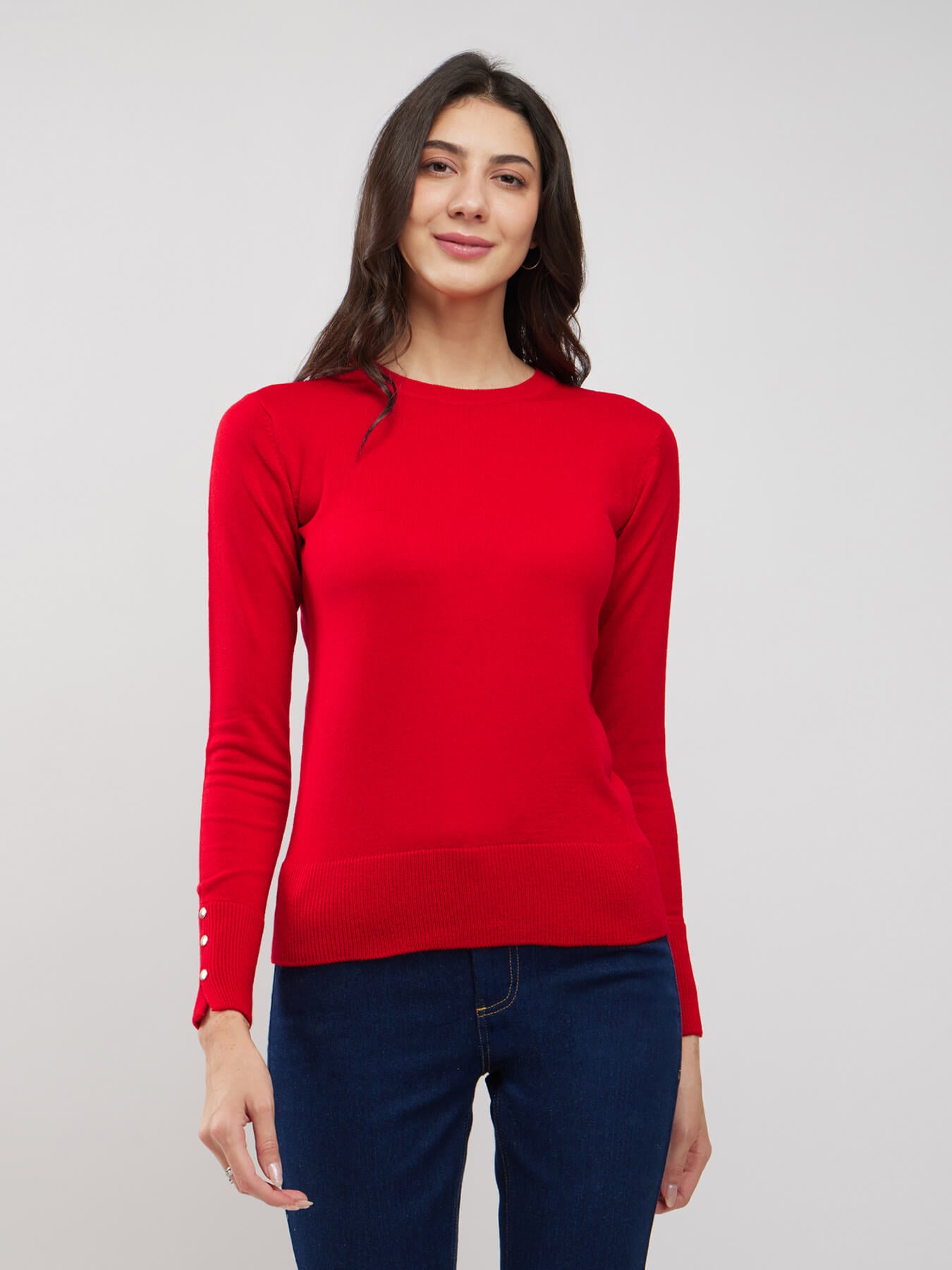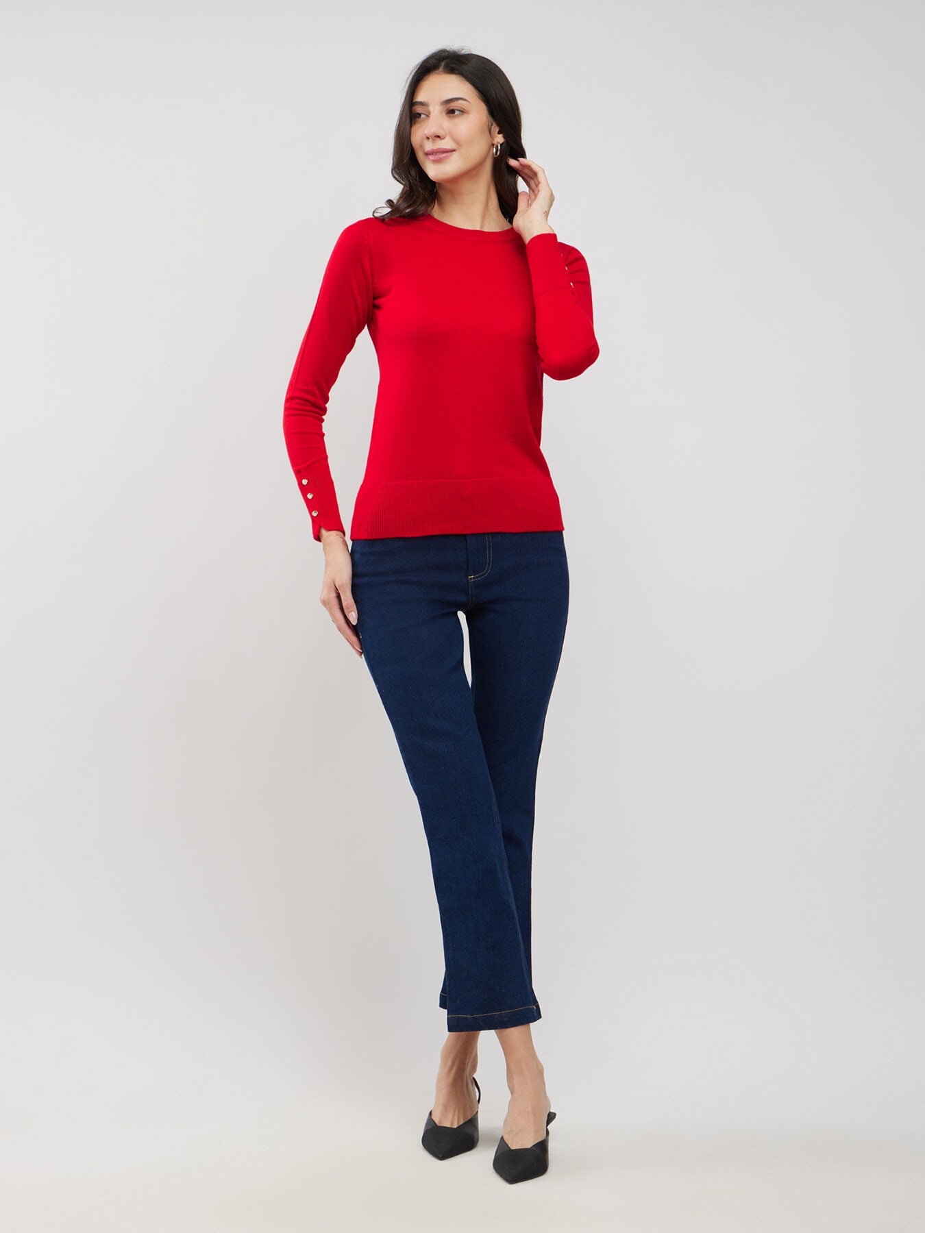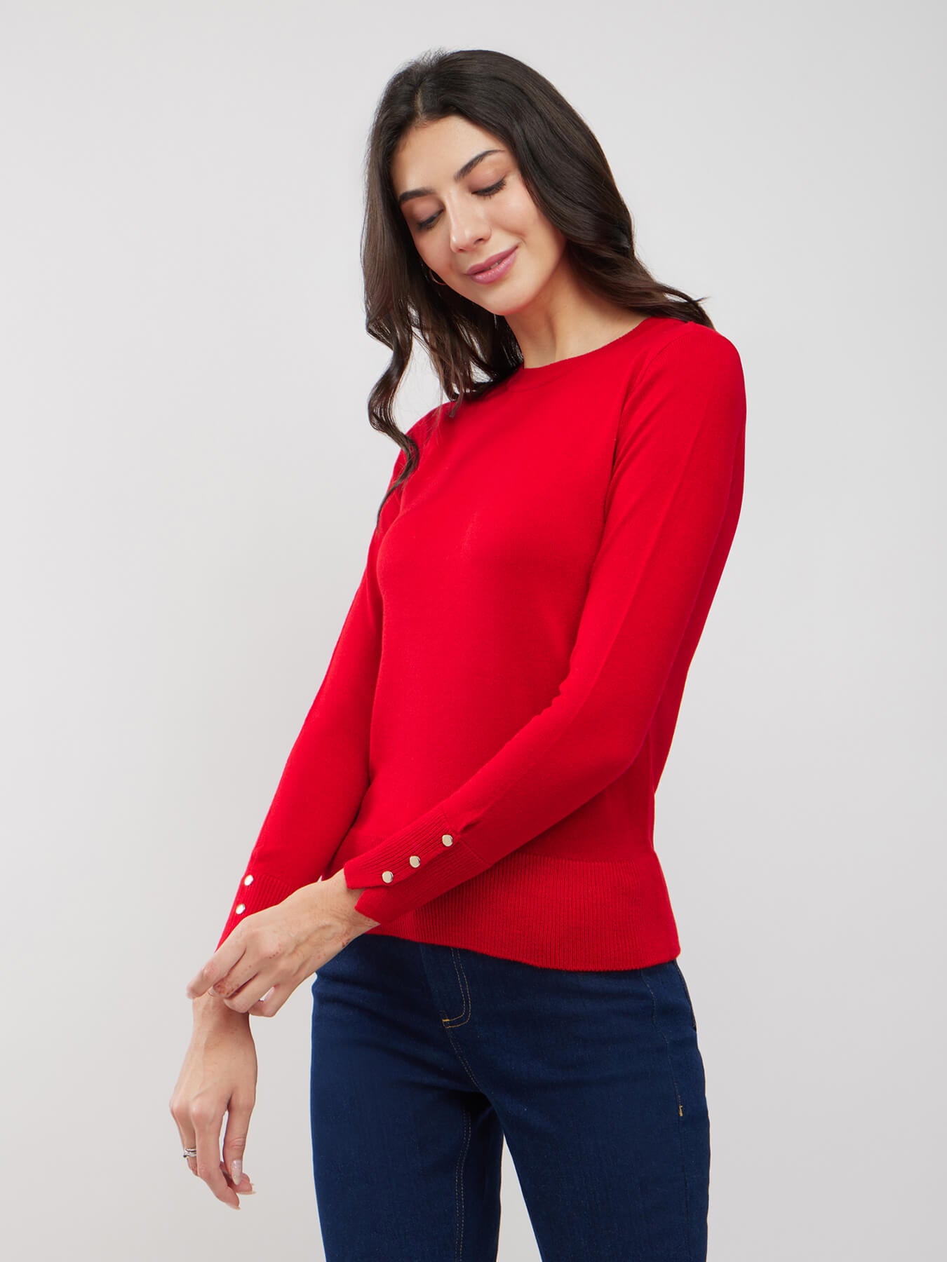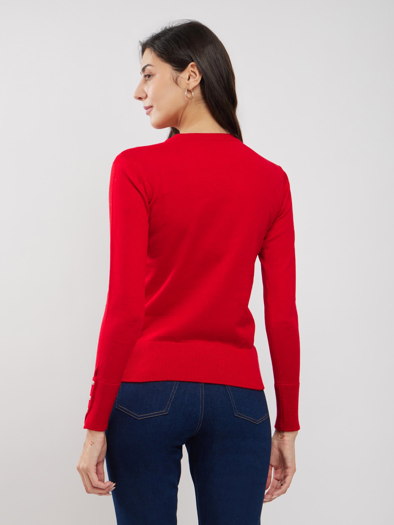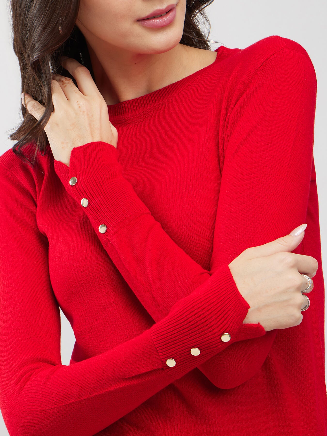 LivSoft Round Neck Buttoned Sleeve Sweater - Red