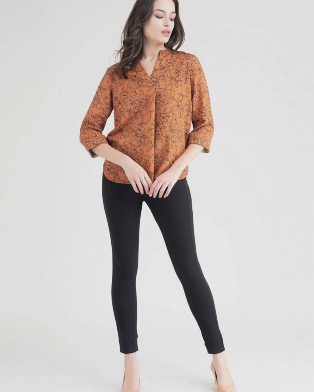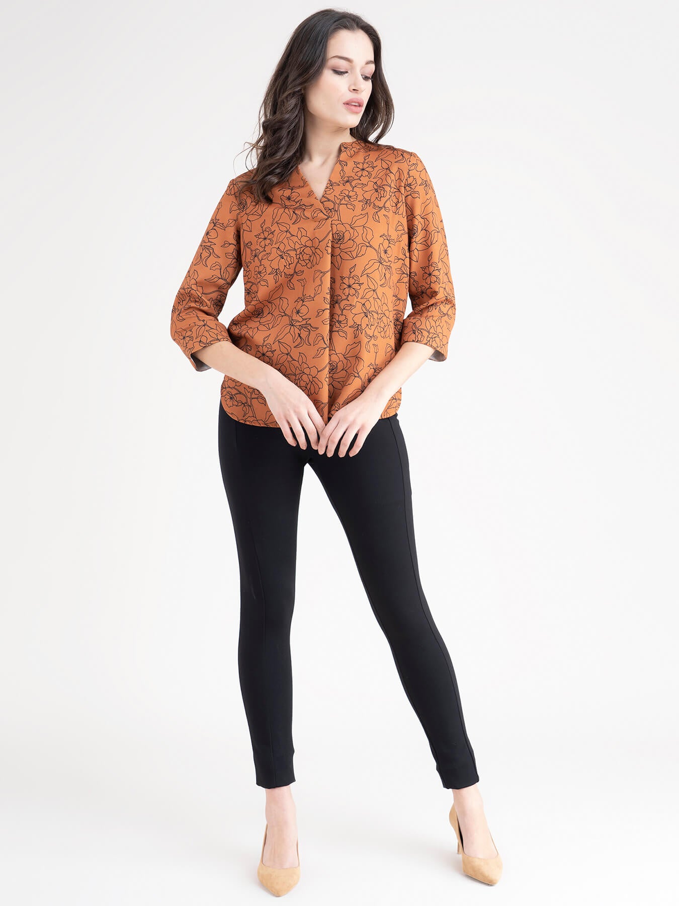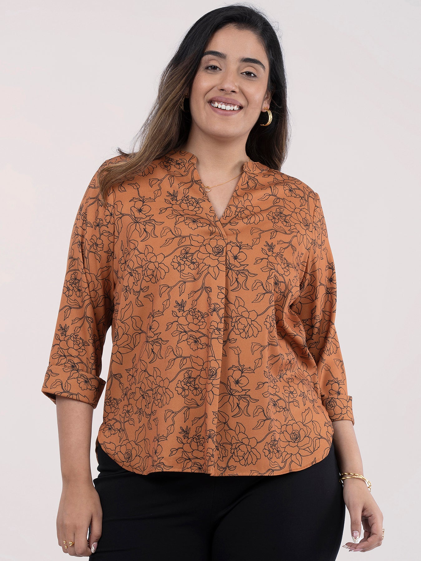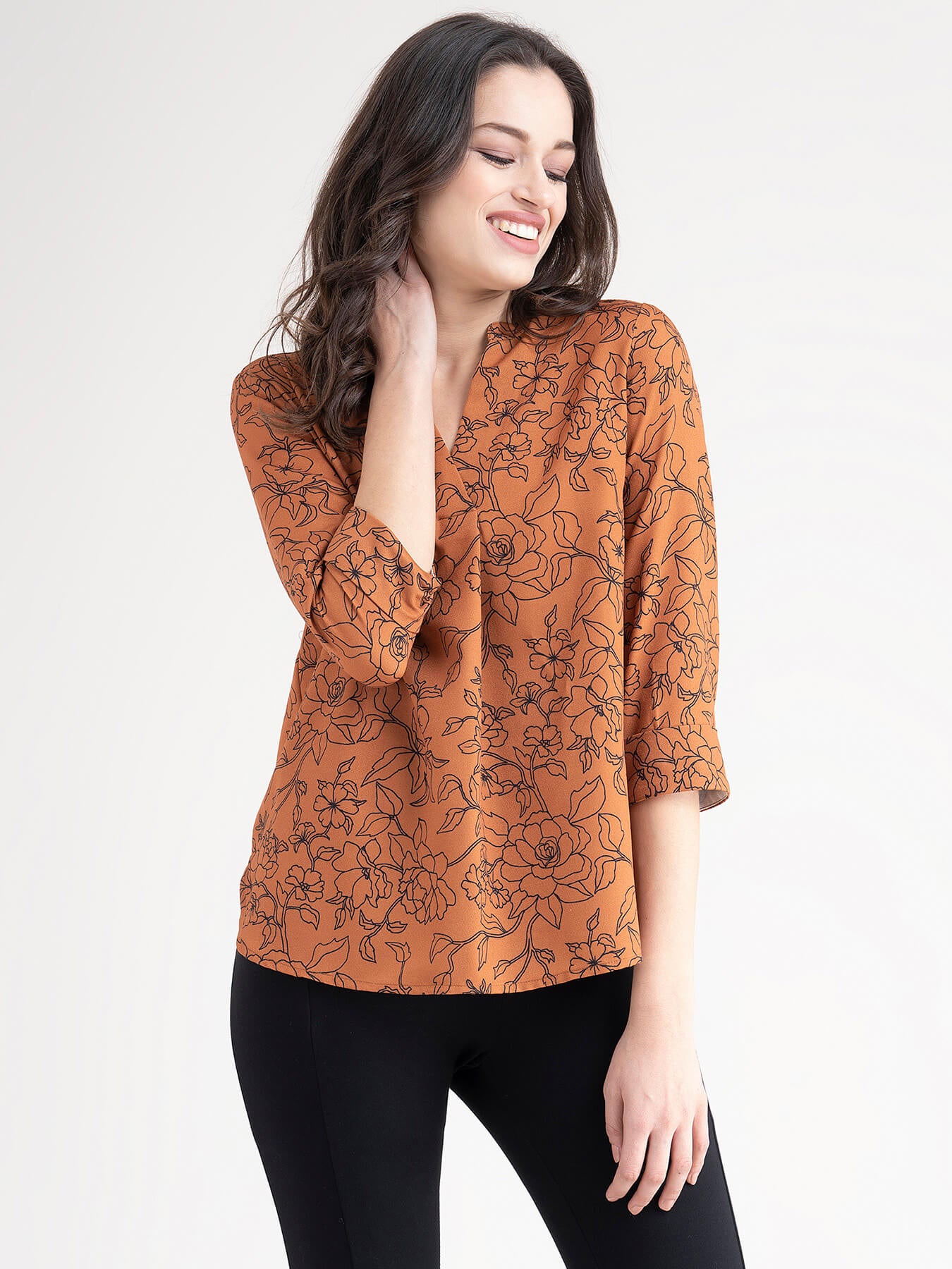 Mandarin V Neck Floral Top - Rust And Black