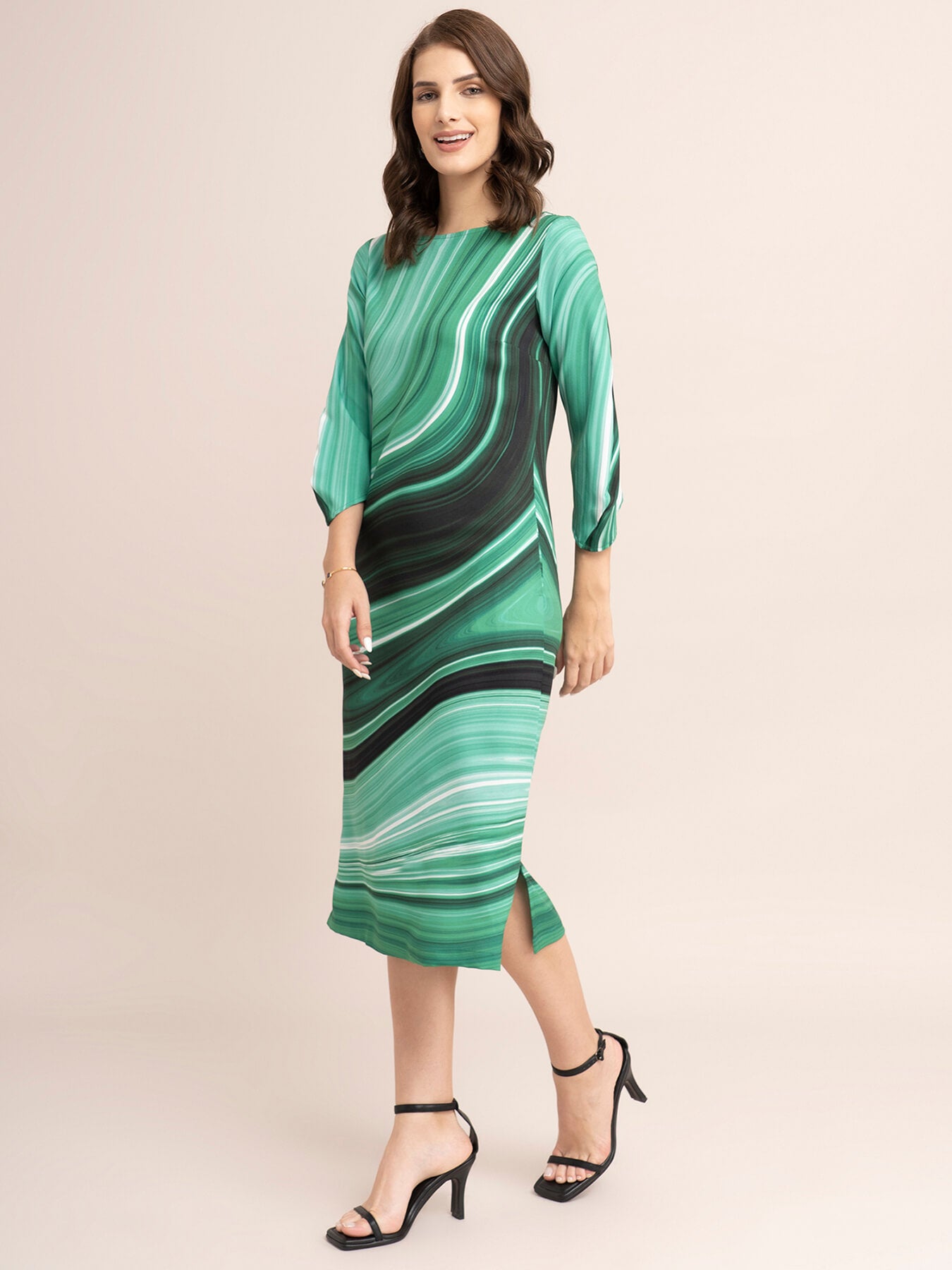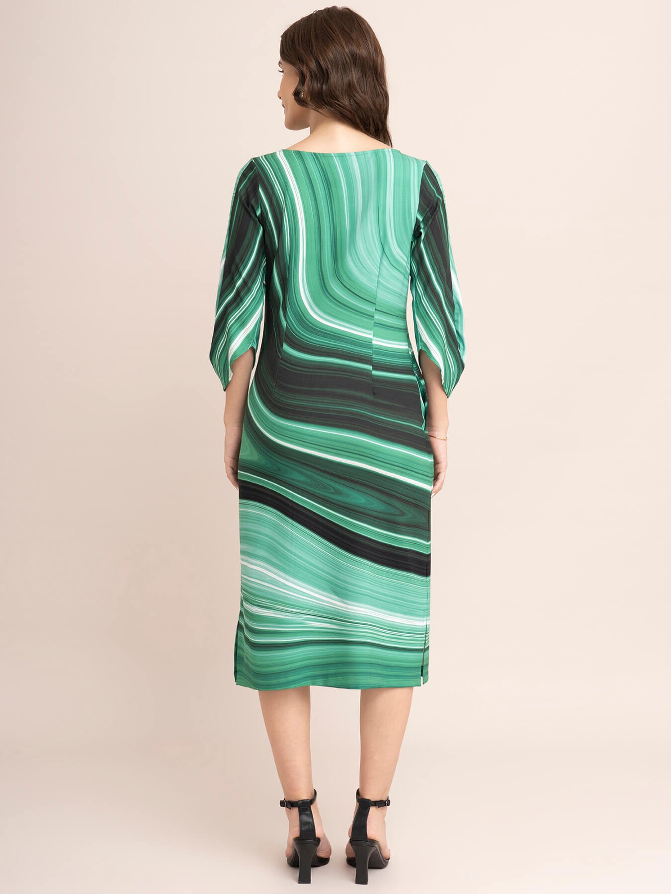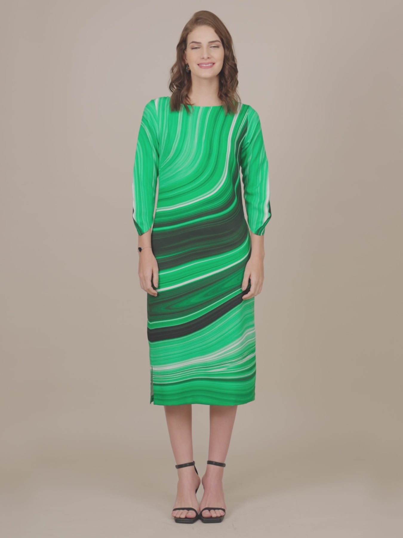 This green shift dress has a boat neck, marble print and three-quarter sleeves. Made from Polyester Moss Lycra, it is soft and comfortable to wear.